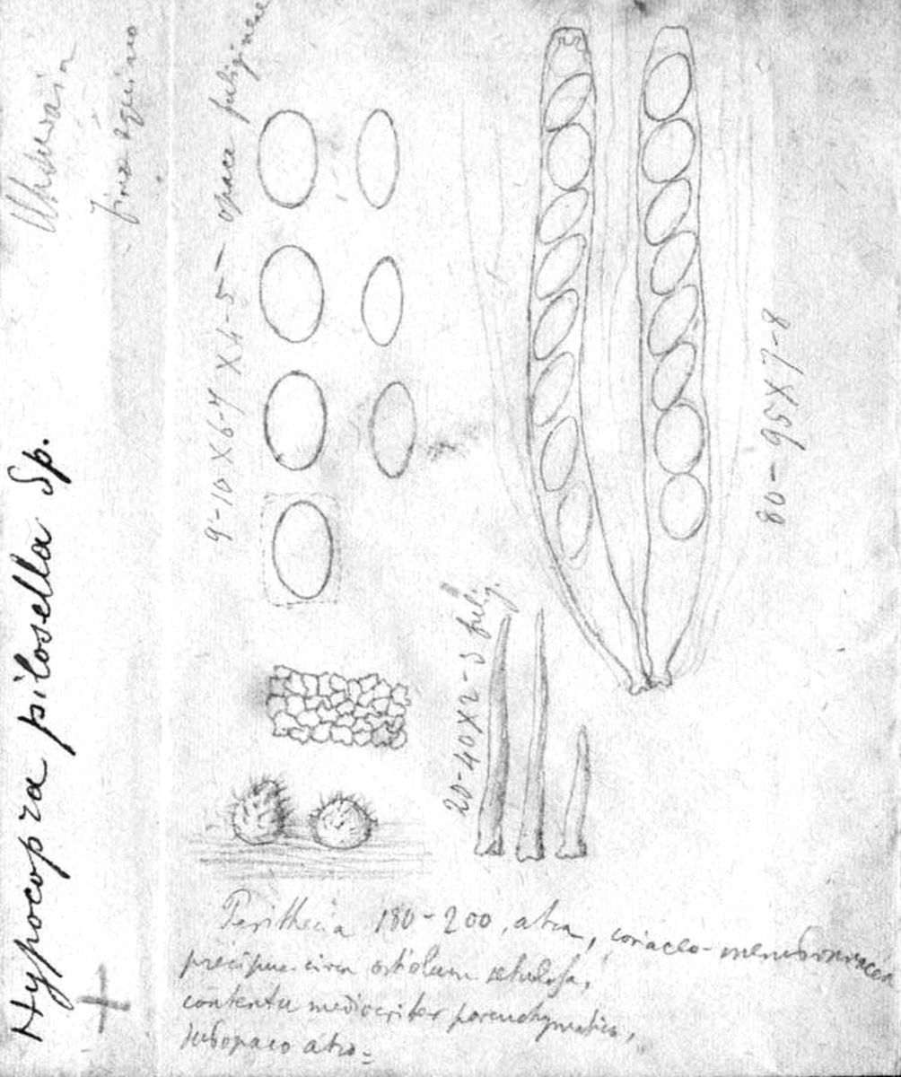 Perithecien dunkelbran-schwarz, kugel-birnenförmig.