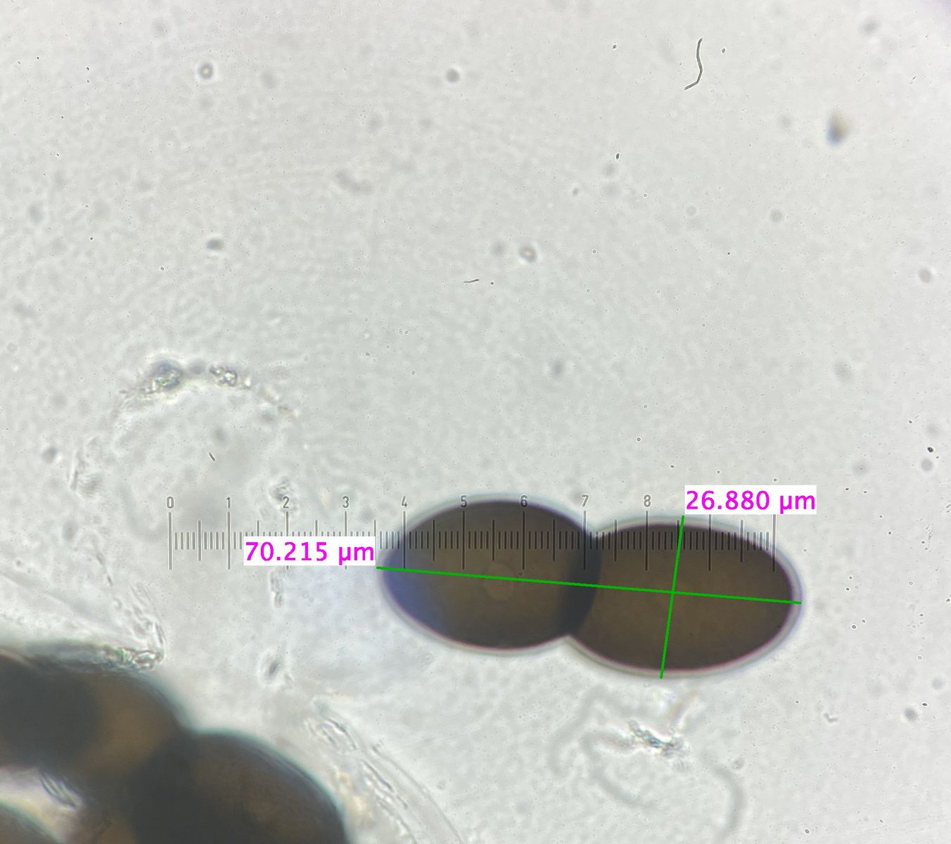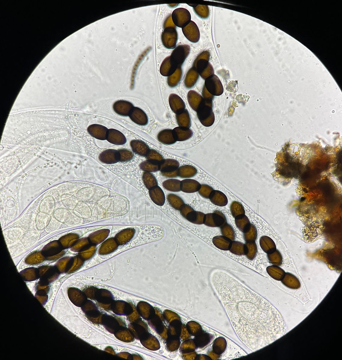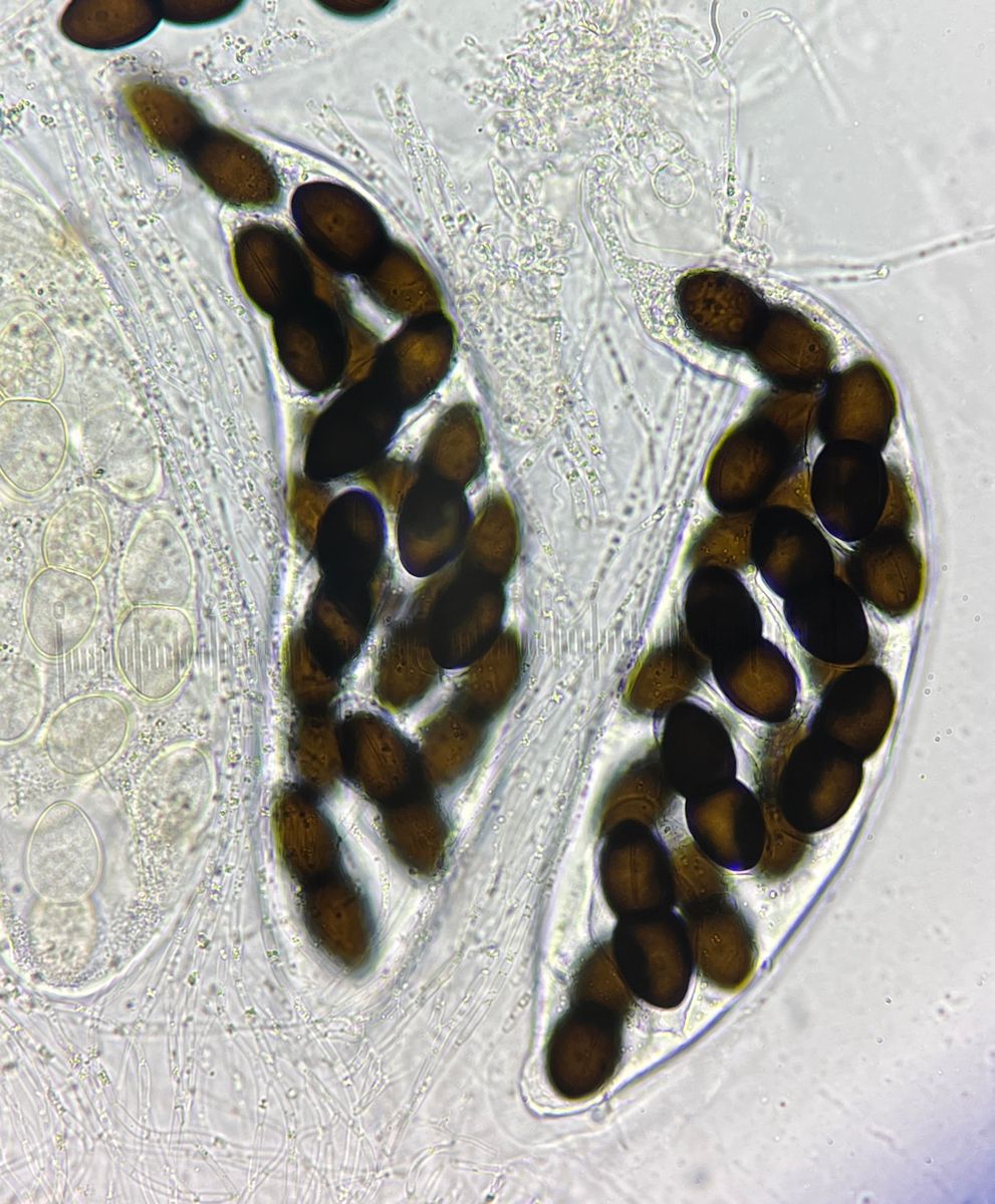 Komischerweise ist in diesem Dung auch eine sehr ähnliche Delitschia, aber mit 16 Sporen pro Ascus, 52-58µm x 22-23µm, mit deutlich sichtbarer Keimspalte. Die Perthecien sind sehr eingesenkt und recht groß (bis 800µm). Es gibt eine 16-zellige Delitschia mit diesen Maßen, D. polyspora, die vielleicht passen könnte.