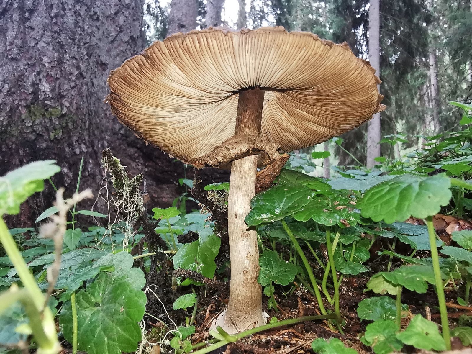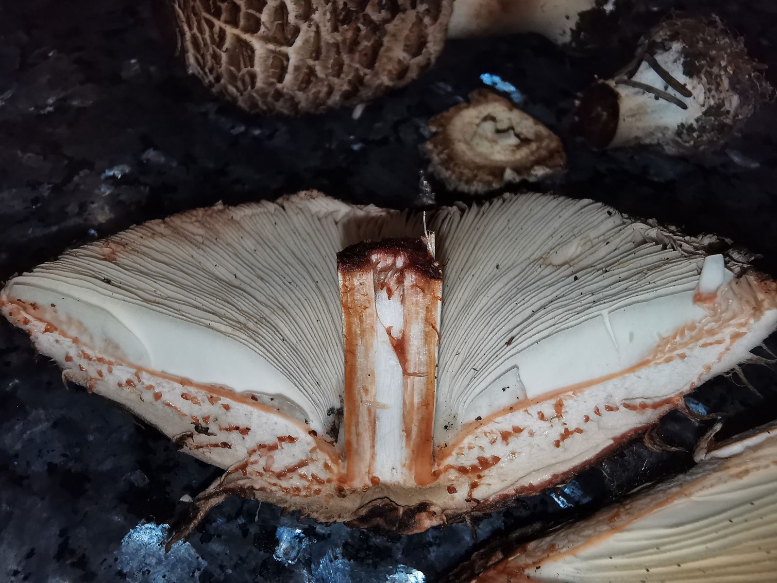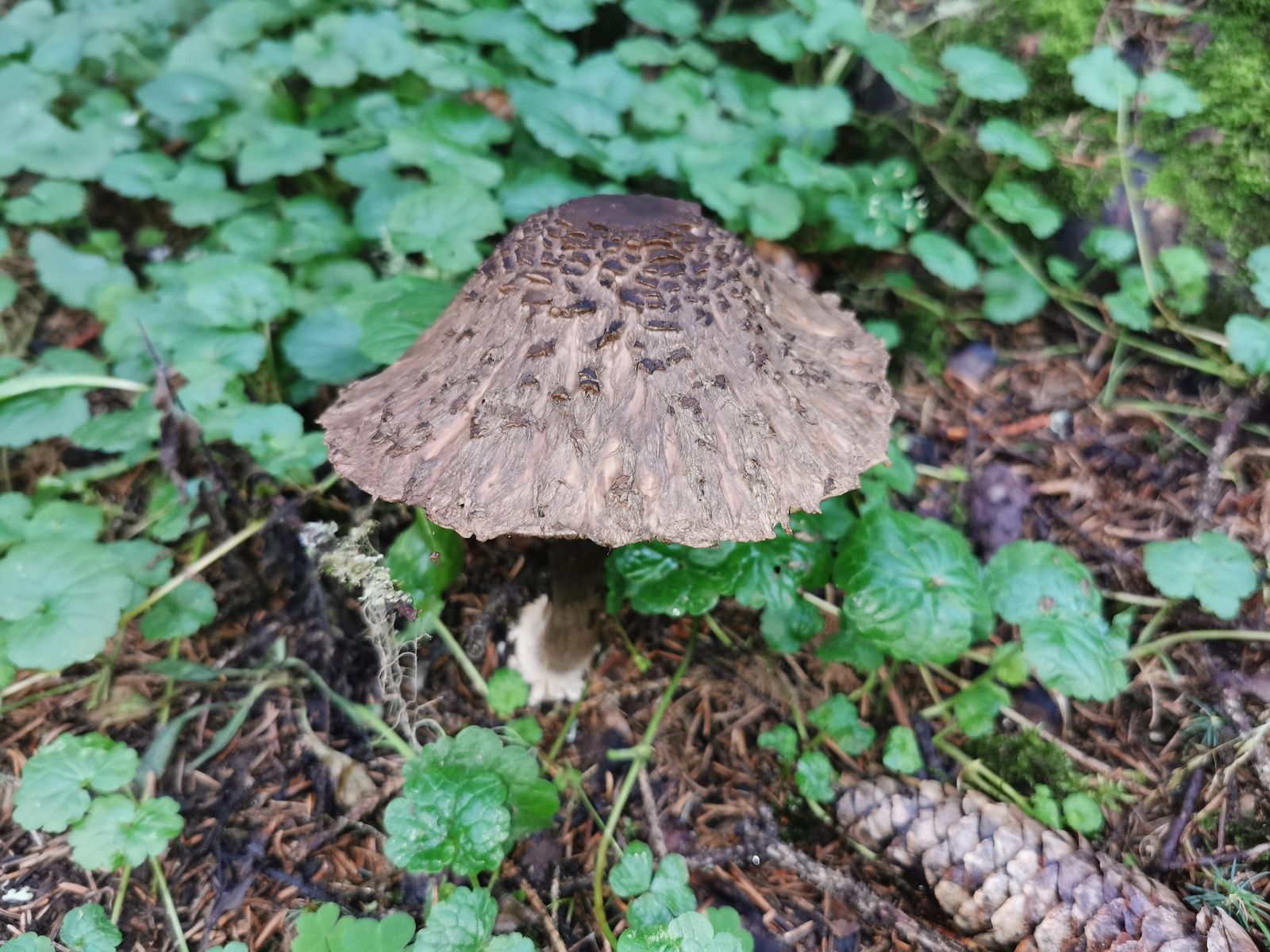 Auf meiner heutigen Runde habe ich mich gefreut, da ich meiner Ansicht nach endlich mal Safranschirmlinge - C. olivieri gefunden habe. Den Parasol oder auch Safranschirmlinge habe ich bei uns bisher noch nicht gefunden, aber ich gehe bei uns mittlerweile auch in andere Wälder, in denen ich früher nicht unterwegs war. Gefunden habe ich sie auf ca. 1700m zwischen zwei Fichten. Etwas ausserhalb von unserem Tal kenne ich eine Stelle, wo es öfters mal Parasole hat, die ich auch schon für Speisezwecke gesammelt habe. Den Safranschirmling bisher noch nicht, deshalb würde ich hier gerne nochmal nachfragen, da es dort ja theoretisch mit dem Garten-Riesenschirmling - C. brunneum einen Verwechslungskandidaten gäbe, der bei einigen wohl Magen-Darm-Störungen auslösen soll.