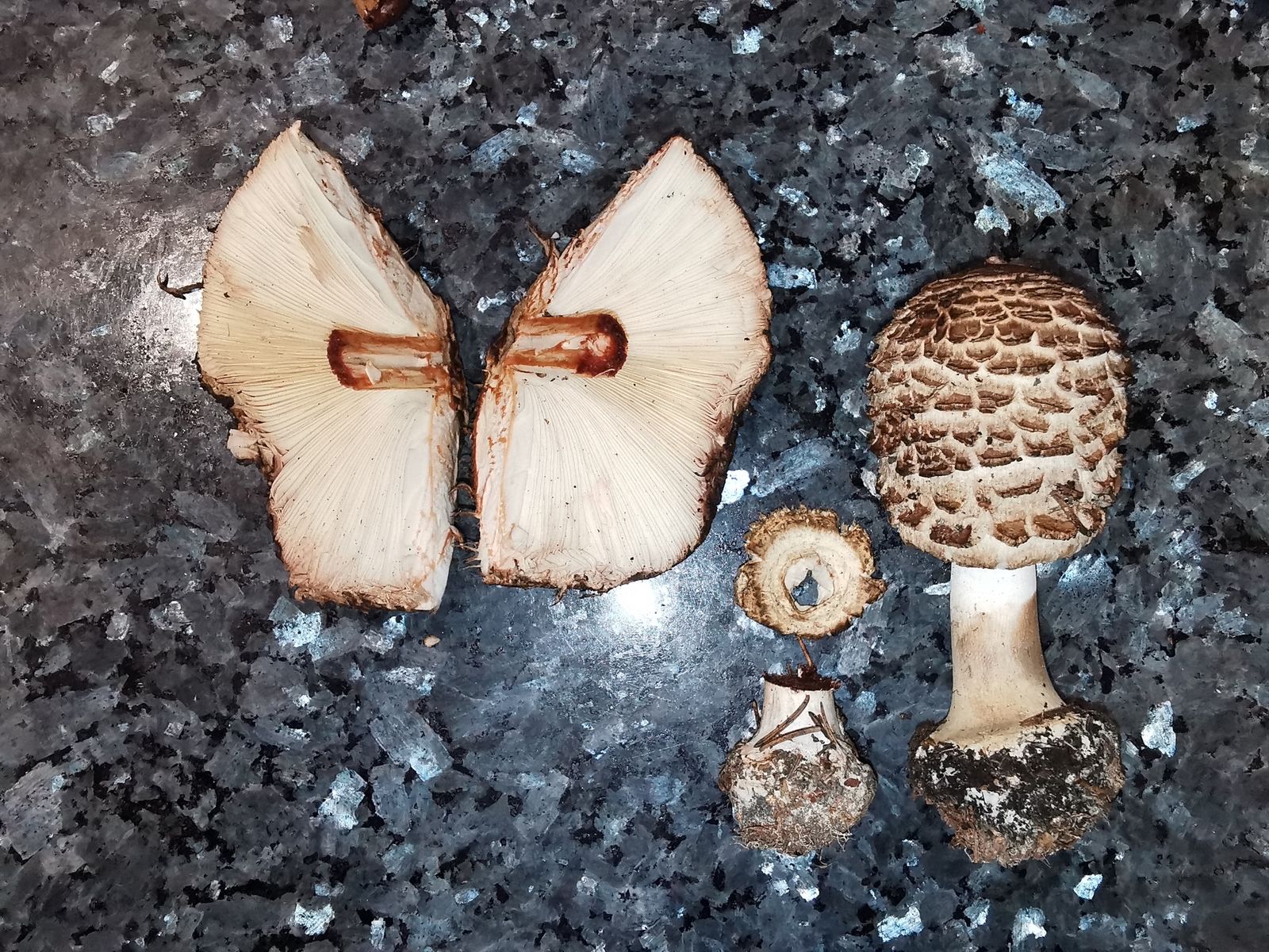 Auf meiner heutigen Runde habe ich mich gefreut, da ich meiner Ansicht nach endlich mal Safranschirmlinge - C. olivieri gefunden habe. Den Parasol oder auch Safranschirmlinge habe ich bei uns bisher noch nicht gefunden, aber ich gehe bei uns mittlerweile auch in andere Wälder, in denen ich früher nicht unterwegs war. Gefunden habe ich sie auf ca. 1700m zwischen zwei Fichten. Etwas ausserhalb von unserem Tal kenne ich eine Stelle, wo es öfters mal Parasole hat, die ich auch schon für Speisezwecke gesammelt habe. Den Safranschirmling bisher noch nicht, deshalb würde ich hier gerne nochmal nachfragen, da es dort ja theoretisch mit dem Garten-Riesenschirmling - C. brunneum einen Verwechslungskandidaten gäbe, der bei einigen wohl Magen-Darm-Störungen auslösen soll.