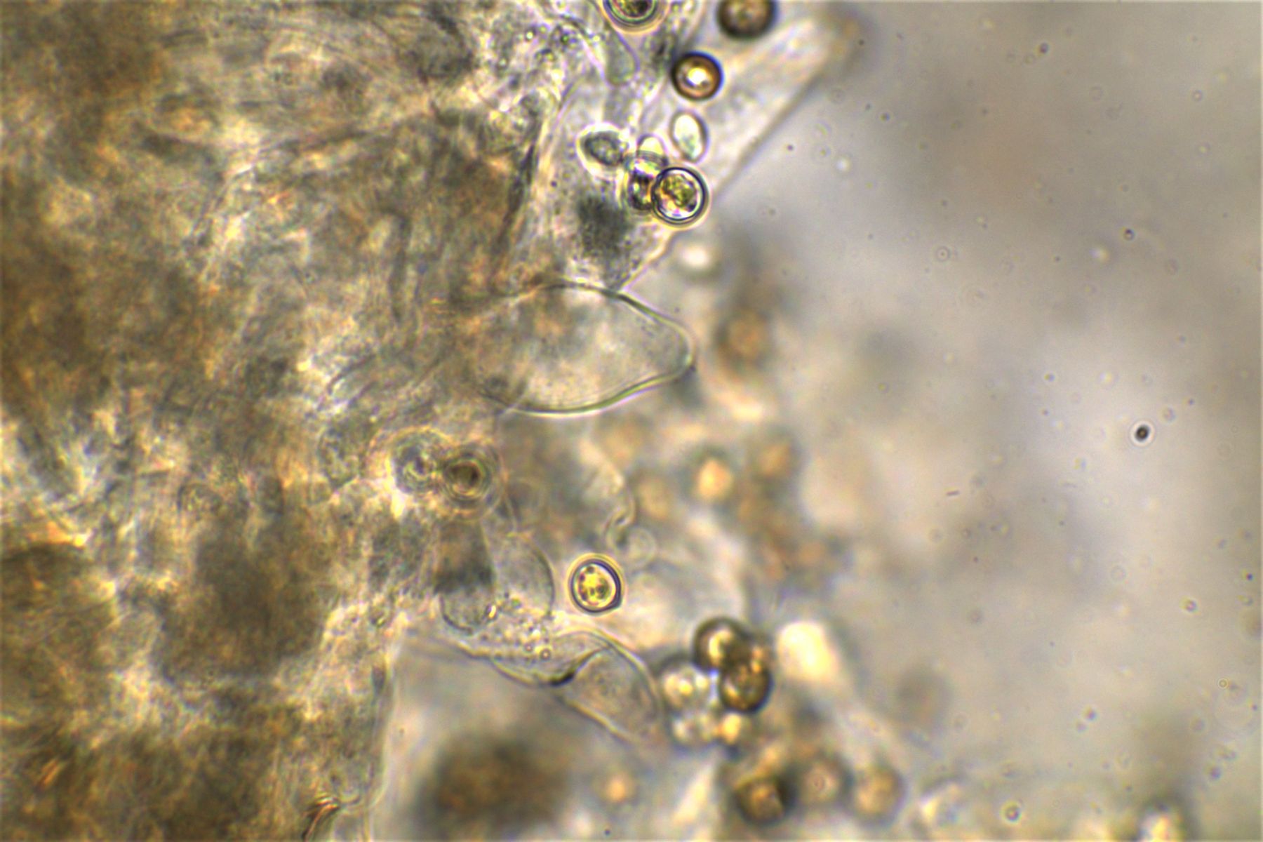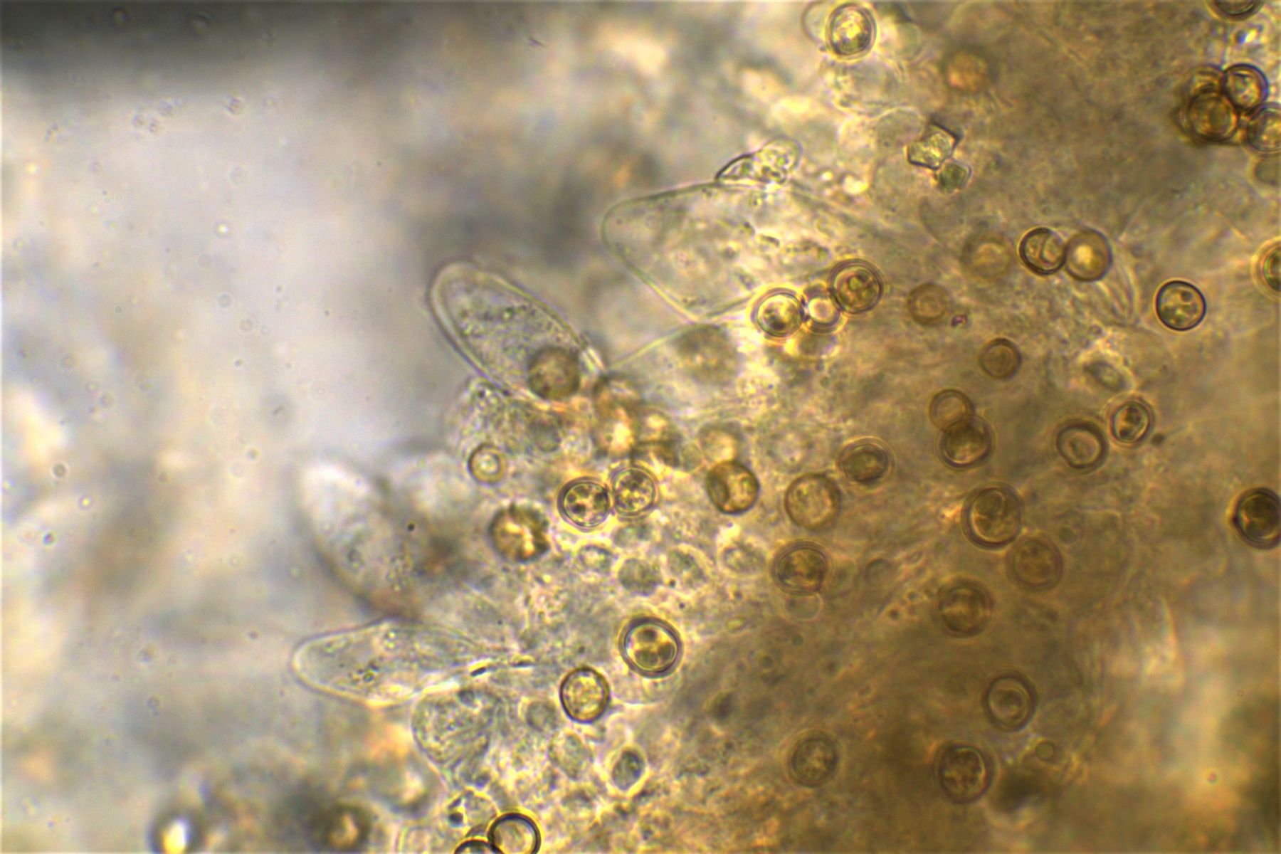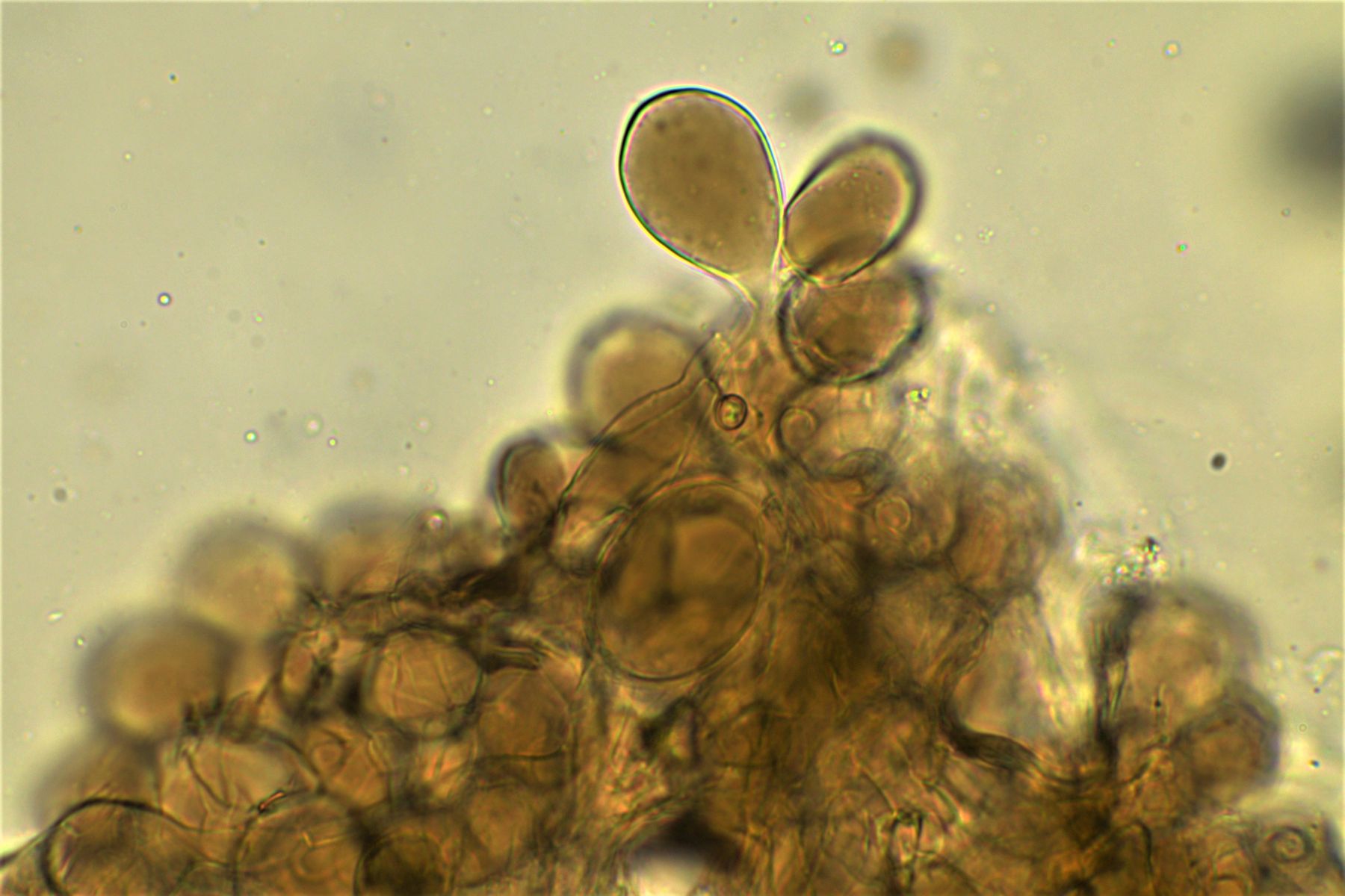 rundliche bis Birnenförmige bräunliche Zellen, manche Spitzen sahen aus wie Zitronen,