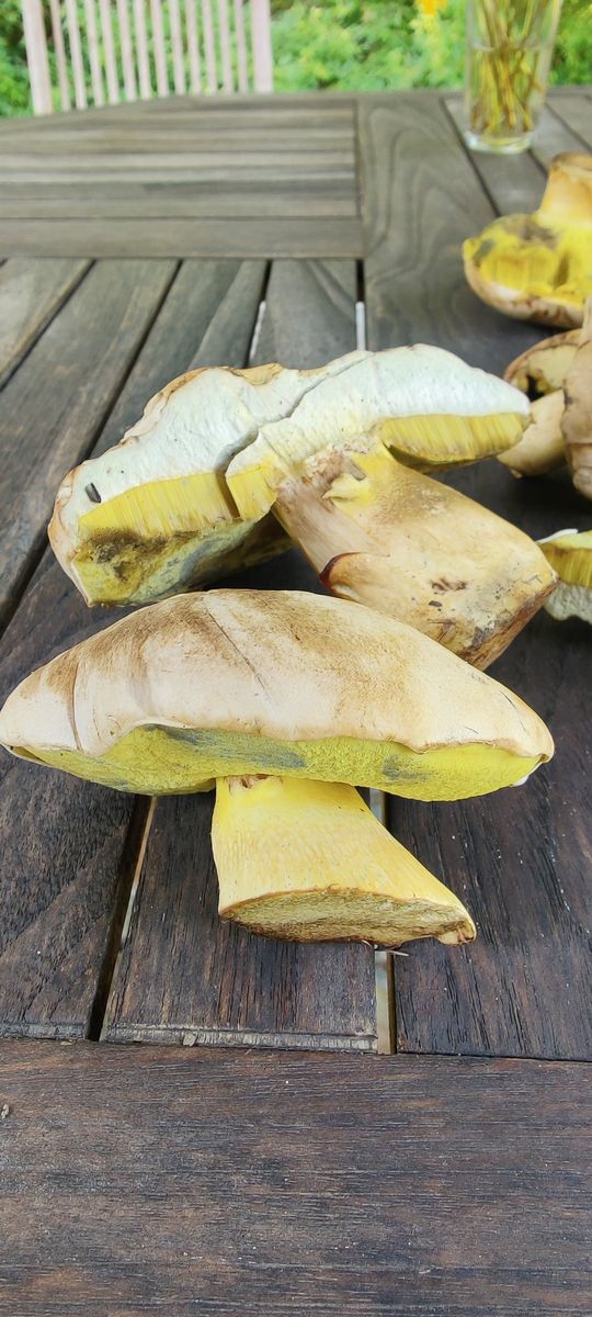 Ich hab heute diese steinpilzartigen Pilze unter Eichen gefunden. Sehen sehr nach Steinpilz aus, aber beim anschneiden des Stiels färbt er sich leicht blau. Auch die Röhren ganz leicht an den Druckstellen. Es ist aber keine orange oder rote Färbung der Röhren oder am stiel zu erkennen.