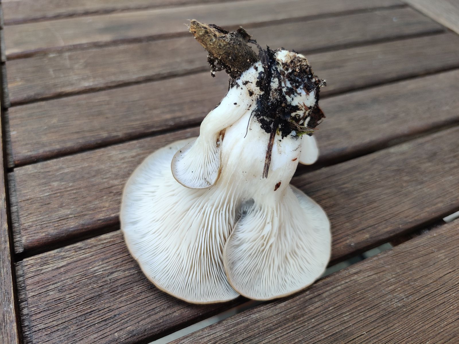 Folgender Fund sieht für mich wie typische Lungenseitlinge bzw. Sommer-Austern aus. Aufgrund des kräftigen Wuchses und der etwas dunkleren Hutfarbe (die Exemplare waren dunkler und bräunlicher als auf den Fotos) vielleicht eher eine Sommer-Auster. Die versuche ich aber meist gar nicht zu trennen. Was mich nun verunsicherte ist das Vorkommen auf dem Erdboden. Einen dickeren Ast oder Stamm, an dem die Fruchtkörper wachsen, konnte ich nicht erkennen, habe aber auch nicht gegraben. Kleinere Ästchen, wie auch auf dem letzten Bild unten an den Fruchtkörper, waren vorhanden.