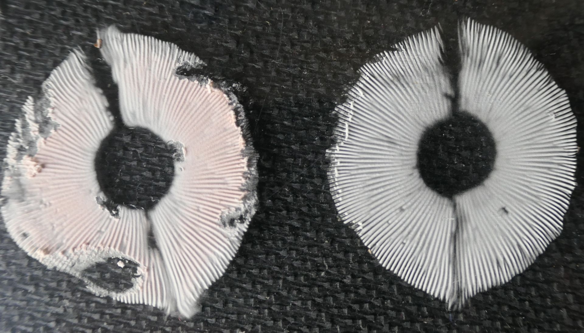 ich hatte ja einen Sporenabwurf erstellt, der weiß war. Danach habe ich den Hut wieder hingelegt und wollte ihn jetzt entsorgen. Dabei habe ich gesehen, dass ein weiterer Sporenabwurf entstanden ist; diesmal in Rosa.