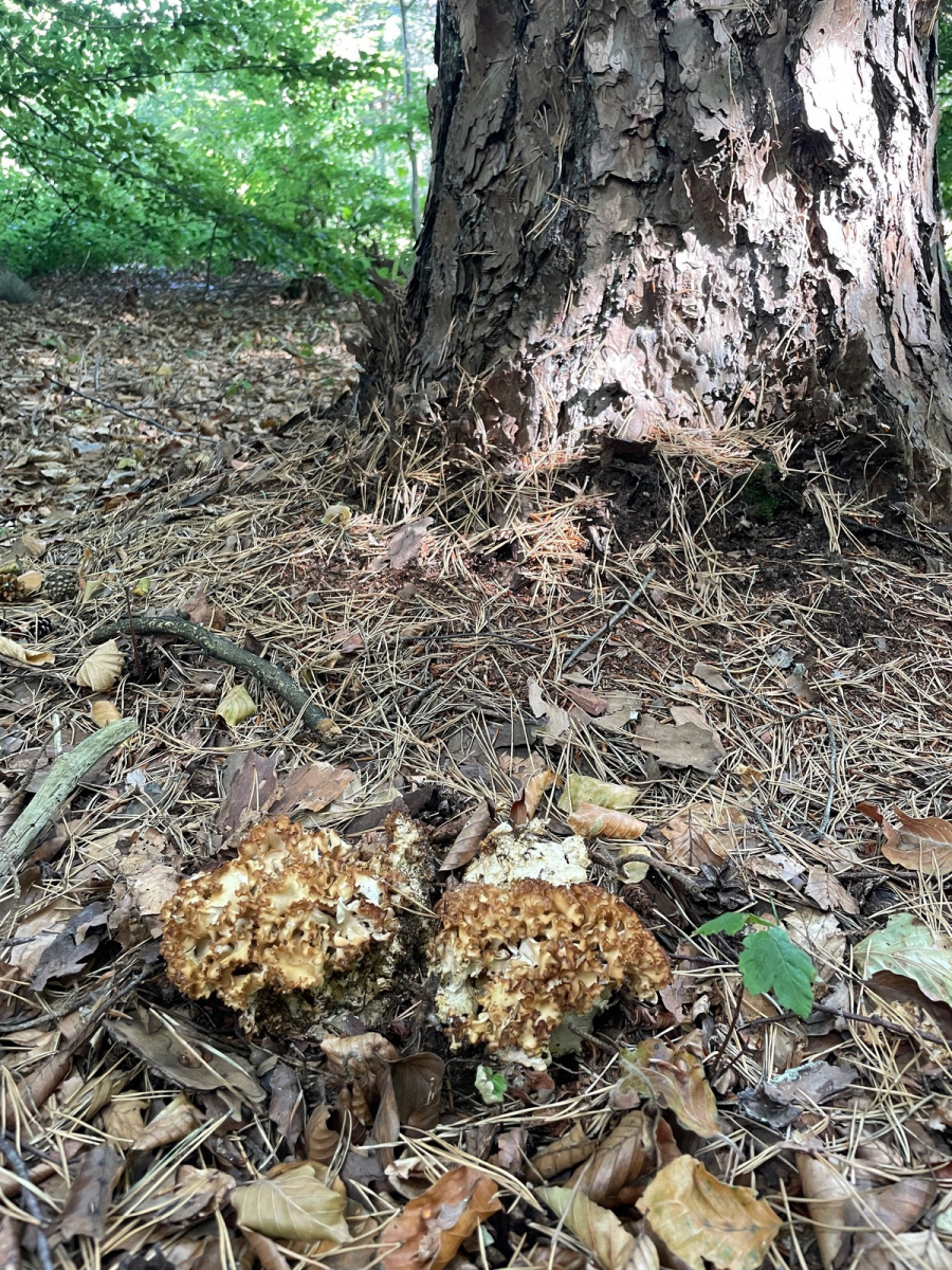 Leider war überhaupt gar nichts pilziges zu finden, abgesehen von einem abgesägten Baumstamm mit ein paar mehrjährigen Pilzen, und ich habe die Runde nach ca. einer Stunde abgebrochen. Auf dem schmalen Streifen zwischen Landstraße und Waldweg machte ich dann doch noch den einzigen Fund des Tages. An der Stelle habe ich mehrfach Flockis in Massen gefunden, Bäume hauptsächlich Kiefern und Buchen. Wuchs entsprechend am Fuß einer Kiefer, würde ich als Krause Glucke bezeichnen.