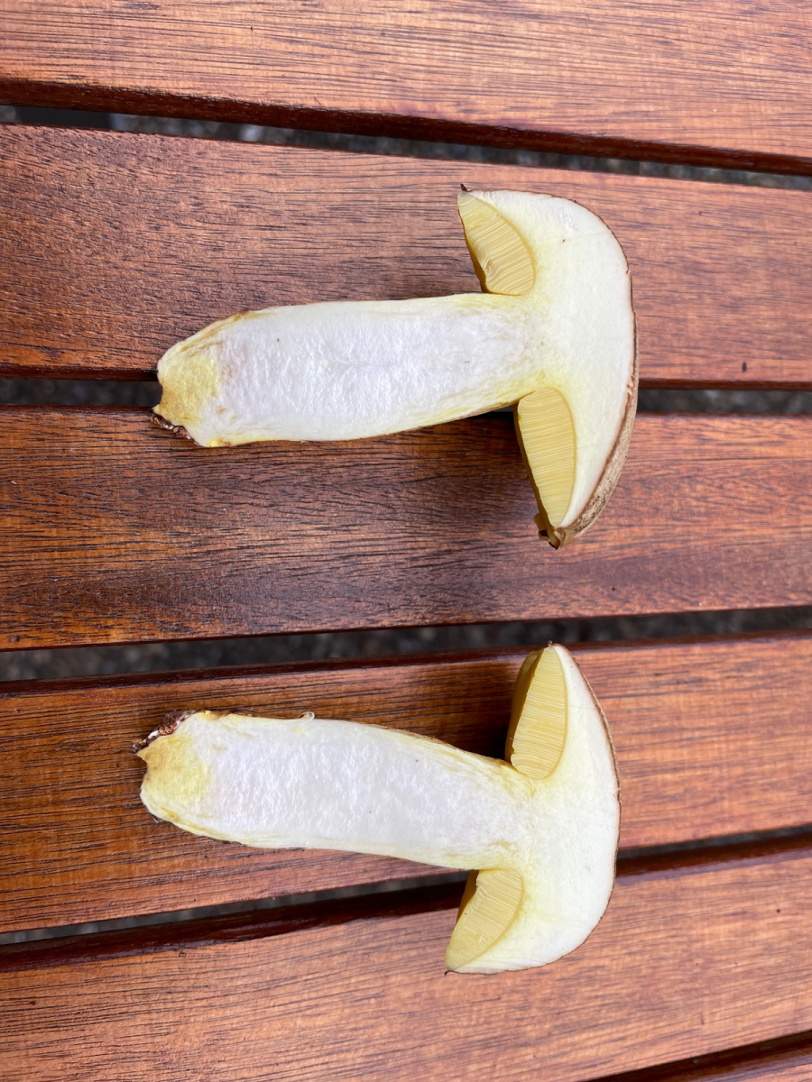 Habe heute unter Eichen nahe am Waldrand direkt an einem Weg die folgenden Röhrlinge in großer Anzahl gefunden.