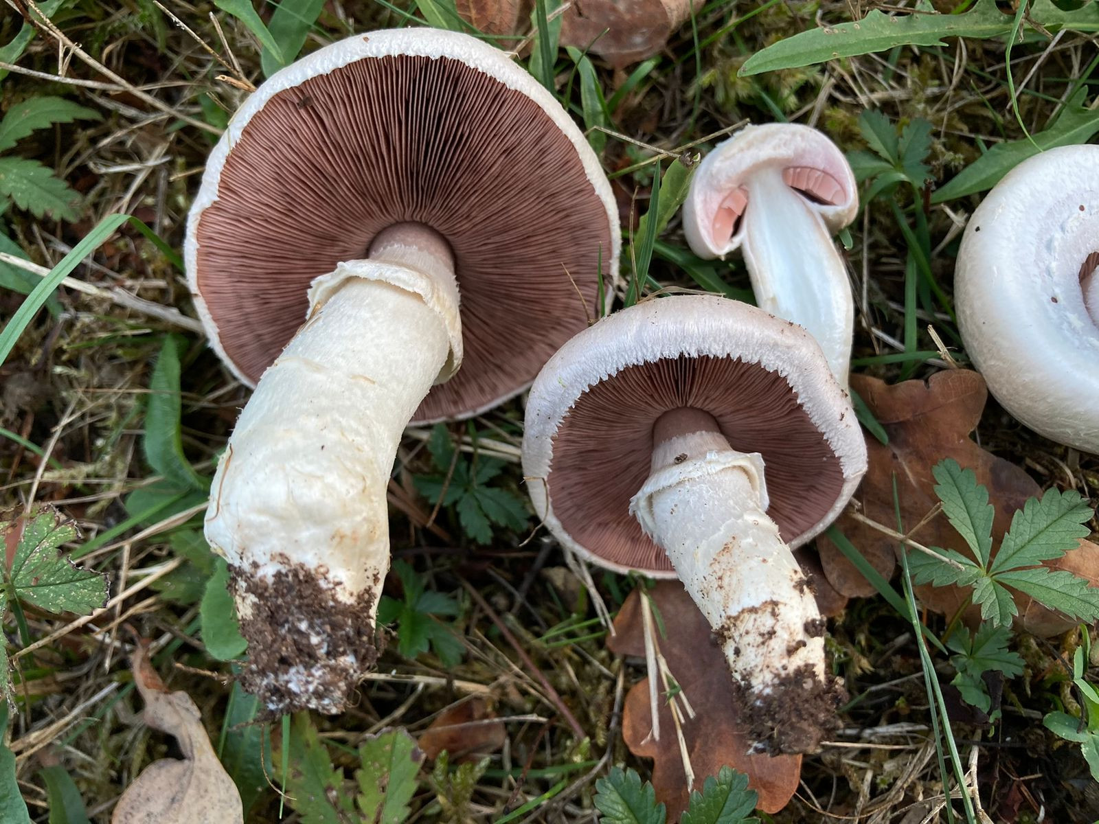 Mir sind diese Champignons über den Weg gelaufen, die ich zunächst als Wiesenchampignon Agaricus campestris s.str. angesprochen hätte. Jedoch kamen mir Zweifel, da das Velum doch ziemlich stark ausgebildet ist und der Ring nicht fransig sondern scharf begrenzt daherkommt.
