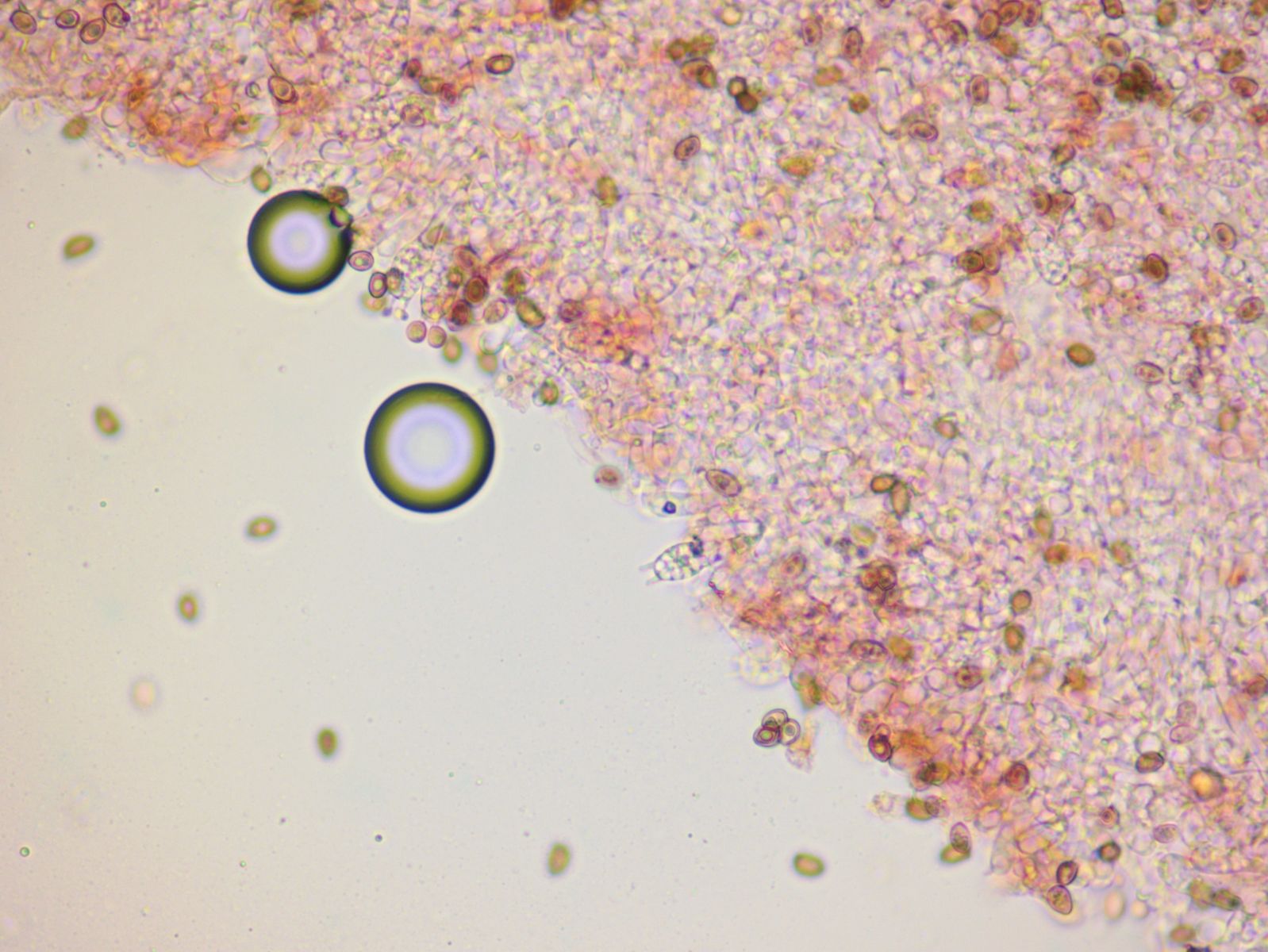 Sporen: ziemlich klein (aus Abwurf nach 1,5 Stunden), (n=15): 6,5-7,5 x 4,25-5,25 ; Mittelwert: 7,0 x 4,75 ; Q=1,5 , Keimporus sichtbar