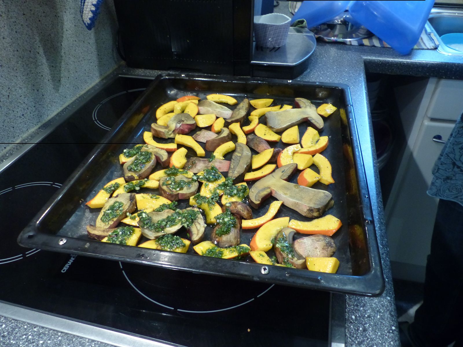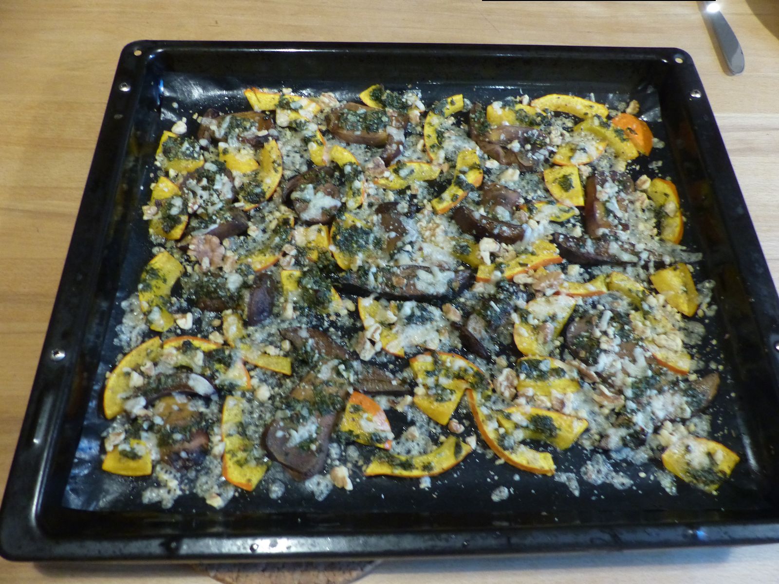 trotz der rascheltrockenen Witterung habe ich unerwartet viele flockenstielige Hexenröhrlinge im besten Alter gefunden. Was tun? Luxusproblem! Ich habe aus den Pilzen ca. 0,5 cm dicke Scheiben geschnitten und den Rest eingefroren. Die (Filet)-Scheiben auf ein Backblech legen zusammen mit Hokaido-Kürbisscheiben und einem Dressing aus Basilikum, Olivenöl und getrockneten Gartenkräutern.