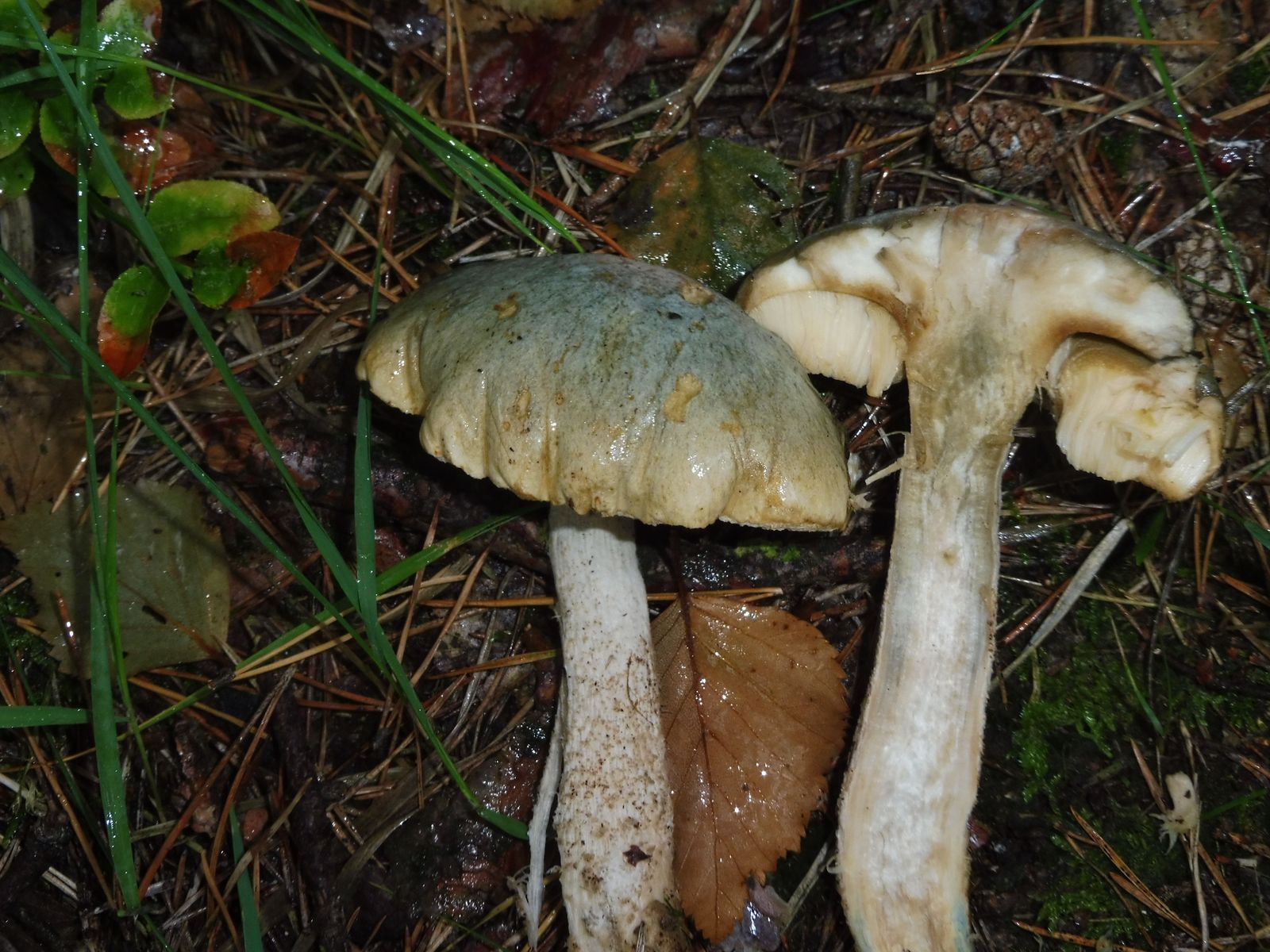 Hut: Zentrum grünblau mit einen Grauton, zum Rand hin in ein schmutziges Weißgelb übergehend, Hutrand nicht deutlich über die Röhren hängen