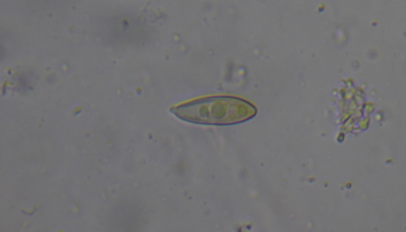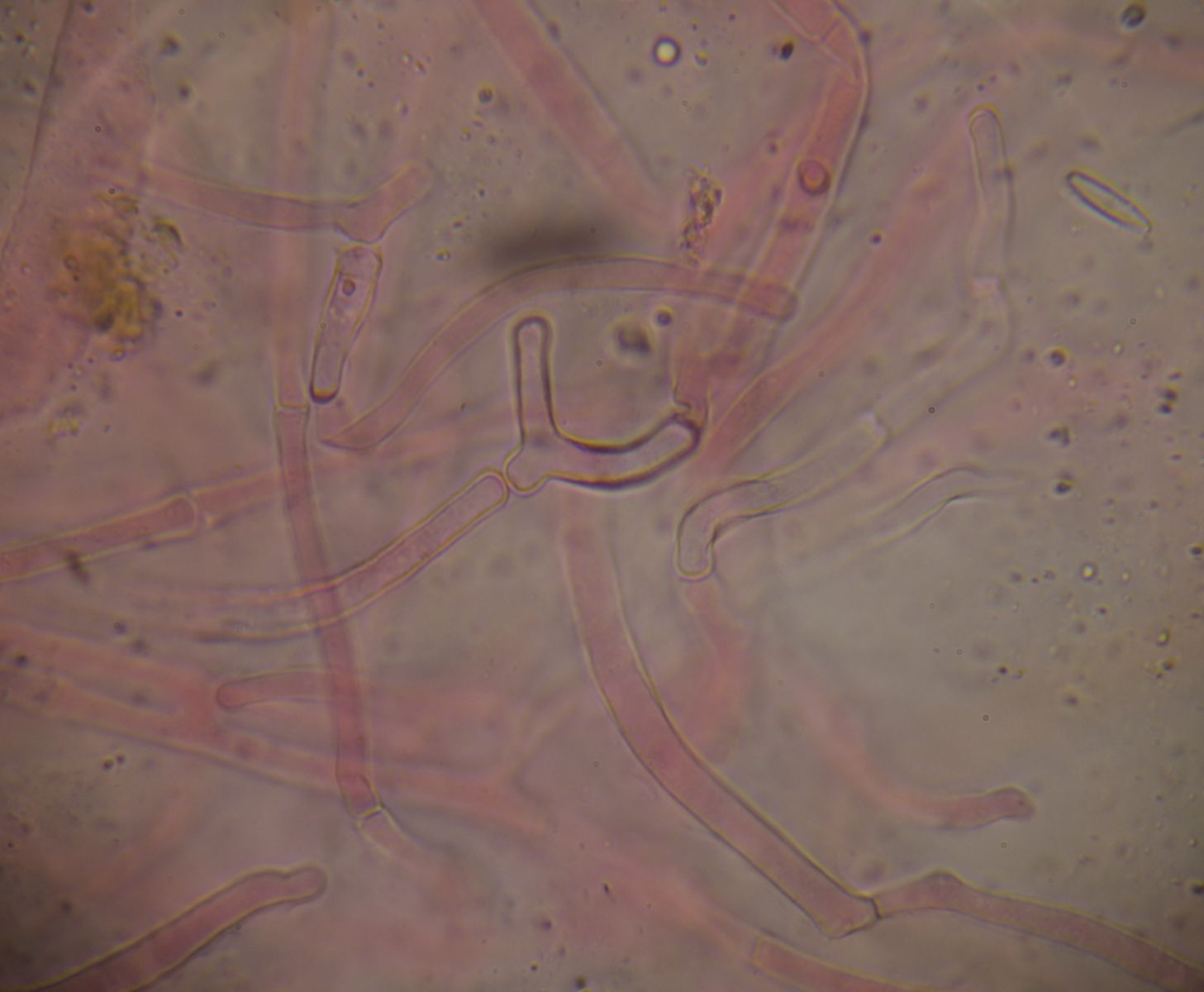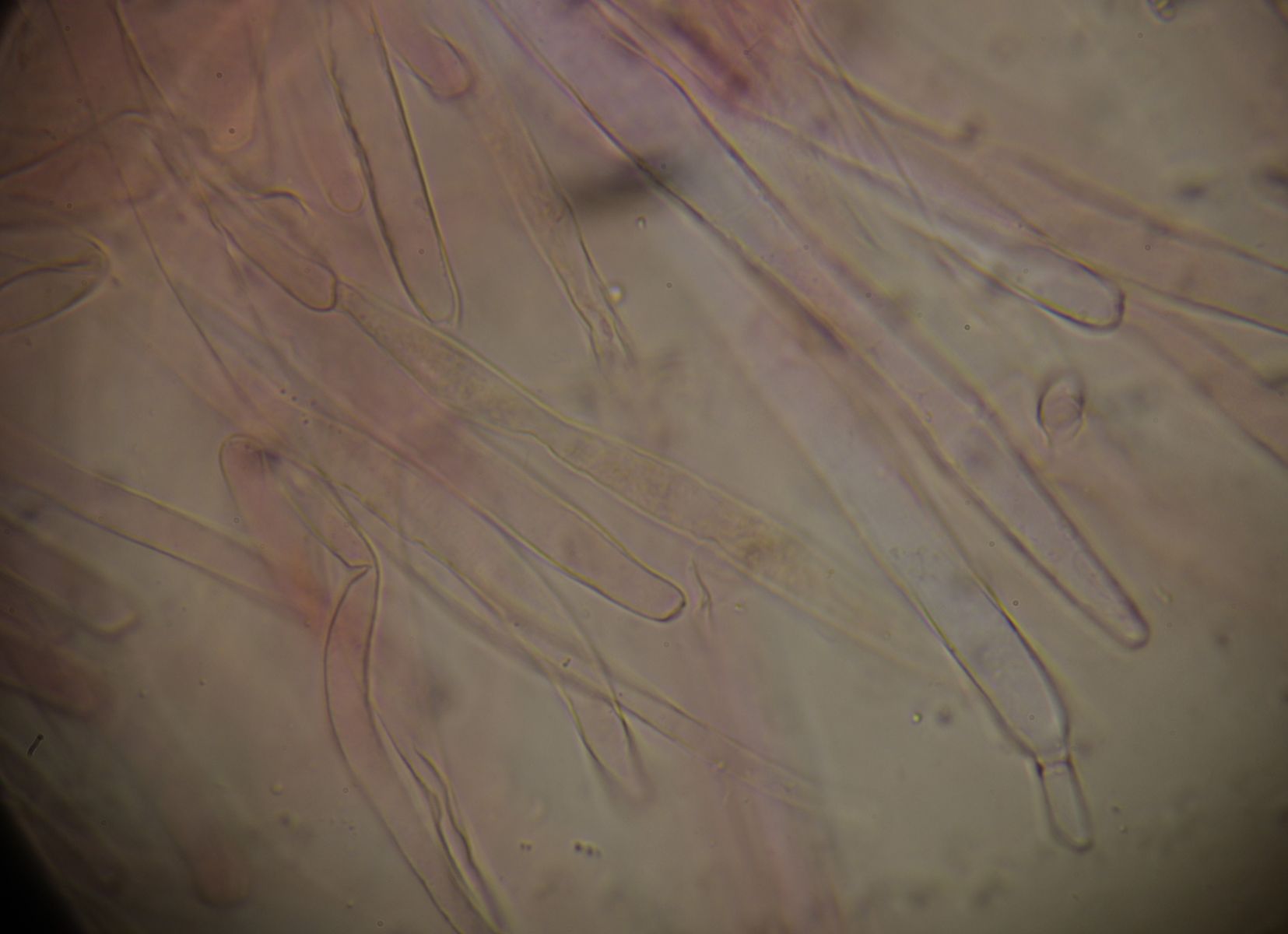 Mikroskopie: Leider konnte ich nur sehr wenige Sporen finden (bisher). Diese sind scheinbar noch nicht ganz reif ? und messen 13,5 x 4,41 µm womit der Q-Wert 3,06 betragen würde. Die Cheilozystiden sind flaschenförmig (Bilder kann ich gerne nachreichen) - die Kaulozystiden konnte ich nicht überprüfen da ich nur ein Stück des Hutes habe. Die Hyphen der Huthaut sind 4-5µm breit und die Cylindrozysten (wenn es welche sind) sind 9,8-10,2µm breit.