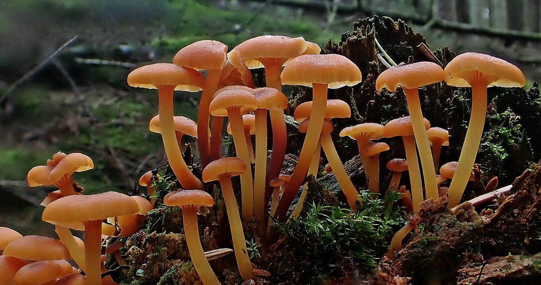 Unübersehbar war ein weiterer Holzbewohner, der zu Hunderten an alten Fichtenstubben wuchs. Der Gesellige Glöckchennabeling (Xerophalina campanella).