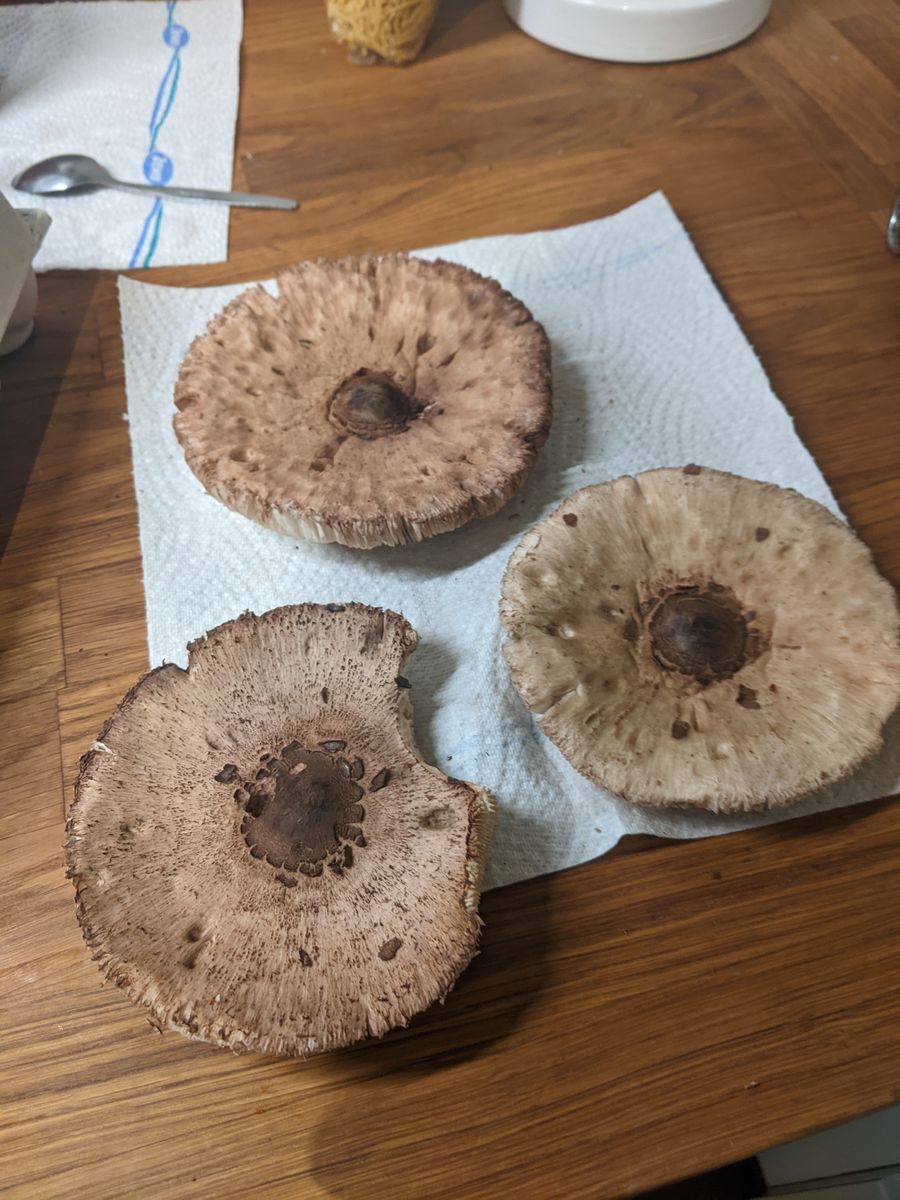 Hallo chrissooo, es dürfte sich schon um Angehörige der Gattung Macrolepiota handeln. Wenn es um Verzehr geht, spielt aber auch das Alter und die Frische der Fruchtkörper eine Rolle. Deine Exemplare haben einen komplett aufgeschirmten Hut, sodass die Hutränder sogar die Hutmitte zu überragen scheinen. Das ist ein Zeichen dafür, dass es sich um sehr reife Exemplare handelt, was Konsequenzen für die Essbarkeit haben könnte (Stichwort unechte Pilzvergiftung).