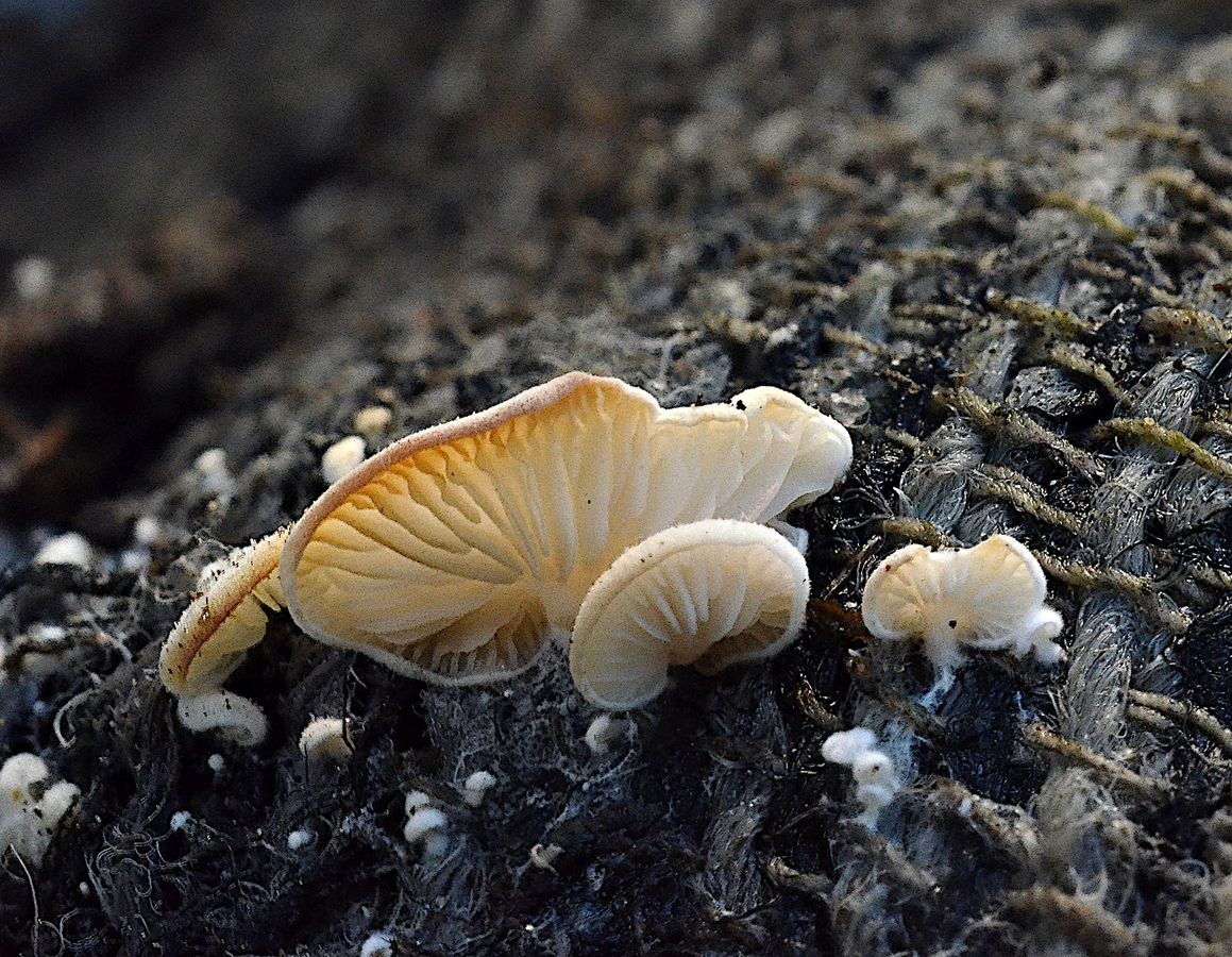 Währenddessen tat sich Unerwartetes in meinem Garten: kleine (bis knapp 2 cm) weiße muschelförmige Fruchtkörper.