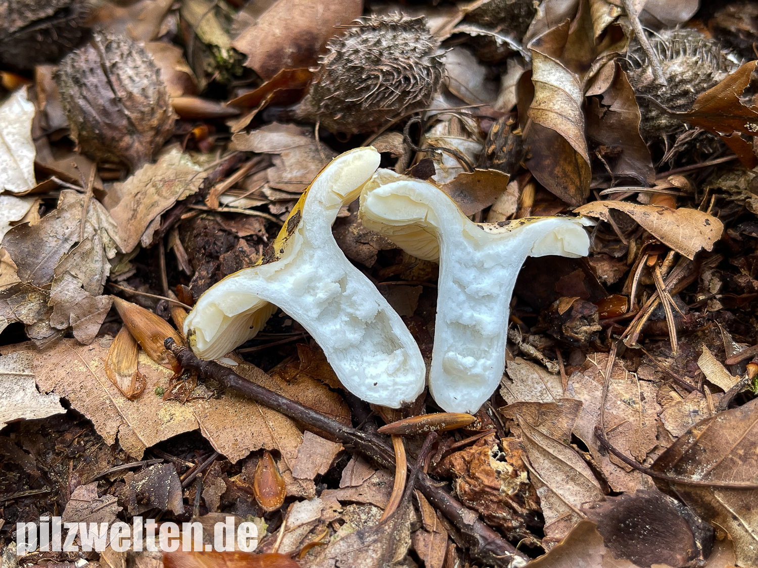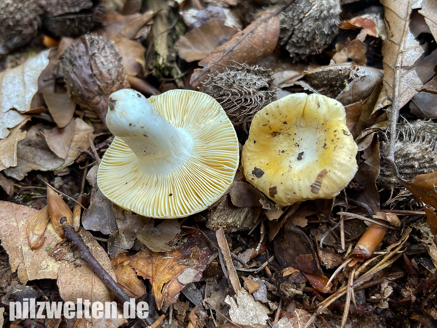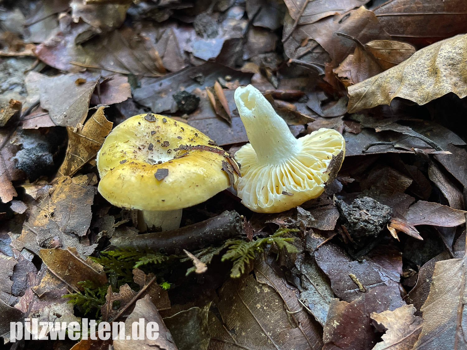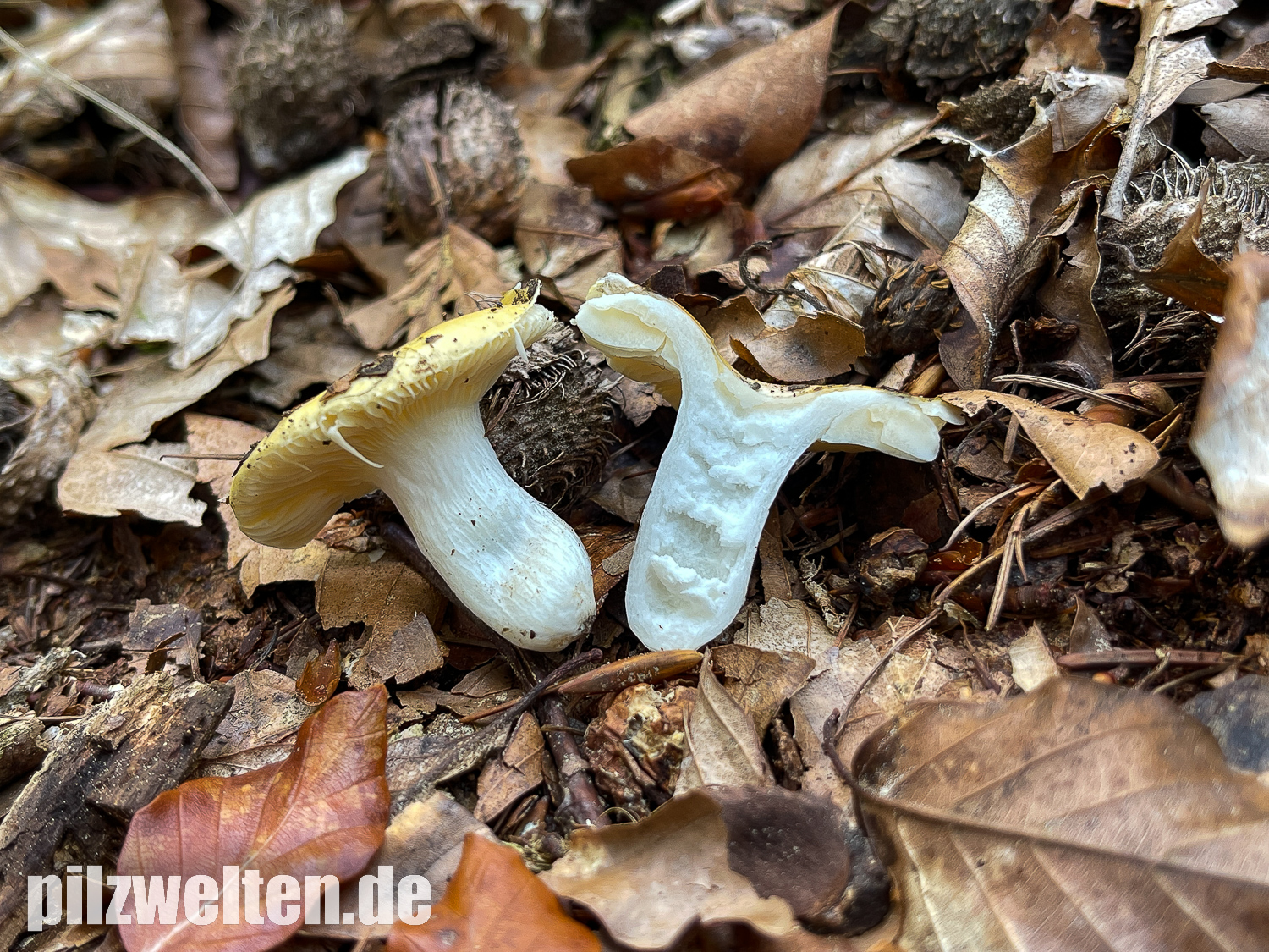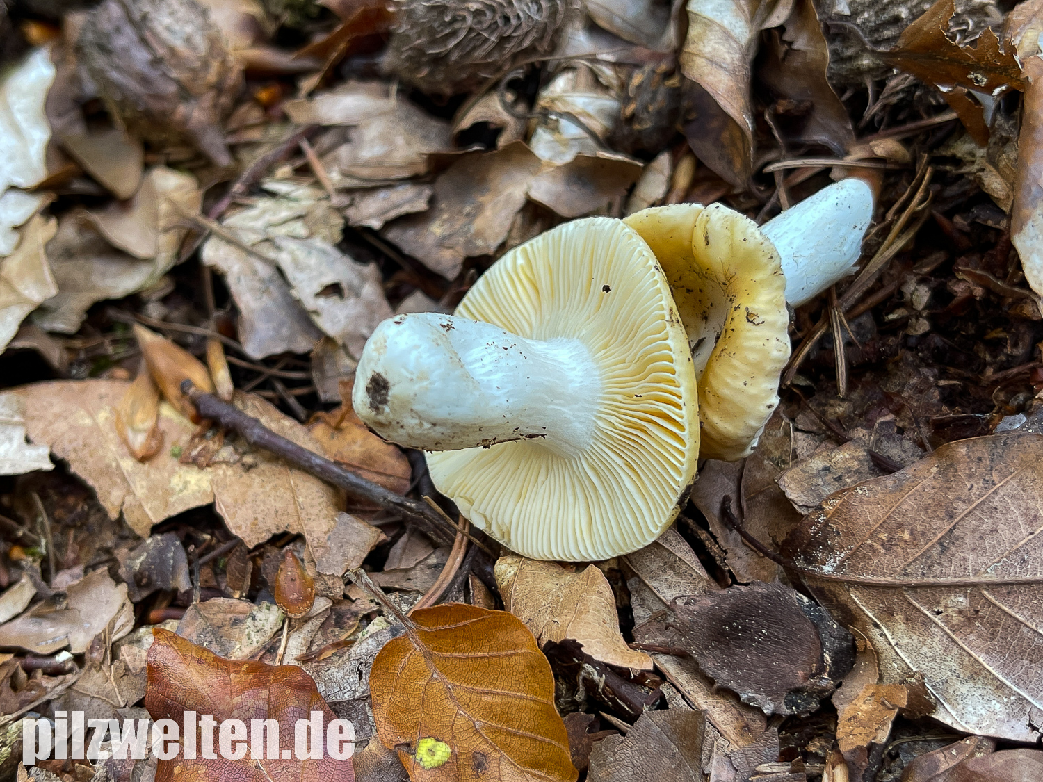 - Lamellen: Weißlich bis blassgelblich, relativ engstehend, am Grund teilweise querverbunden