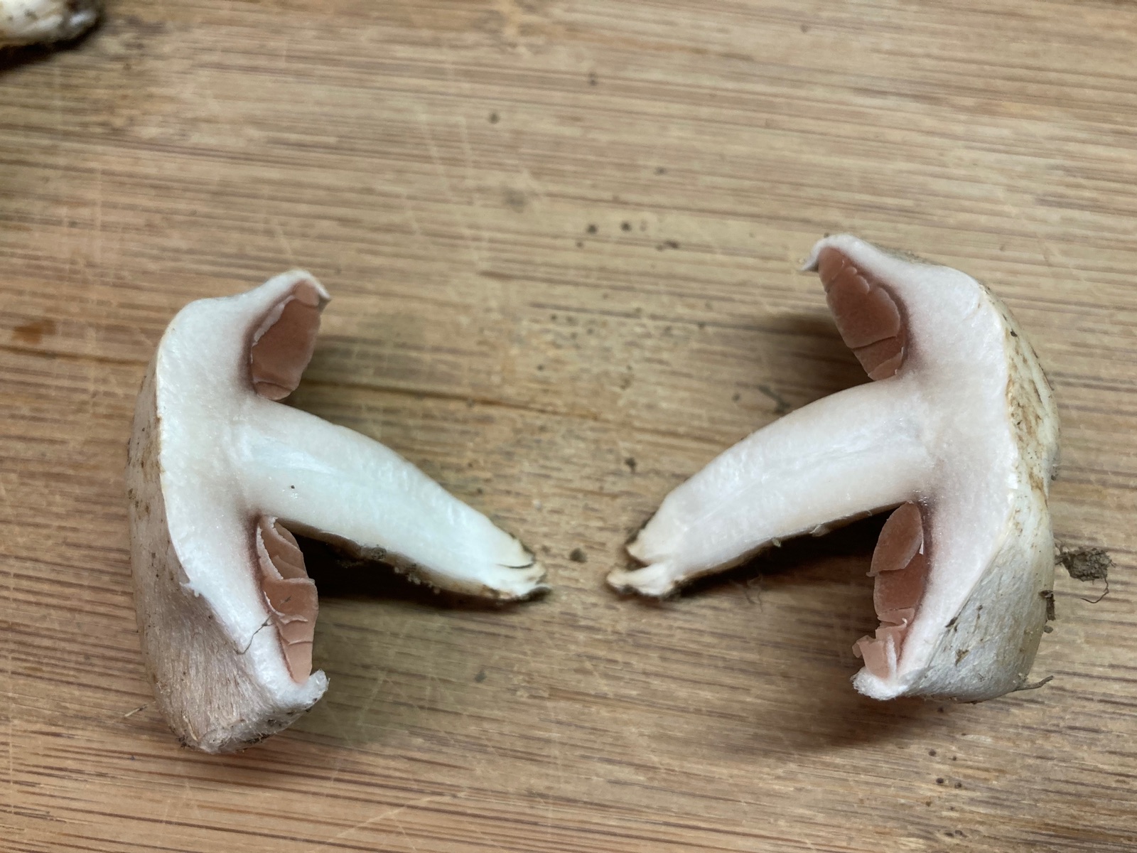 Fleisch: Weiß, kaum verfärbend (ggf schwach gelblich im Stiel, schwach bräunlich im Hut, Hut und Stiel strukturell abgegrenzt (s. Photos).