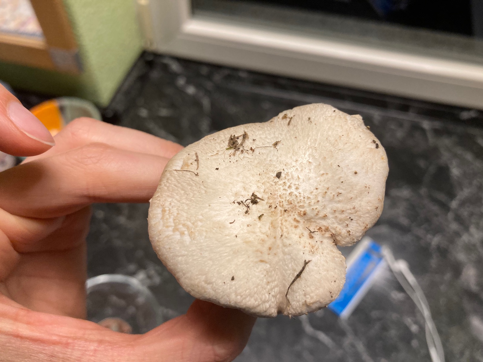 Hut: 4-6 cm Durchmesser, Huthaut silbrig-weiß, geflockt, vom Hutrand her leicht abziehbar (siehe Photos).