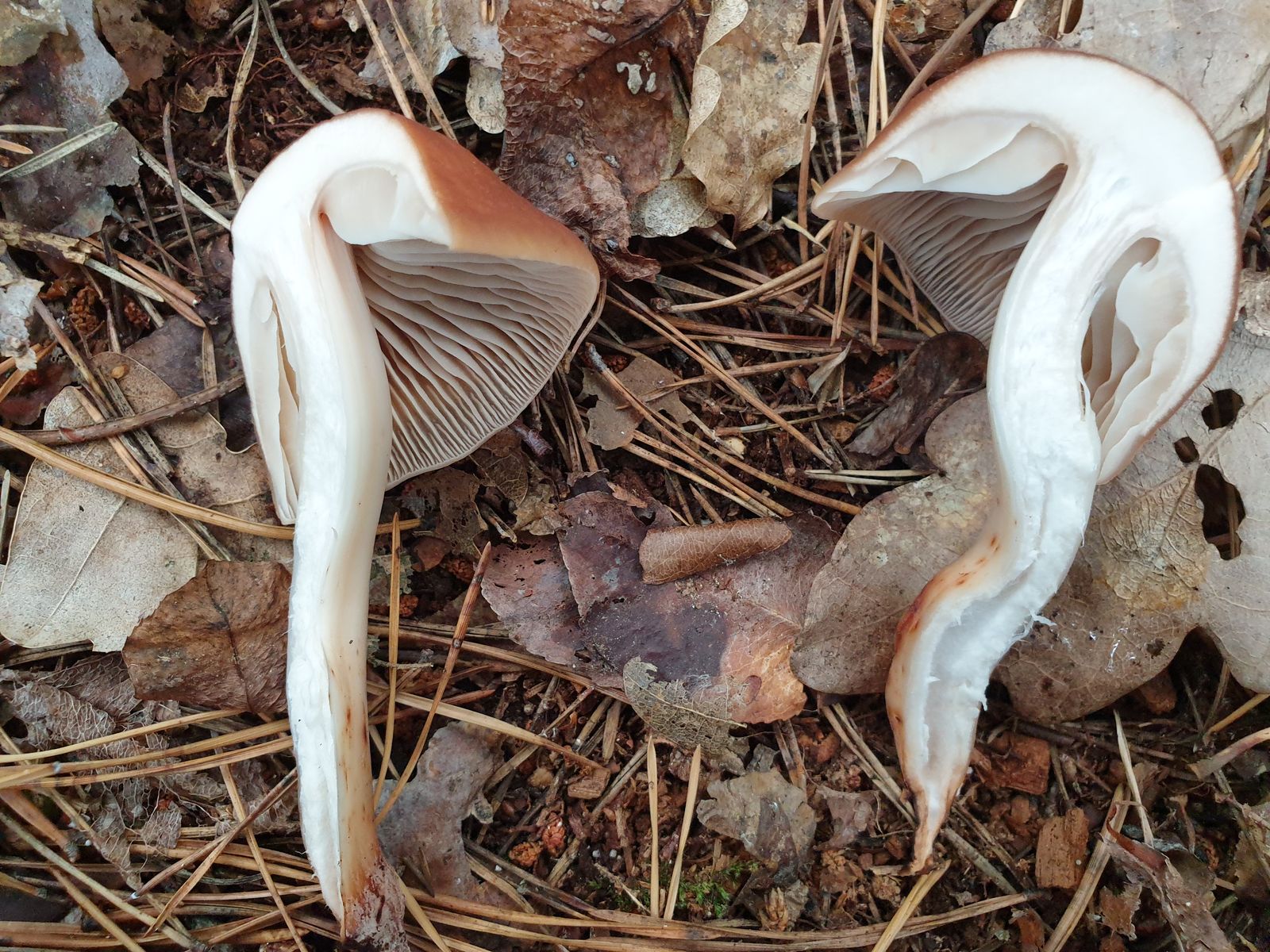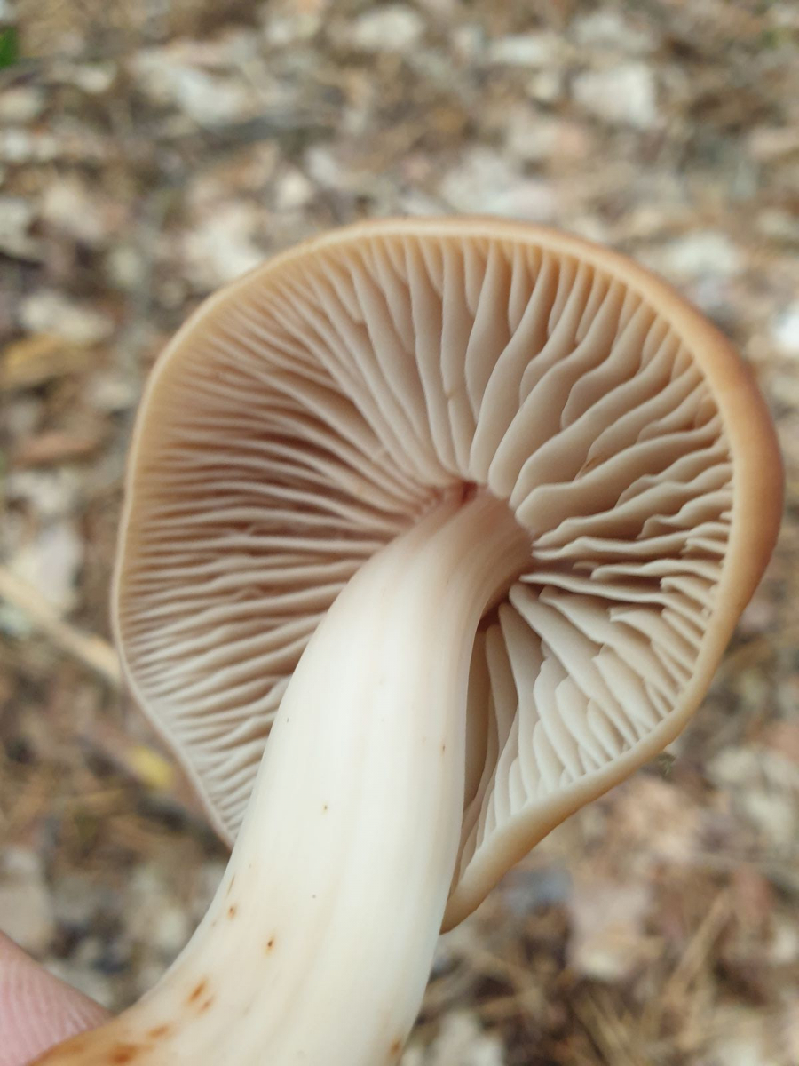 Der ganze Pilz ist ziemlich gummiartig, es verfärbt sich nichts bei Druck/Zerquetschung oder beim Anschneiden. Die Lamellen wirkten zunächst frei, sind aber ausgebuchtet angewachsen mit Zwischenlamellen.