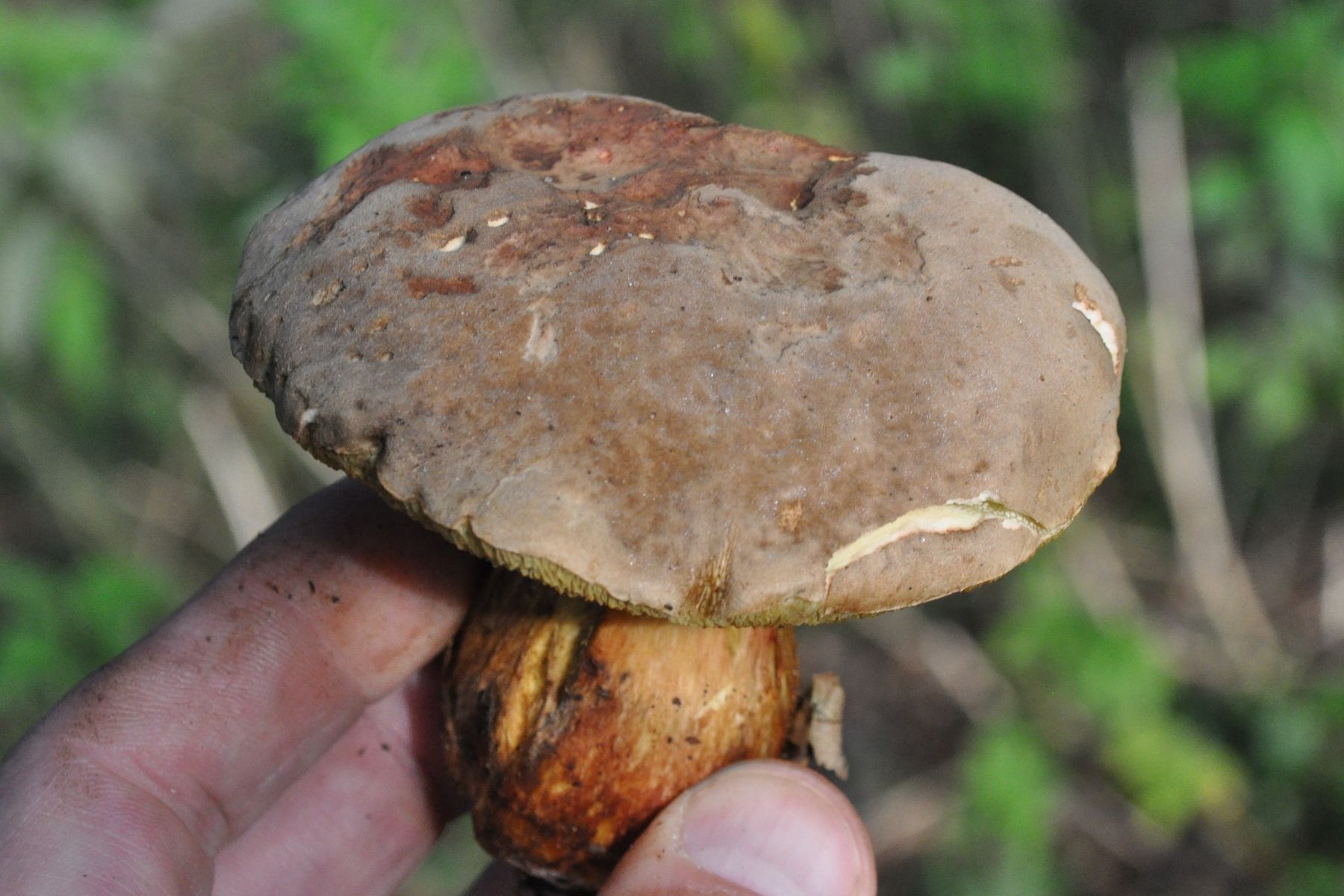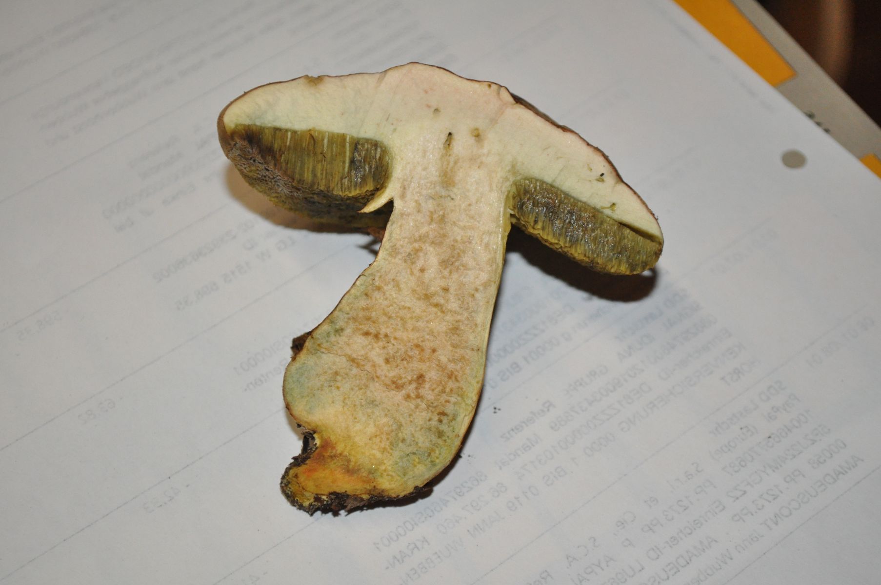 Das Fleisch ist sehr hellgelb (weißlich), blaut im Schnitt kaum (nur direkt über der Röhrenschicht im Hut), läuft sonst eher etwas bräunlich an. Ich würde daher denken, dass man zumindest cisalpinus ausschließen kann (auch).