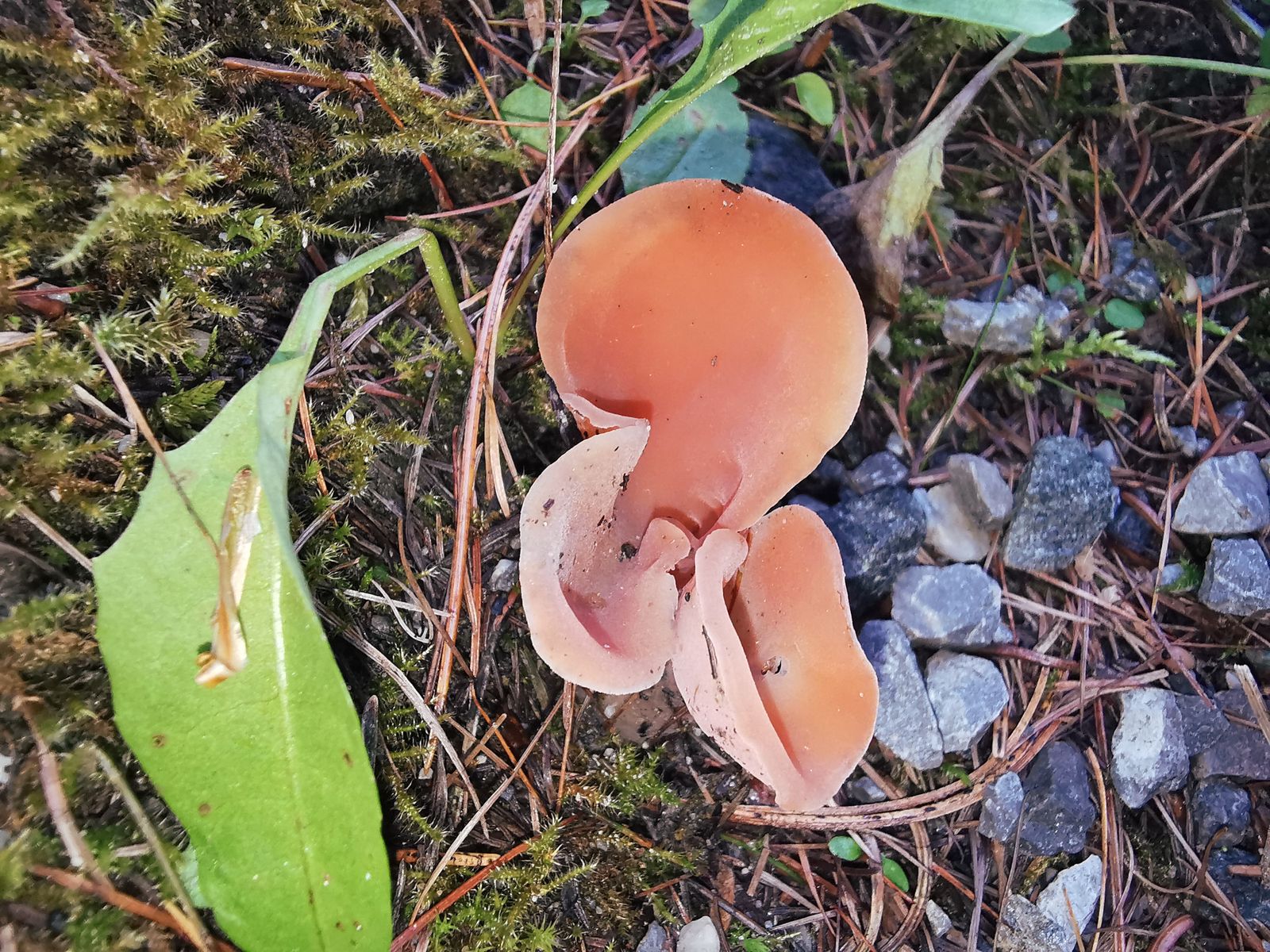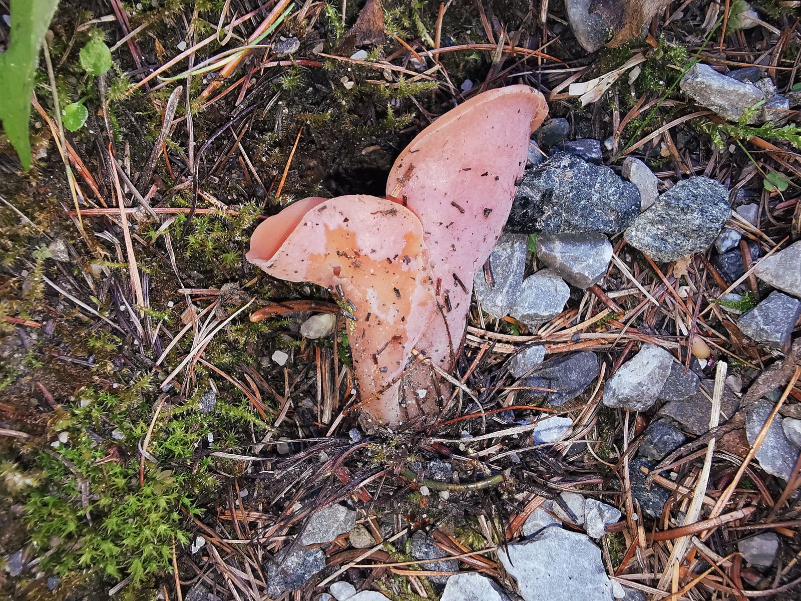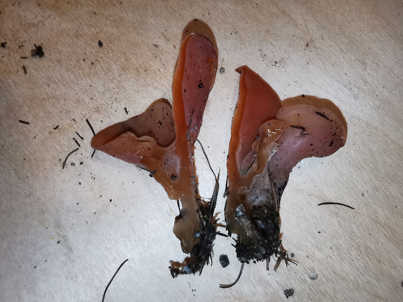 Beim ersten vermute ich den Rötlichen Gallerttrichter - Guepinia helvelloides. Gefunden habe ich diesen direkt am Wegrand.