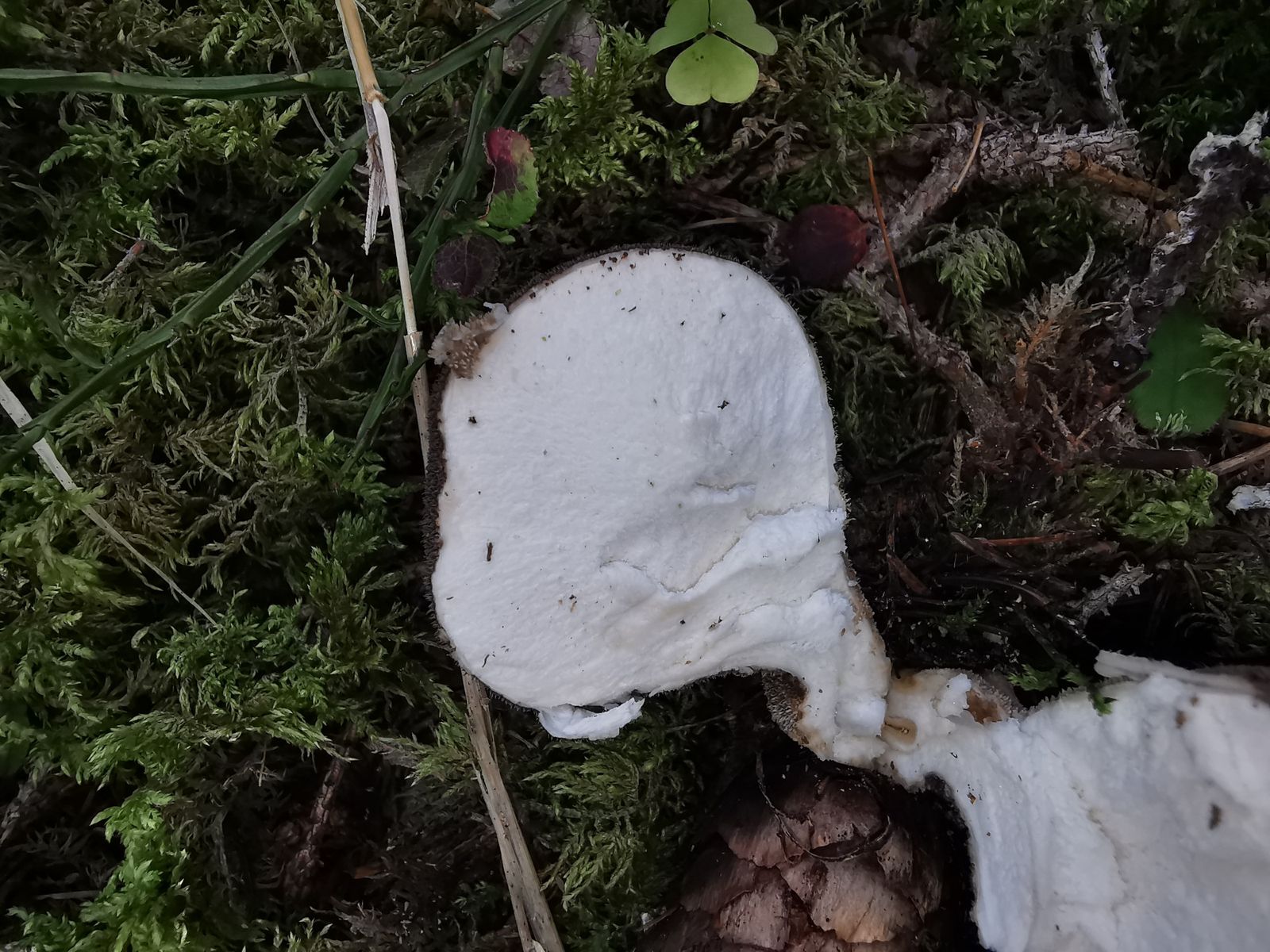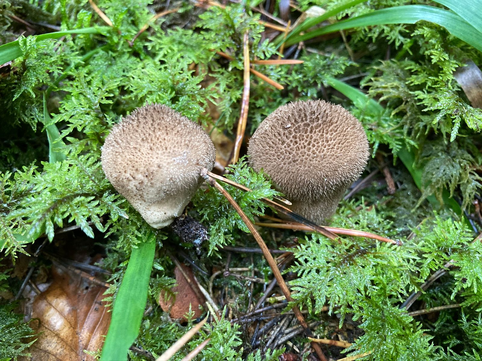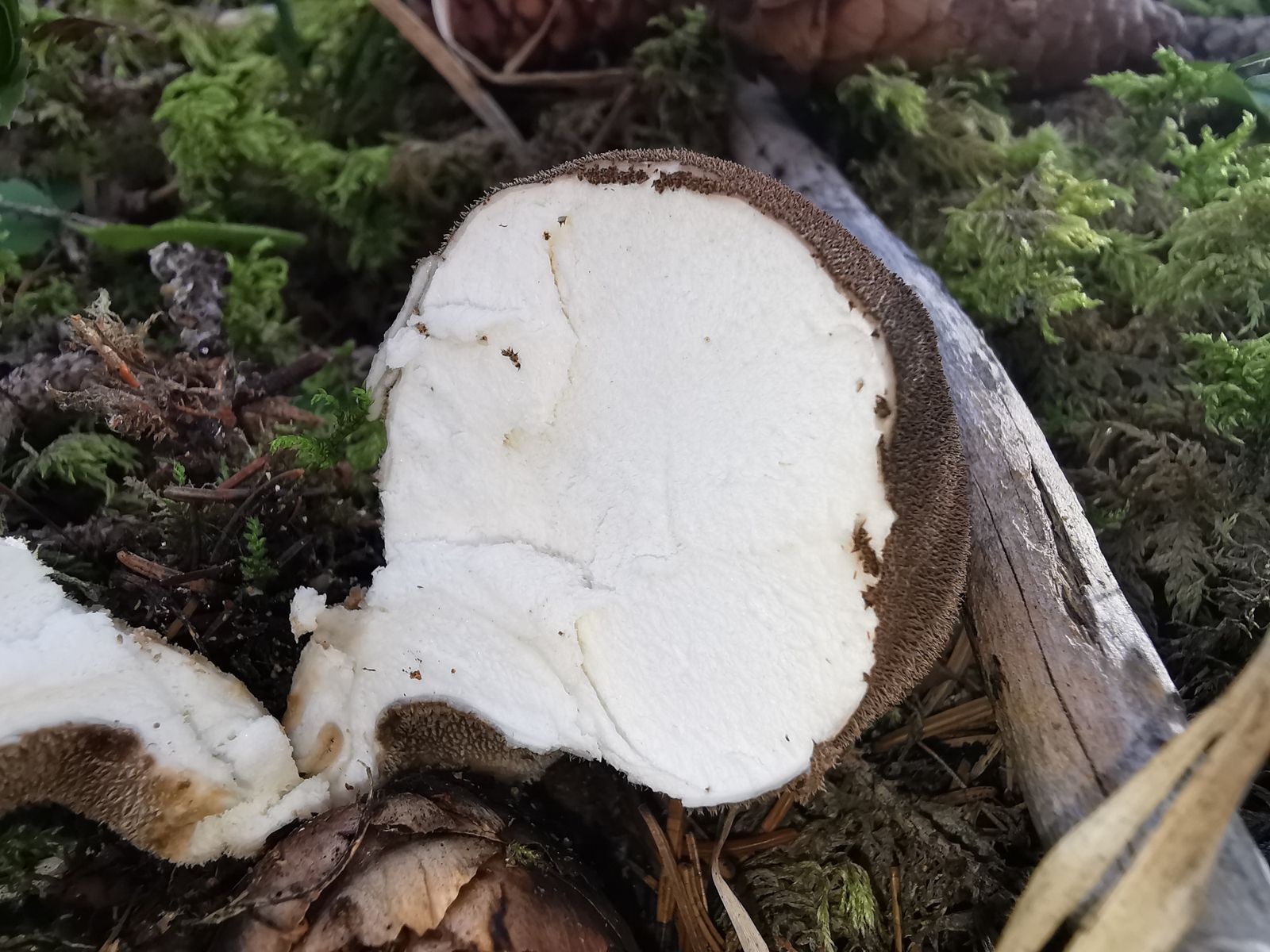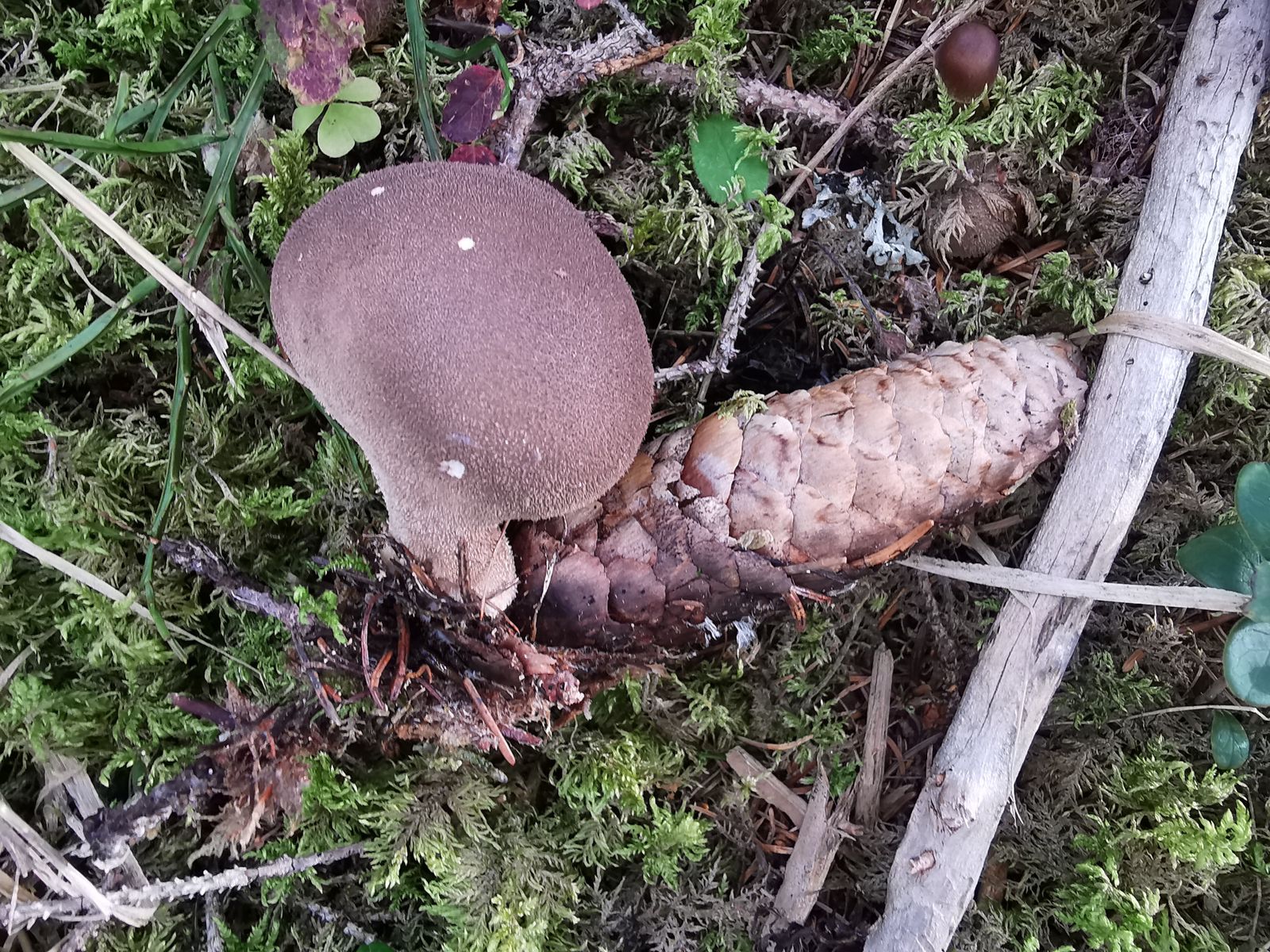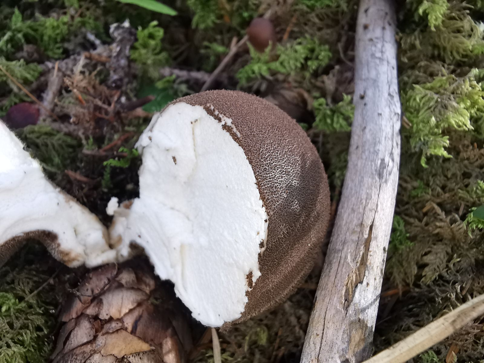 Dann habe ich noch einen Stäubling gefunden. Stäublinge (Falschenstäublinge und Birnenstäublinge) sehe ich sehr häufig, aber so einen wie diesen habe ich bisher noch nicht gesehen. Die Oberfläche war dunkelbraun und er war ziemlich gross (deutlich grösser als die Flaschenstäublinge, siehe im Vergleich den Fichtenzapfen). Ich dachte eigentlich, dass er innen sicher schon ganz braun ist, war aber noch weiss. Den Geruch empfand ich irgendwie als etwas gasartig, aber eigentlich gar nicht so unangenehm. Es schien mir so, als ob er auf dem Fichtenzapfen oder kleinen Ästchen wachsen würde.