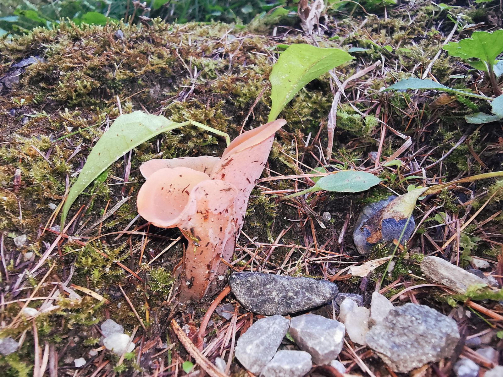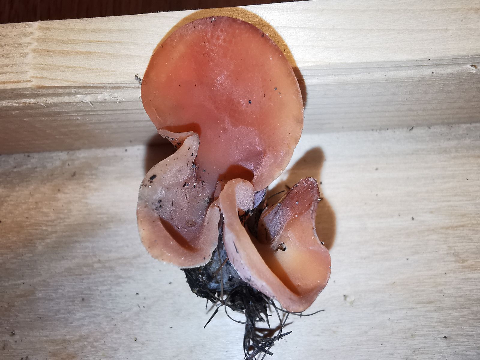 Beim ersten vermute ich den Rötlichen Gallerttrichter - Guepinia helvelloides. Gefunden habe ich diesen direkt am Wegrand.