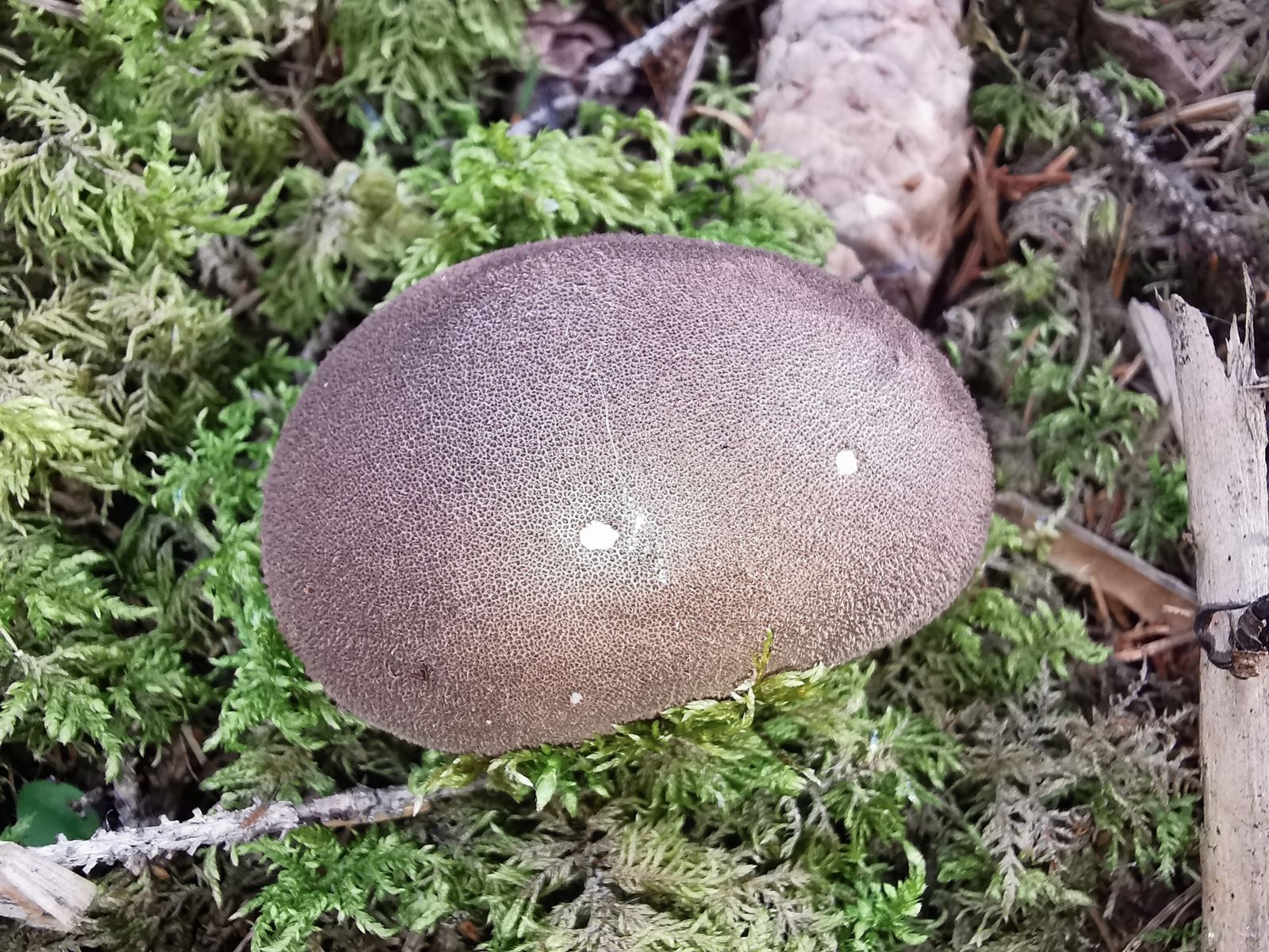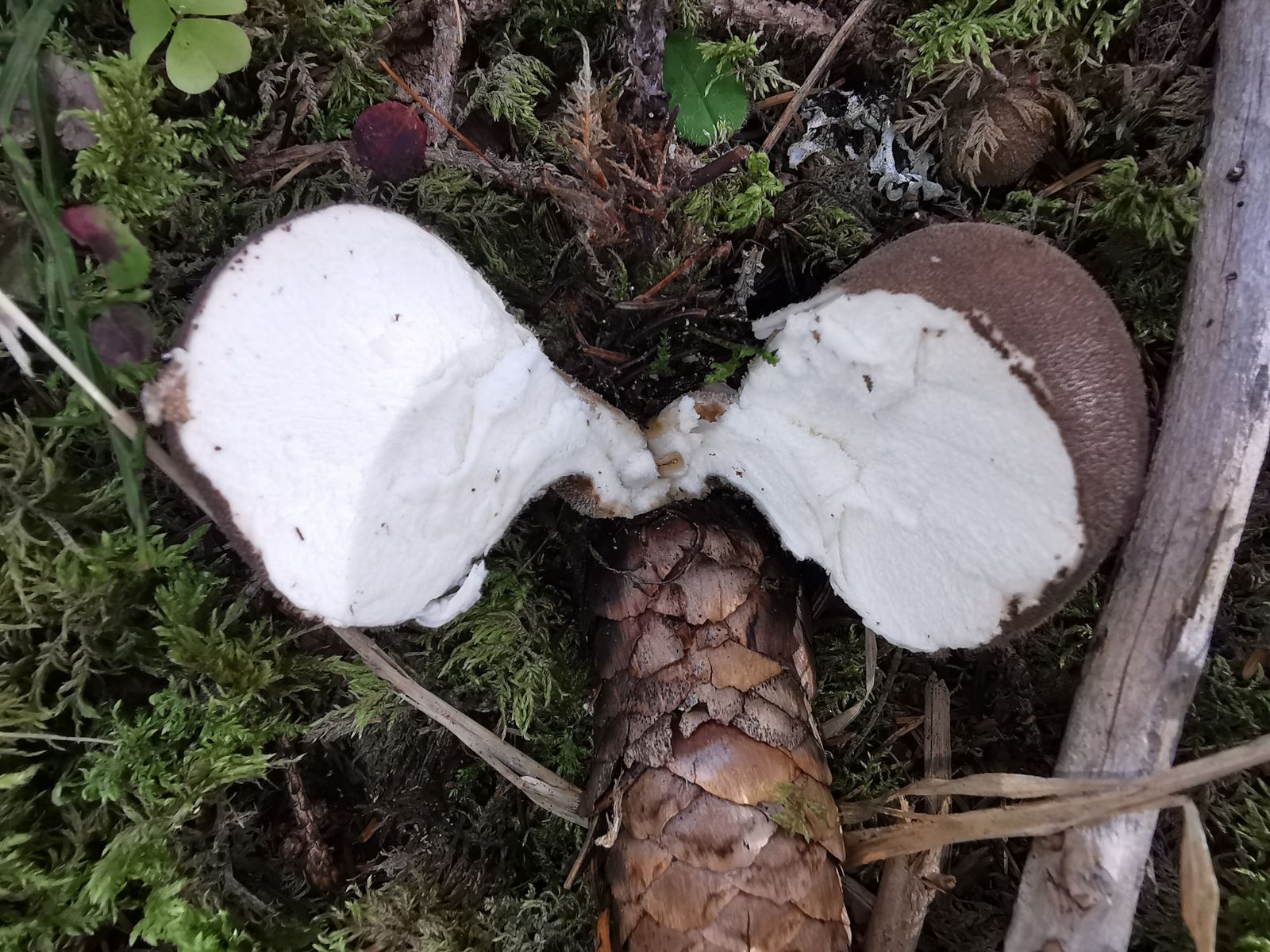 Dann habe ich noch einen Stäubling gefunden. Stäublinge (Falschenstäublinge und Birnenstäublinge) sehe ich sehr häufig, aber so einen wie diesen habe ich bisher noch nicht gesehen. Die Oberfläche war dunkelbraun und er war ziemlich gross (deutlich grösser als die Flaschenstäublinge, siehe im Vergleich den Fichtenzapfen). Ich dachte eigentlich, dass er innen sicher schon ganz braun ist, war aber noch weiss. Den Geruch empfand ich irgendwie als etwas gasartig, aber eigentlich gar nicht so unangenehm. Es schien mir so, als ob er auf dem Fichtenzapfen oder kleinen Ästchen wachsen würde.