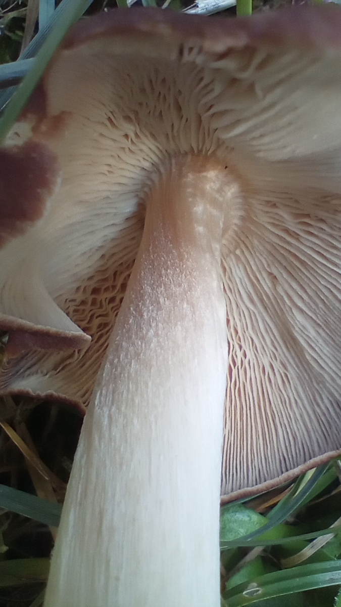 Lamellen: eng stehend, ausgebuchtet, aber angewachsen. Farbe wie auf den Fotos creme-weiß.