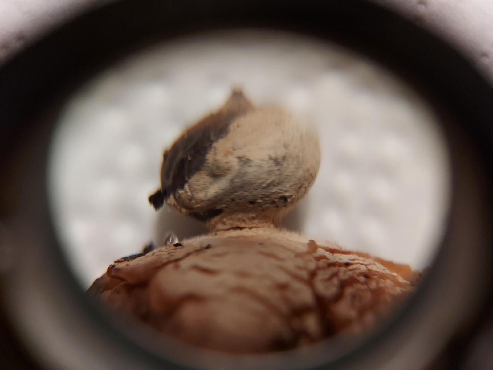 Die Halskrause sieht man leider noch nicht, sie bildet sich erst im Alter aus. Aber die Mündung (Peristom) ist gewimpert mit einem Hof drumrum. Das hätte der Rötende Erdstern nicht, dessen Mündung ist gewimpert aber ungehöft. Er hätte auch im jungen Zustand immer die rötliche Farbe, die der Halskrausen-Erdstern nur sehr sehr jung ganz wenig hat.