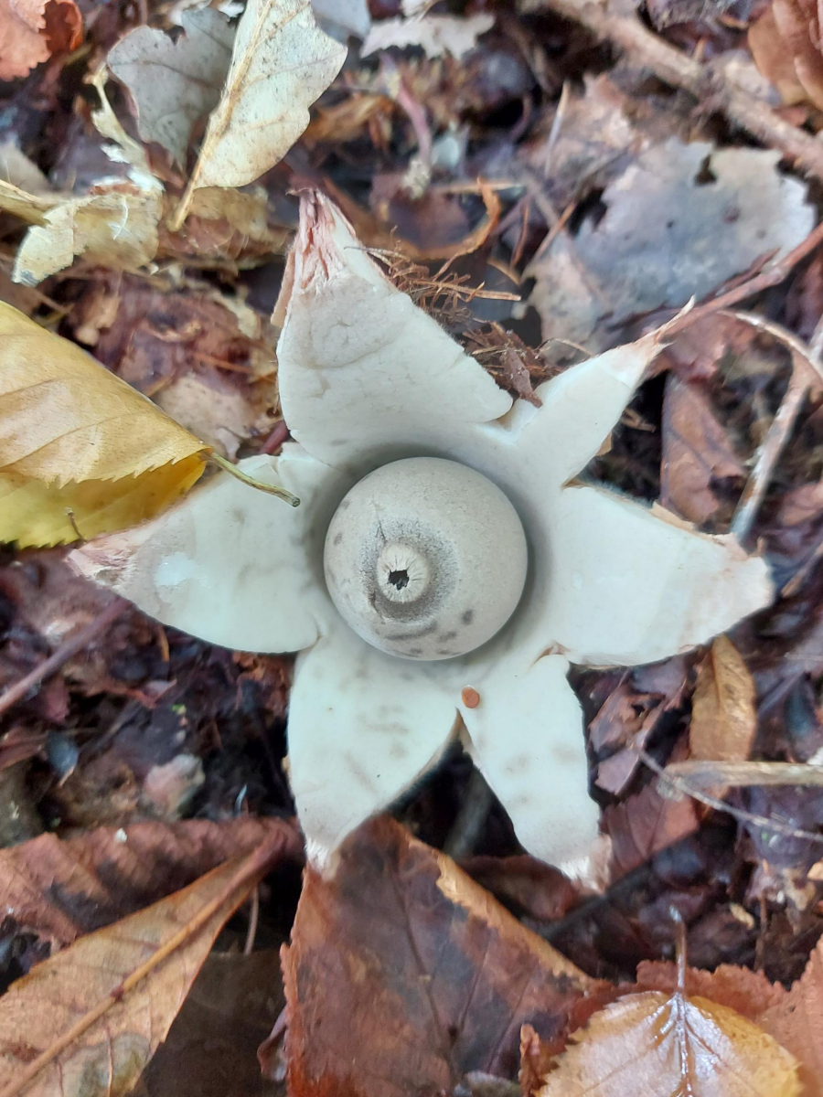 Das ist wieder nun ganz was anderes. Das sind junge Fruchtkörper von Geastrum triplex, dem Halskrausen-Erdstern.