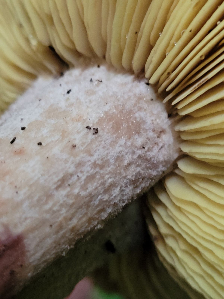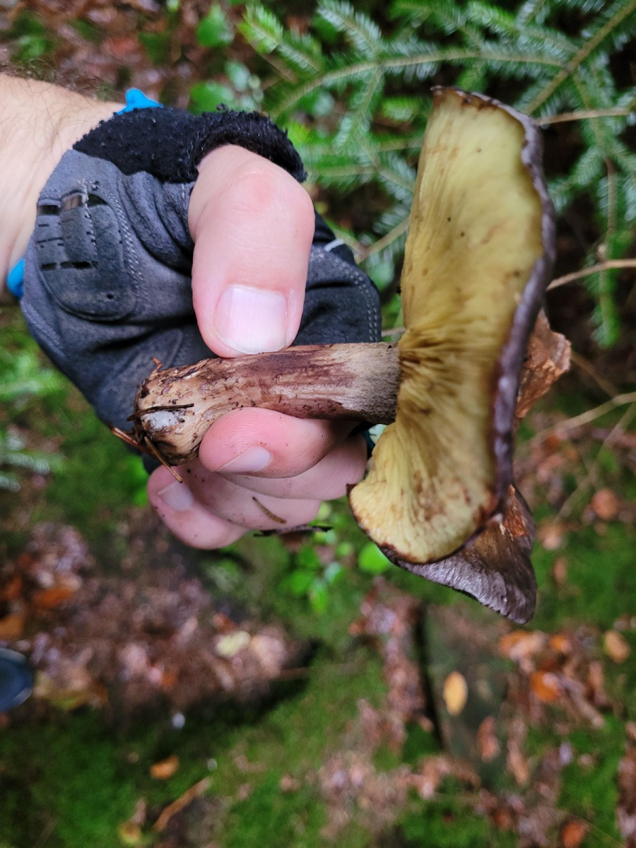 • Vor Kurzem durfte ich einen tollen Fund machen, von dem ich gerne kurz berichten möchte. Der dunkle Hut erinnerte mich erst an irgend einen alten Milchling und entnahm ohne etwas spezielles zu erwarten einen der Fruchtkörper. Als ich dann die gelben Lamellen sah, wusste ich gleich was ich gefunden hatte: Den sehr seltenen Karminschwärzling (Lyophyllum favrei).