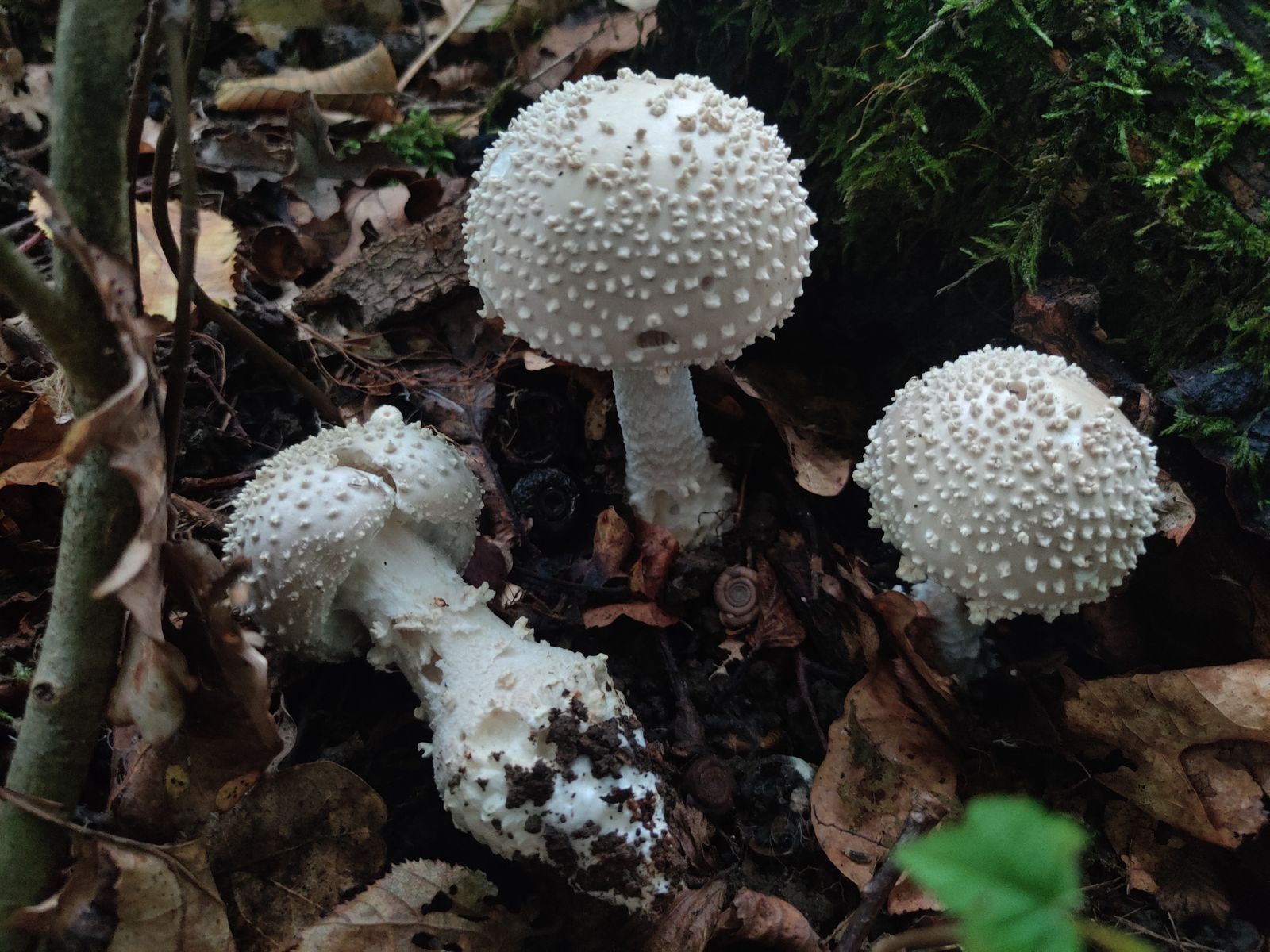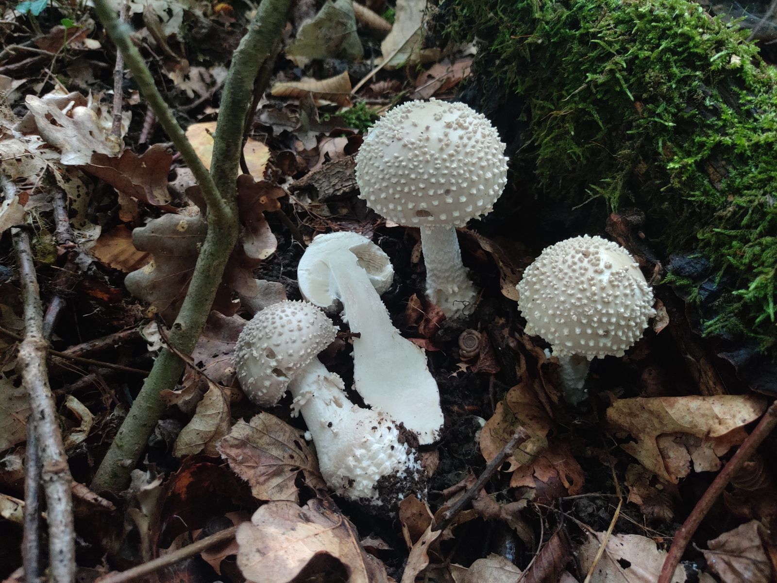 Gestern Abend machte ich nach Feierabend einen kleinen Spaziergang durch den nahe gelegenen Wald. Ein Auwald, in dem ich im Frühjahr auf Morchelpirsch gehe. Mit Mykorrhiza-Pilzen rechnete ich nicht wirklich, der Wald hat größtenteils sehr viel Unterbewuchs und ist im Sommer/Herbst schwer zugänglich. Es kam aber ganz anders. Nach einiger Zeit leuchteten mir gerade 2-3 Meter vom Weg entfernt einige weiße Pilze entgegen. Auf einer winzigen freien Fläche unter zwei mächtigen Eichen entdeckte ich zunächst auf wenigen Quadratmetern etliche Mehl-Räslinge (Clitopilus prunulus), zwei Perlpilze (Amanita rubescens), zwei alte Netzhexen (Suillellus luridus) und einige Exemplare des Igel-Wulstlings (Amanita solitaria). Verrückt was sich in einer so kleinen ökologischen Nische ansiedeln kann!