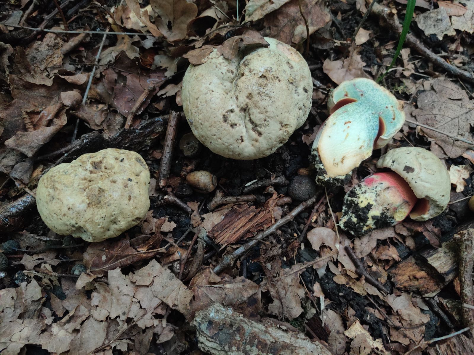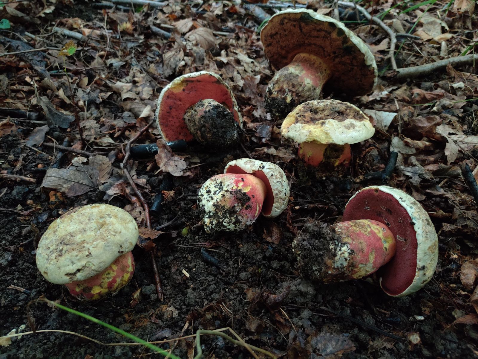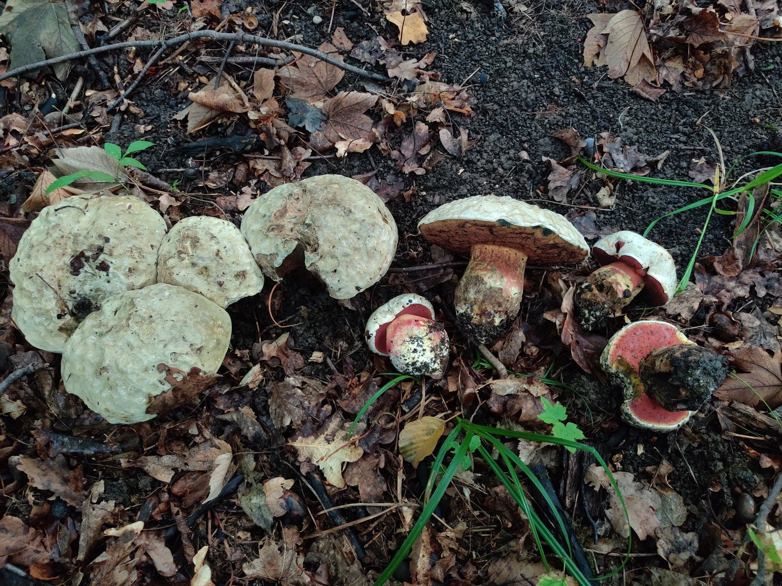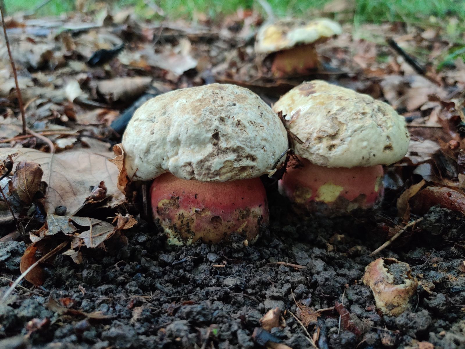 Dann kam der Kracher. In einem kleinen Eichen-dominierten Abschnitt zeigten sich Dutzende Röhrlinge am Wegesrand, die ich zunächst nicht zuordnen konnte. Nach etwas Überlegen kam dann nur noch der Satans-Röhrling (Rubroboletus satanas) in Frage. Kann das wirklich sein? Direkt vor der Haustür, so viele Exemplare und dann noch in einem Habitat, in dem ich es nie erwartet hätte? Was meint ihr, das müsste doch schon der Satans-Röhrling sein, oder? Leider war ich auf dem Sprung und hatte überhaupt keine Zeit mir die Pilze im Detail anzusehen. Daher auch nur die paar Schnappschüsse im dämmrigen Licht. Frühestens Morgen Abend schaffe ich es wieder zum Fundort. Ich hoffe nach den kräftigen Regenfälle heute bleibt noch was übrig, gerade weil die meisten schon stark von den Schnecken mitgenommen waren, damit ich die Funde in Ruhe begutachten kann.