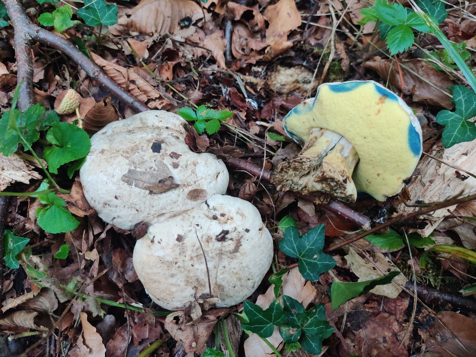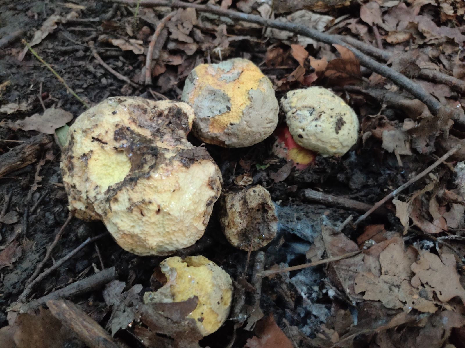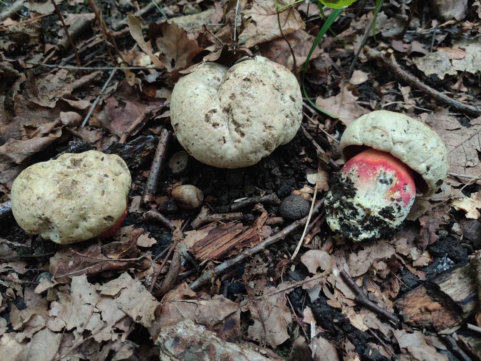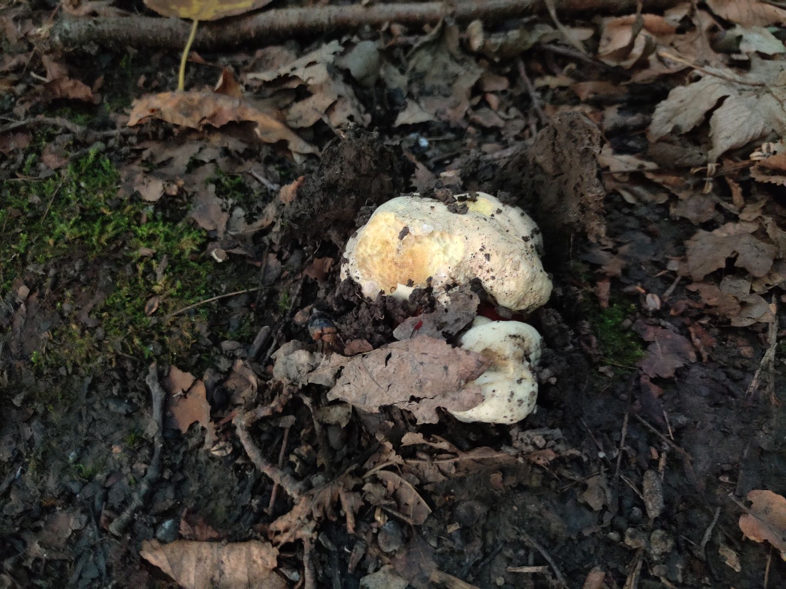 Dann kam der Kracher. In einem kleinen Eichen-dominierten Abschnitt zeigten sich Dutzende Röhrlinge am Wegesrand, die ich zunächst nicht zuordnen konnte. Nach etwas Überlegen kam dann nur noch der Satans-Röhrling (Rubroboletus satanas) in Frage. Kann das wirklich sein? Direkt vor der Haustür, so viele Exemplare und dann noch in einem Habitat, in dem ich es nie erwartet hätte? Was meint ihr, das müsste doch schon der Satans-Röhrling sein, oder? Leider war ich auf dem Sprung und hatte überhaupt keine Zeit mir die Pilze im Detail anzusehen. Daher auch nur die paar Schnappschüsse im dämmrigen Licht. Frühestens Morgen Abend schaffe ich es wieder zum Fundort. Ich hoffe nach den kräftigen Regenfälle heute bleibt noch was übrig, gerade weil die meisten schon stark von den Schnecken mitgenommen waren, damit ich die Funde in Ruhe begutachten kann.