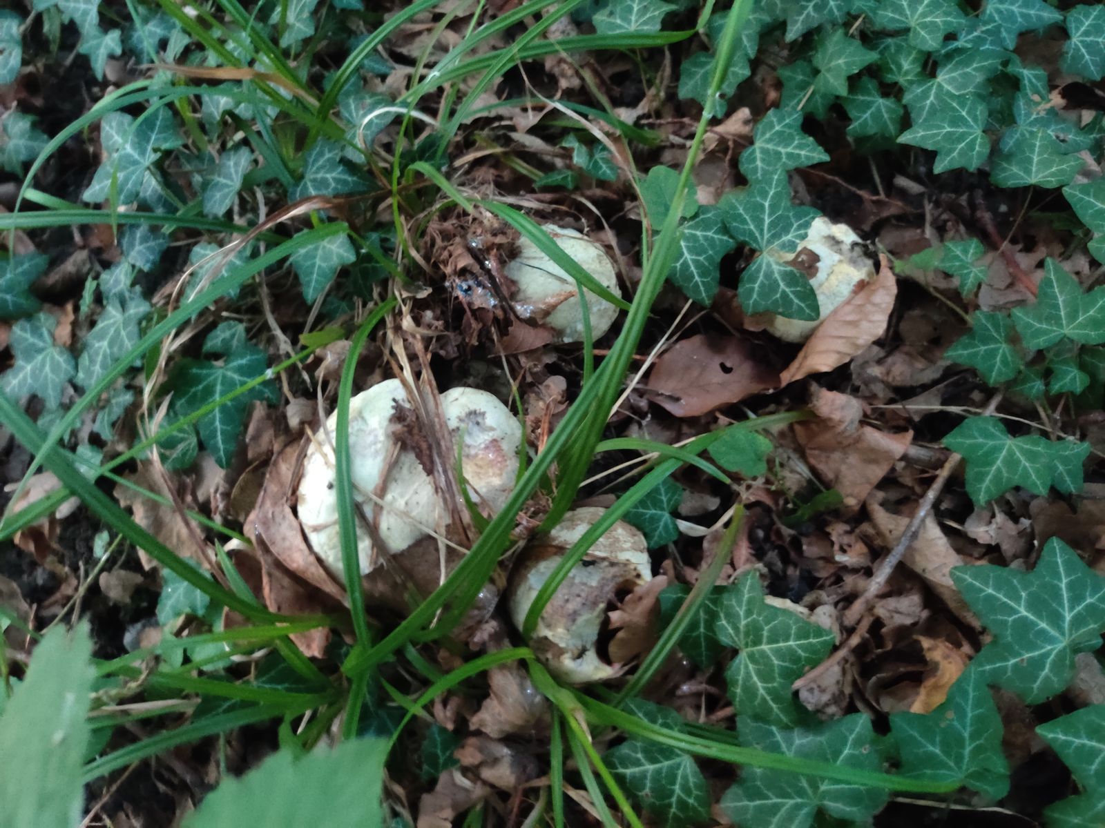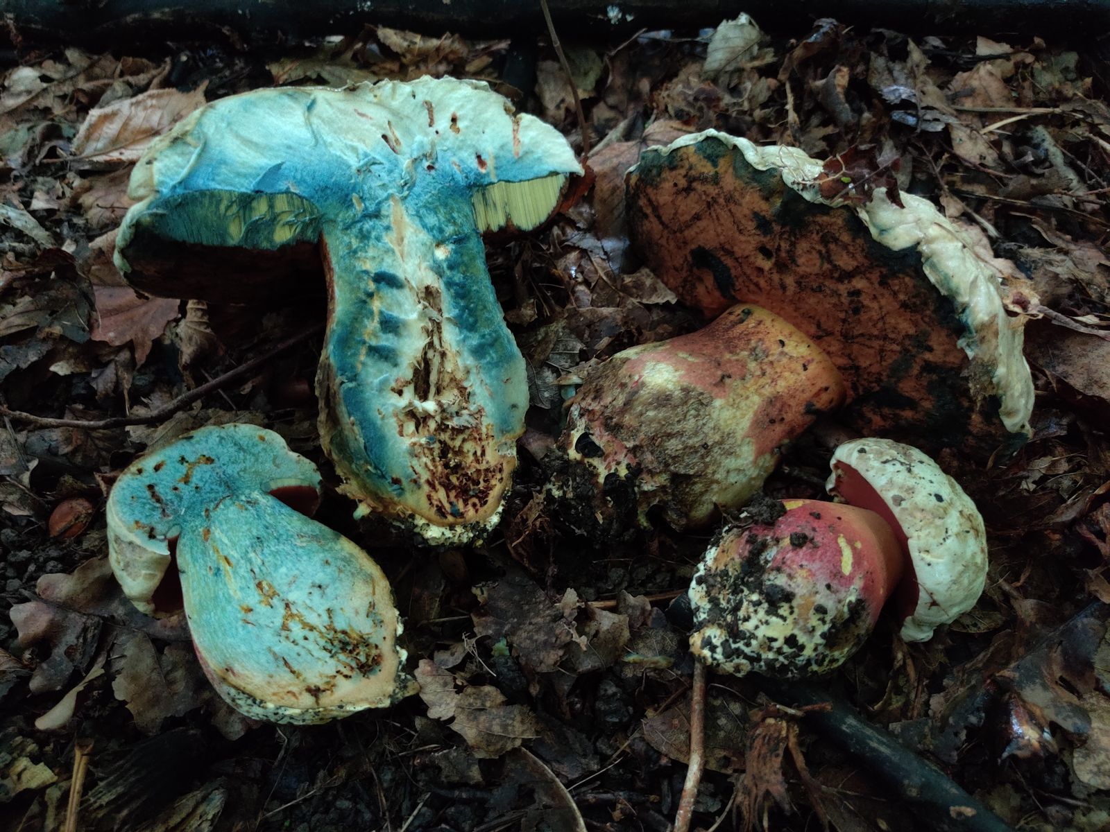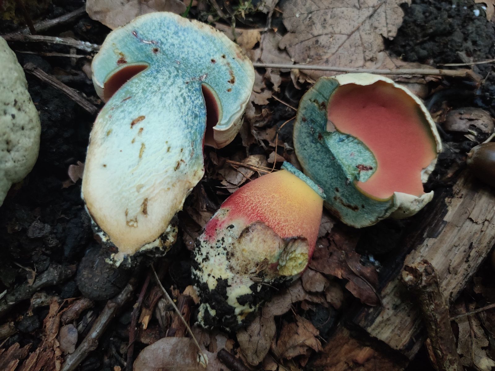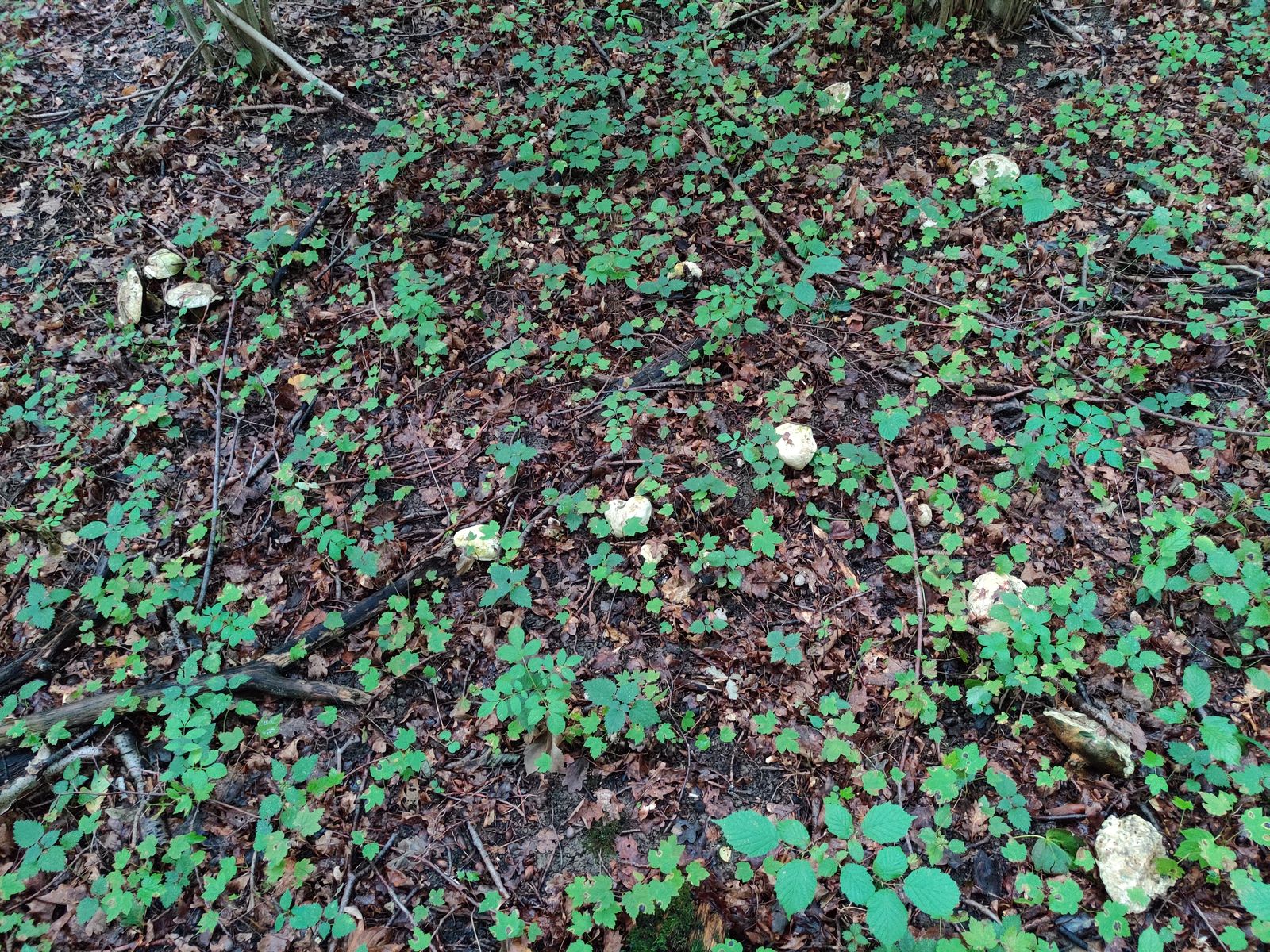 Dann kam der Kracher. In einem kleinen Eichen-dominierten Abschnitt zeigten sich Dutzende Röhrlinge am Wegesrand, die ich zunächst nicht zuordnen konnte. Nach etwas Überlegen kam dann nur noch der Satans-Röhrling (Rubroboletus satanas) in Frage. Kann das wirklich sein? Direkt vor der Haustür, so viele Exemplare und dann noch in einem Habitat, in dem ich es nie erwartet hätte? Was meint ihr, das müsste doch schon der Satans-Röhrling sein, oder? Leider war ich auf dem Sprung und hatte überhaupt keine Zeit mir die Pilze im Detail anzusehen. Daher auch nur die paar Schnappschüsse im dämmrigen Licht. Frühestens Morgen Abend schaffe ich es wieder zum Fundort. Ich hoffe nach den kräftigen Regenfälle heute bleibt noch was übrig, gerade weil die meisten schon stark von den Schnecken mitgenommen waren, damit ich die Funde in Ruhe begutachten kann.