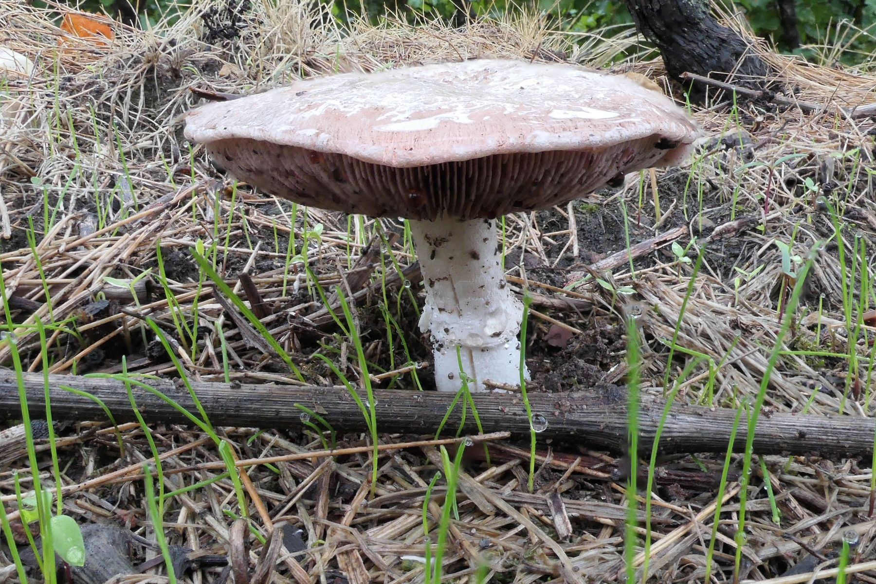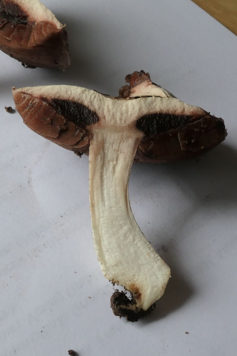Gilbt nicht, sondern rötet etwas; Rötung im Hutfleisch nach Verletzung; Stiel rötet nicht