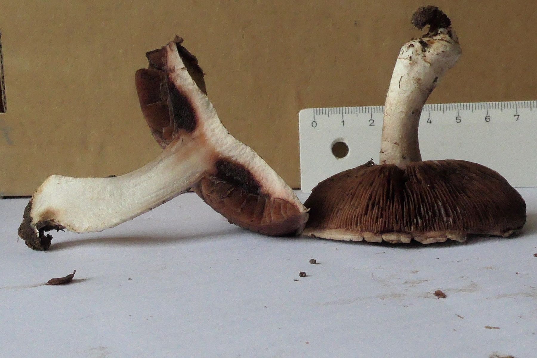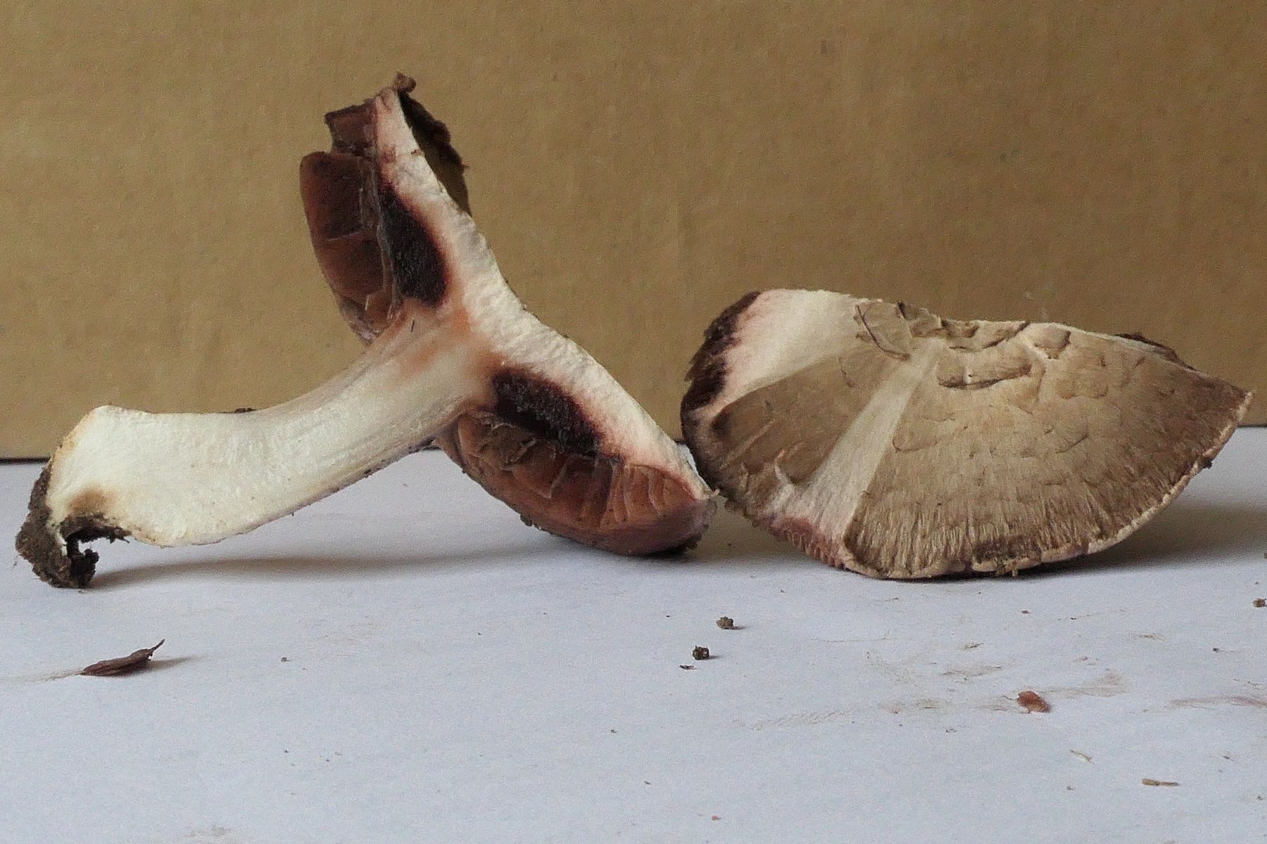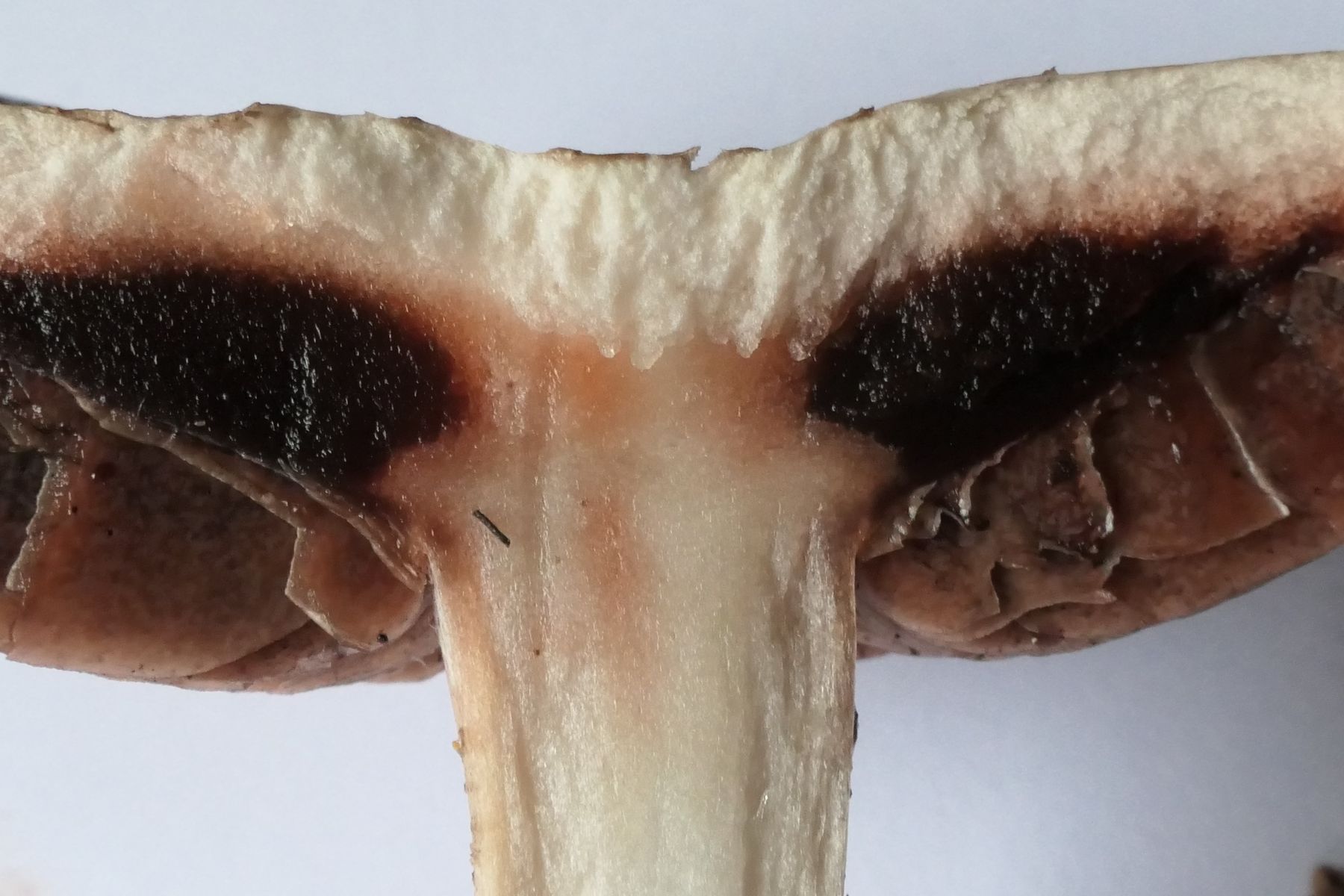 Zwischen Hutfleisch und Lamellen ein nasser, schwarzer flacher Torus; beim zweiten Pilz ist der Bereich grau