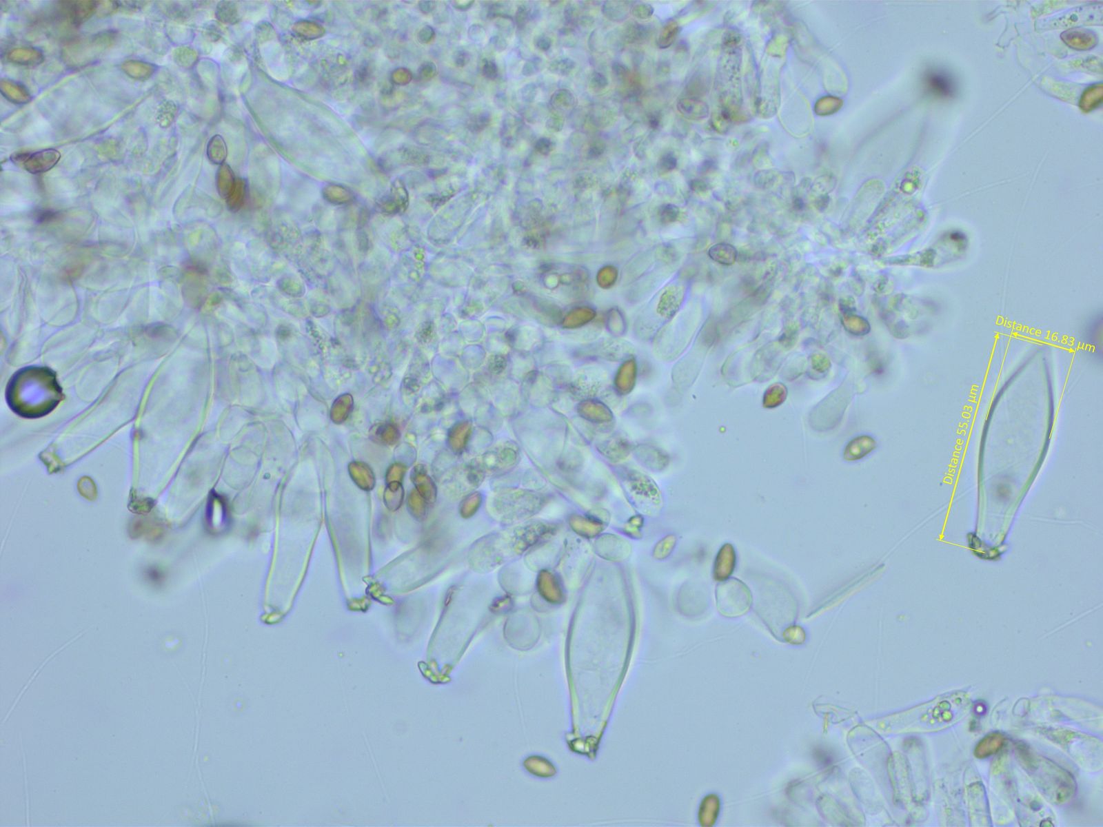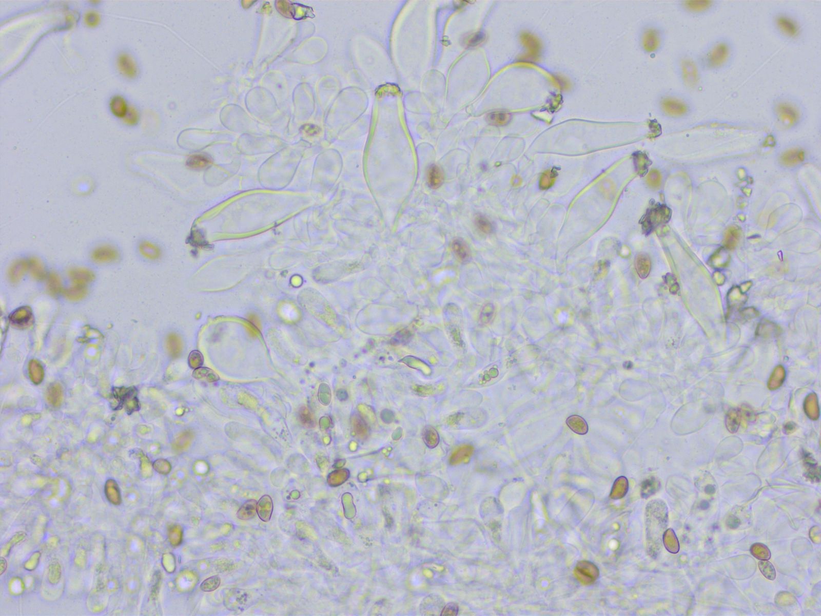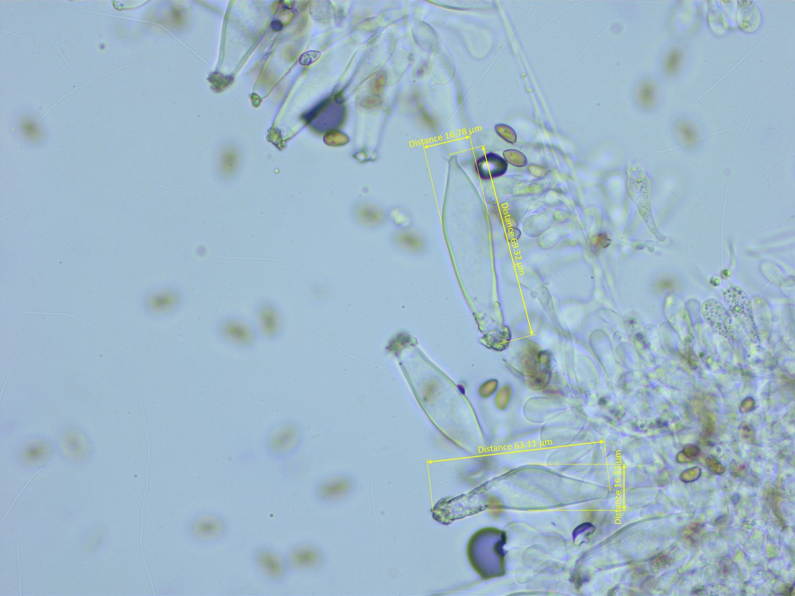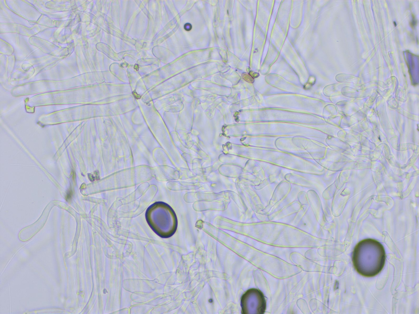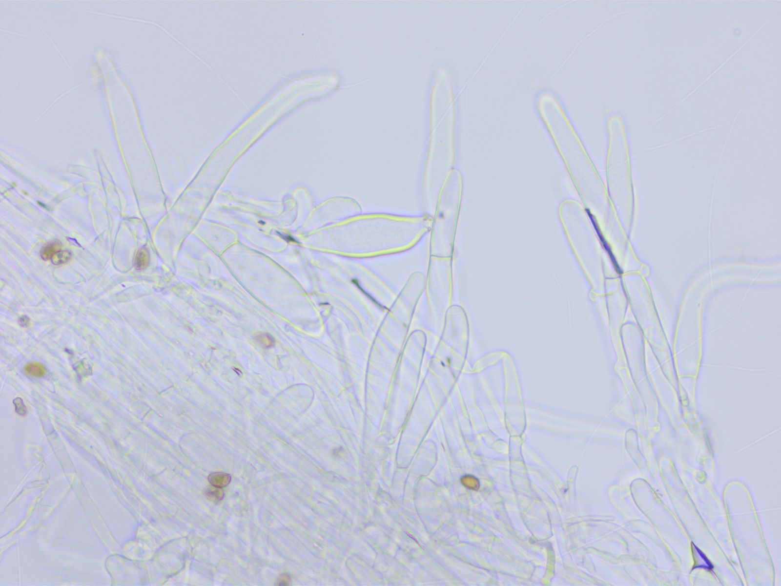 Kaulozystiden nur im oberen Drittel. Die meisten subzylindrisch, einige fusiform. Daneben viele keulige Parazystiden.