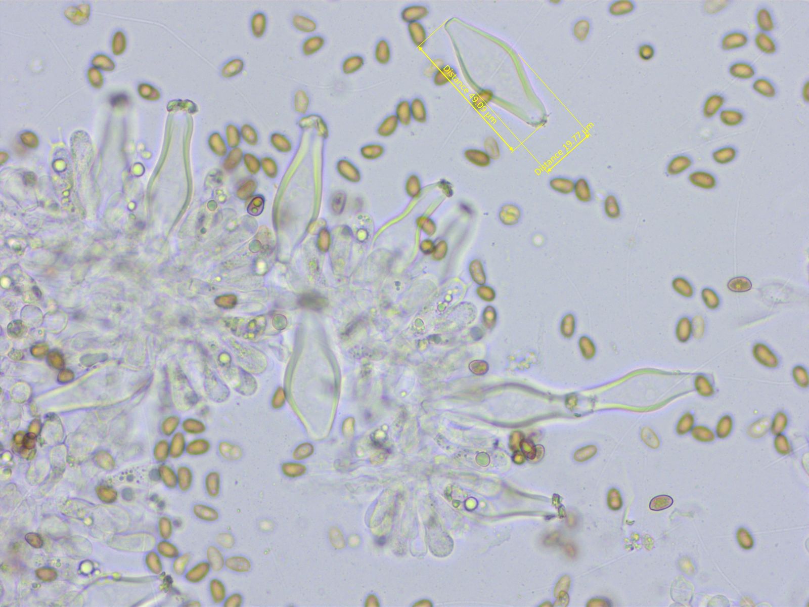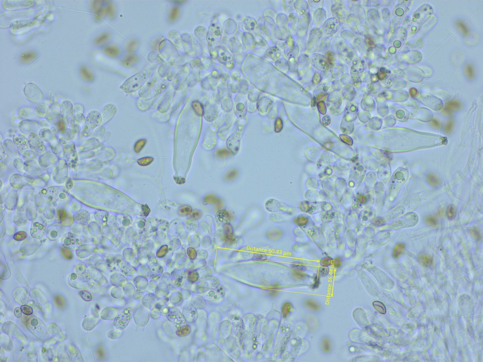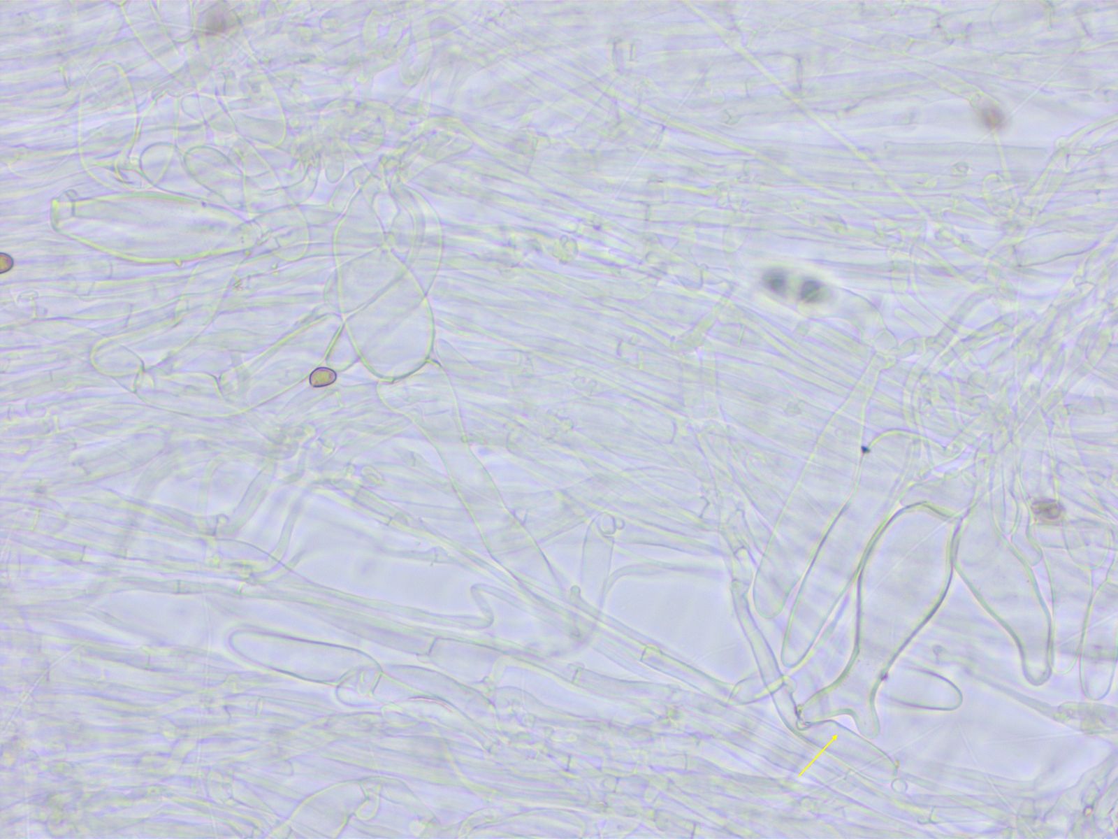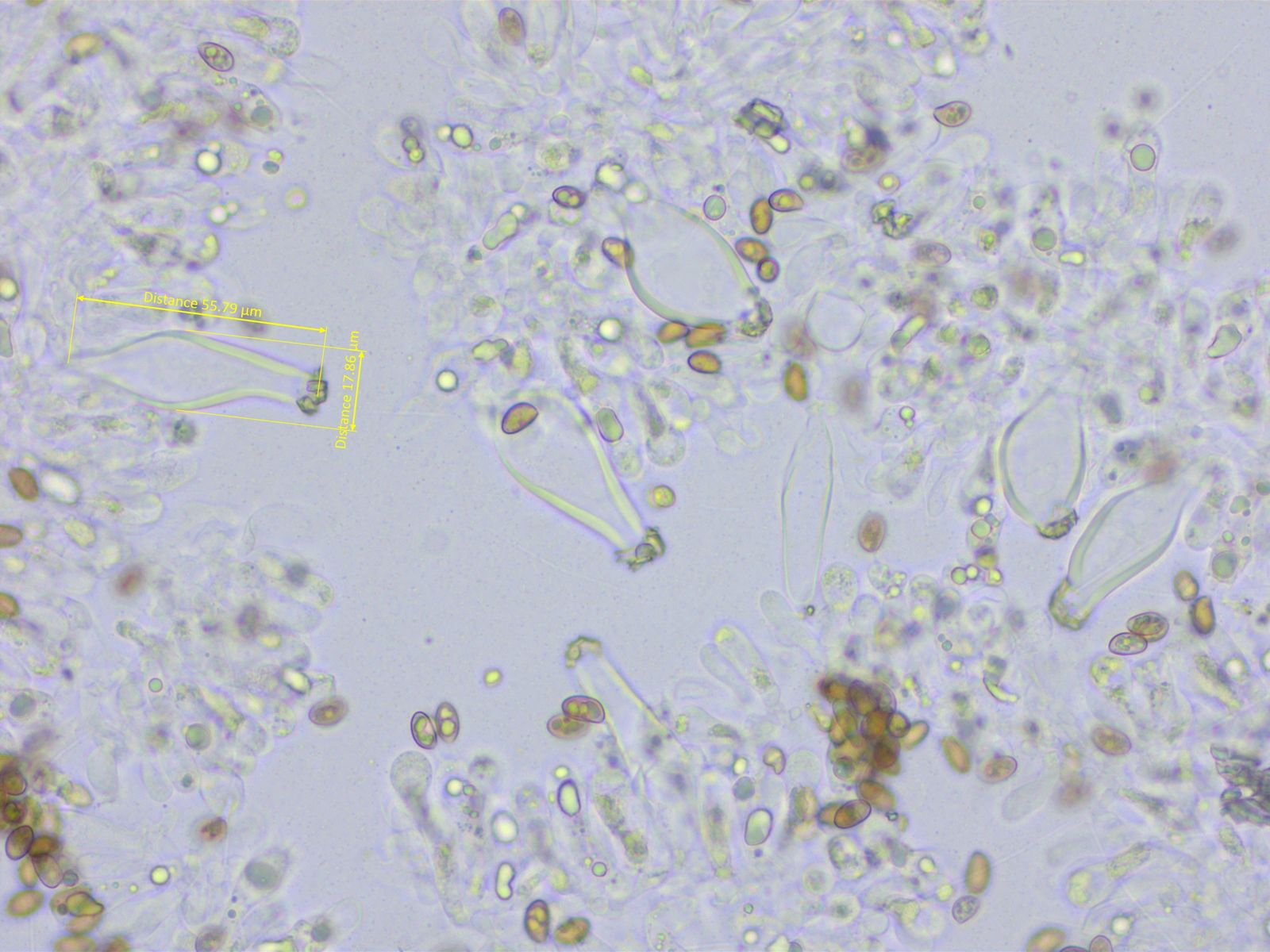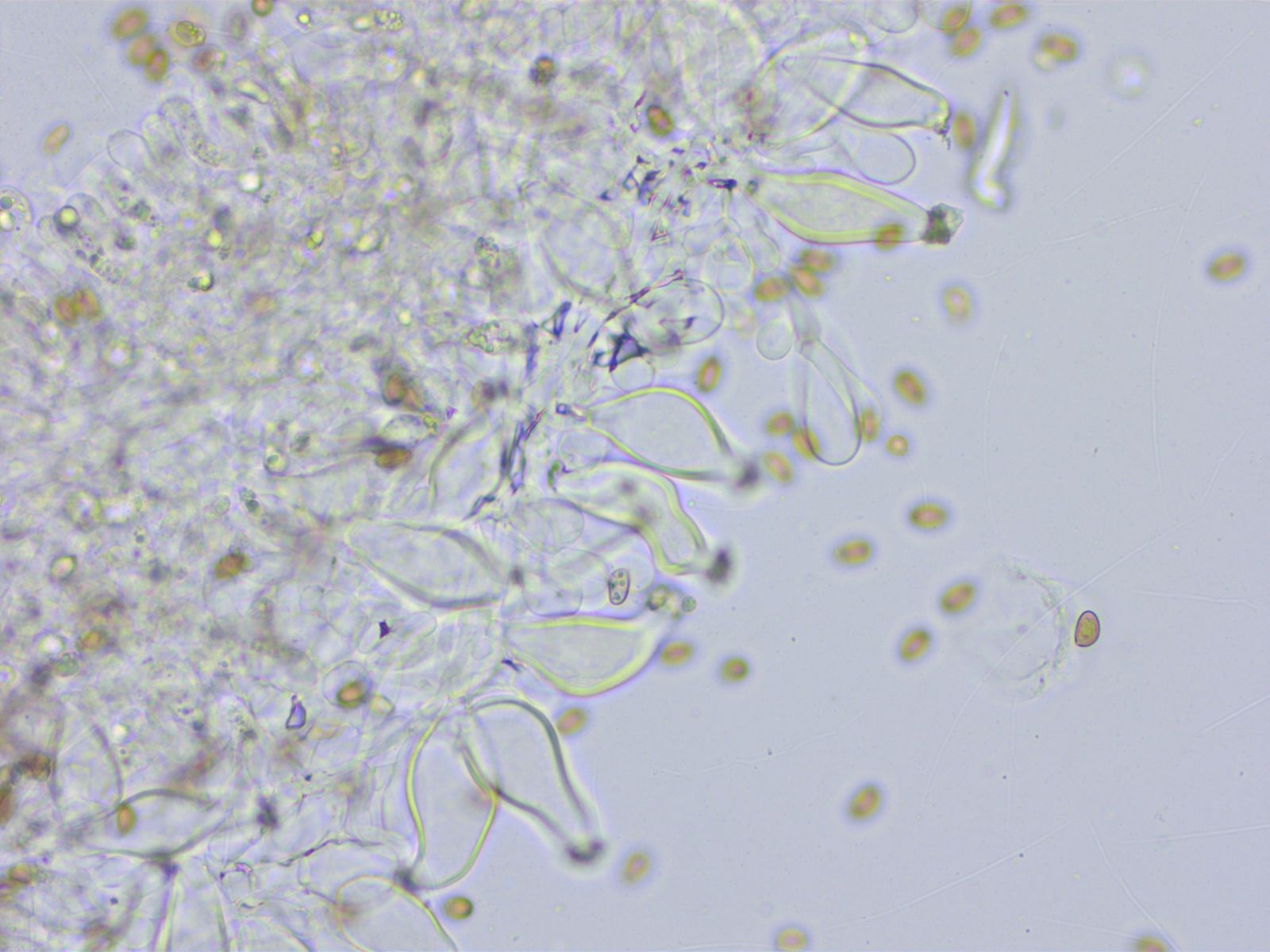 Kaulozystiden nur im oberen Drittel. Die meisten subzylindrisch, einige fusiform. Daneben viele keulige Parazystiden.