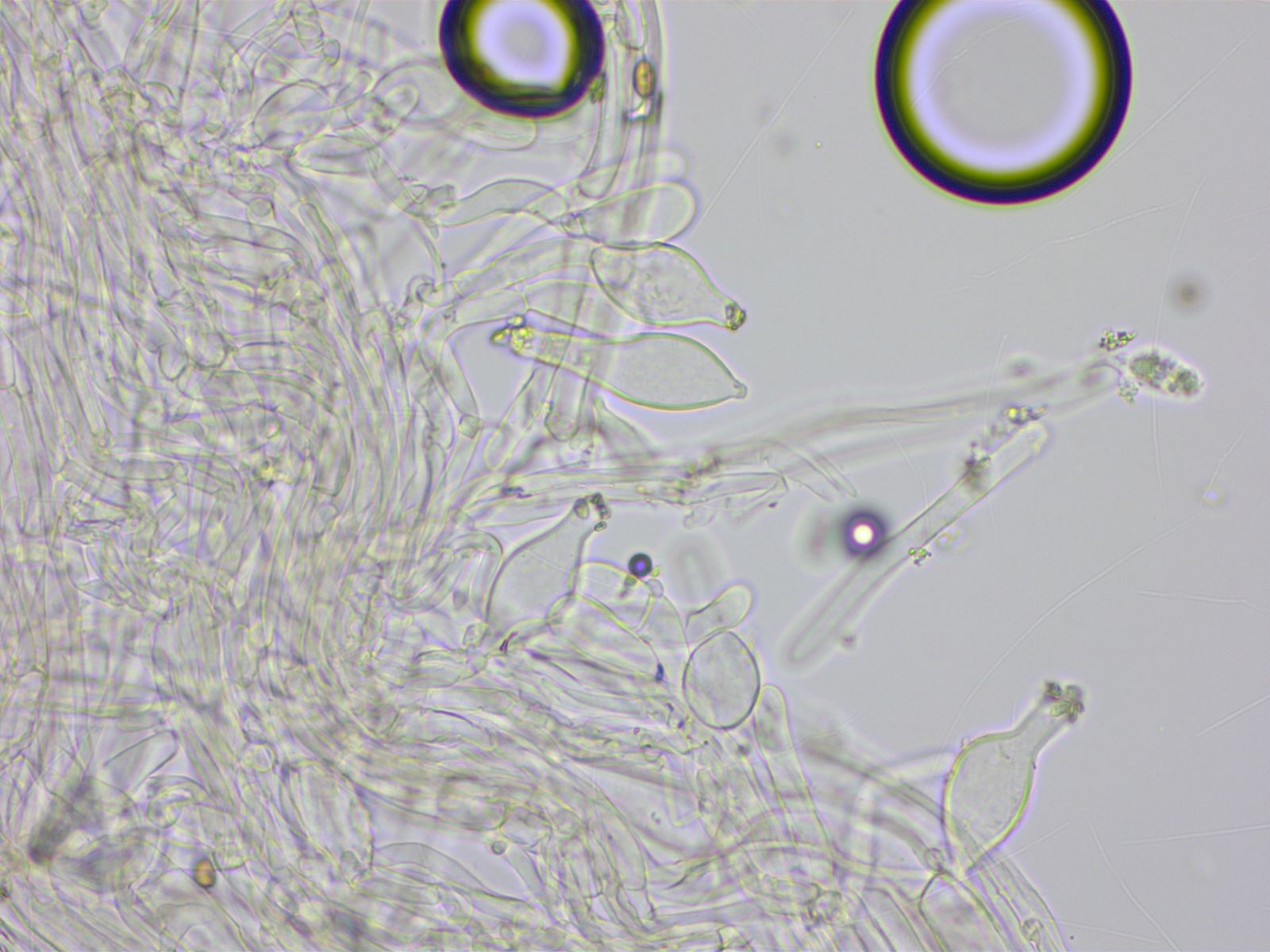 Kaulozystiden gibt es zwei verschiedene, alles nur am Apex: Wenige dickwandige, teils mit Kristallen. Und dann viele gegliederte, hyphenähnliche Elemente.