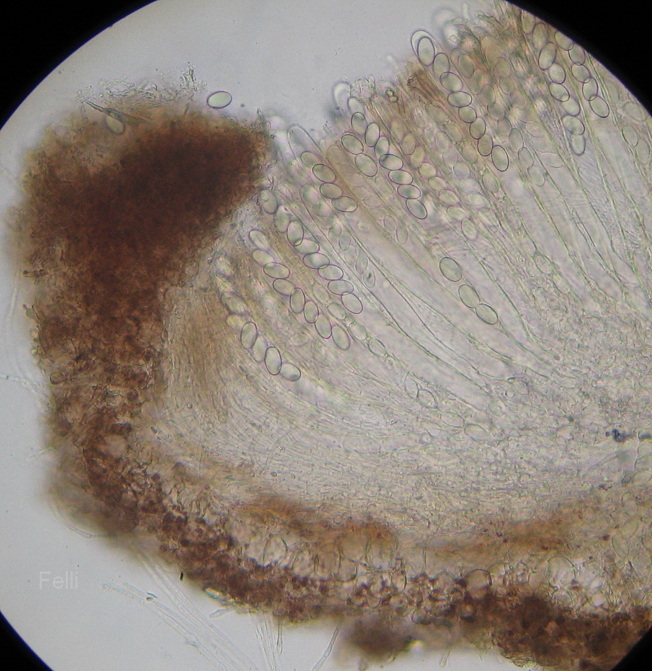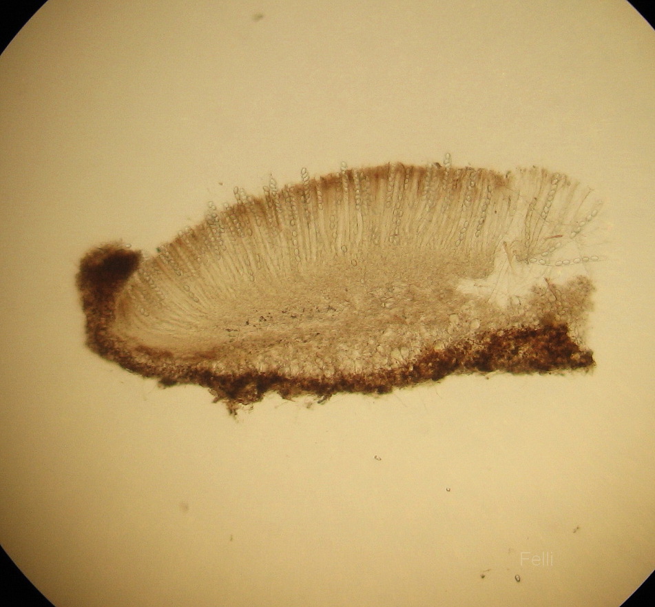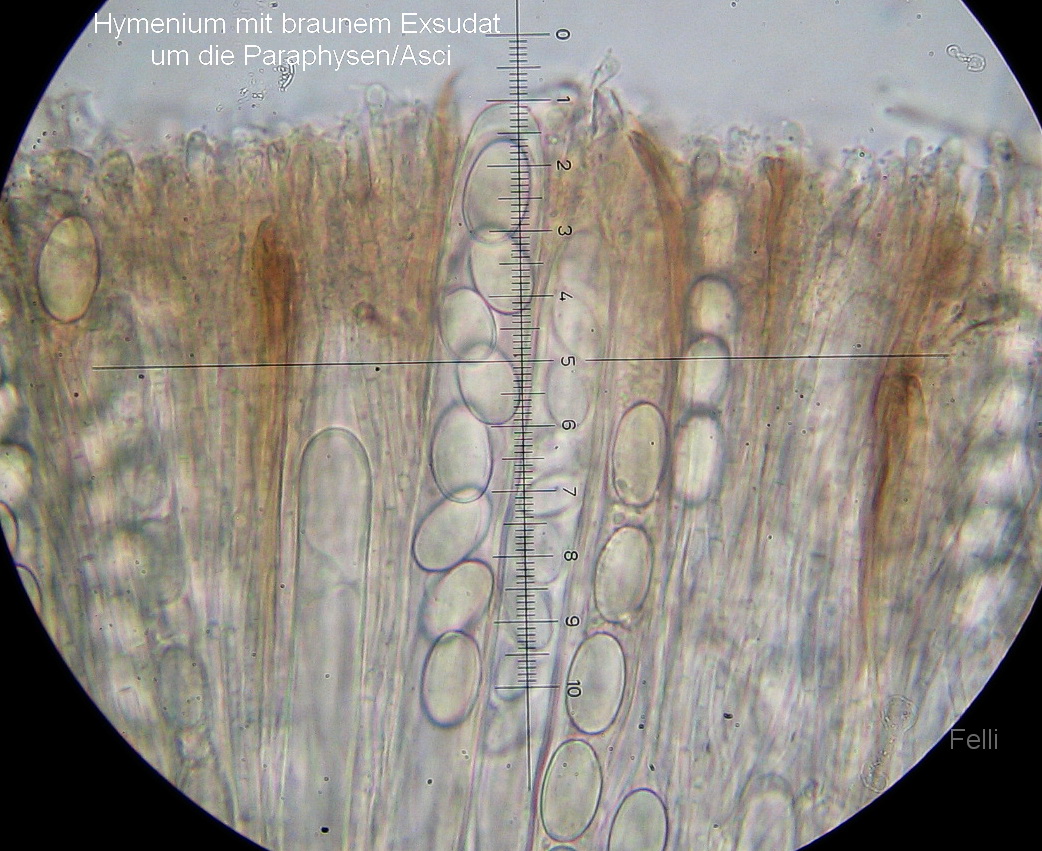Aussenseite dunkelbraun, Hymenium gelbbraun, Asci teils hervorragend/ herausstehend.