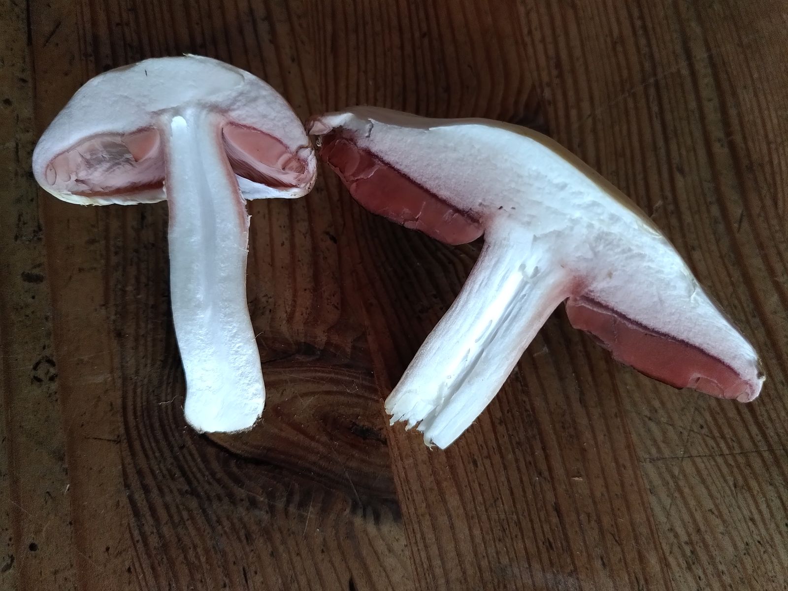 Die Lamellen sind rosa bzw bei dem einen braun (hier ist auch der Hut bräunlich, während bei den anderen weiß). Der Hut hat einen Durchmesser von 4,5-8 cm, die Haut lässt sich leicht abziehen . Ich kann bei Druckstellen o.ä. keine Farbveränderung erkennen.