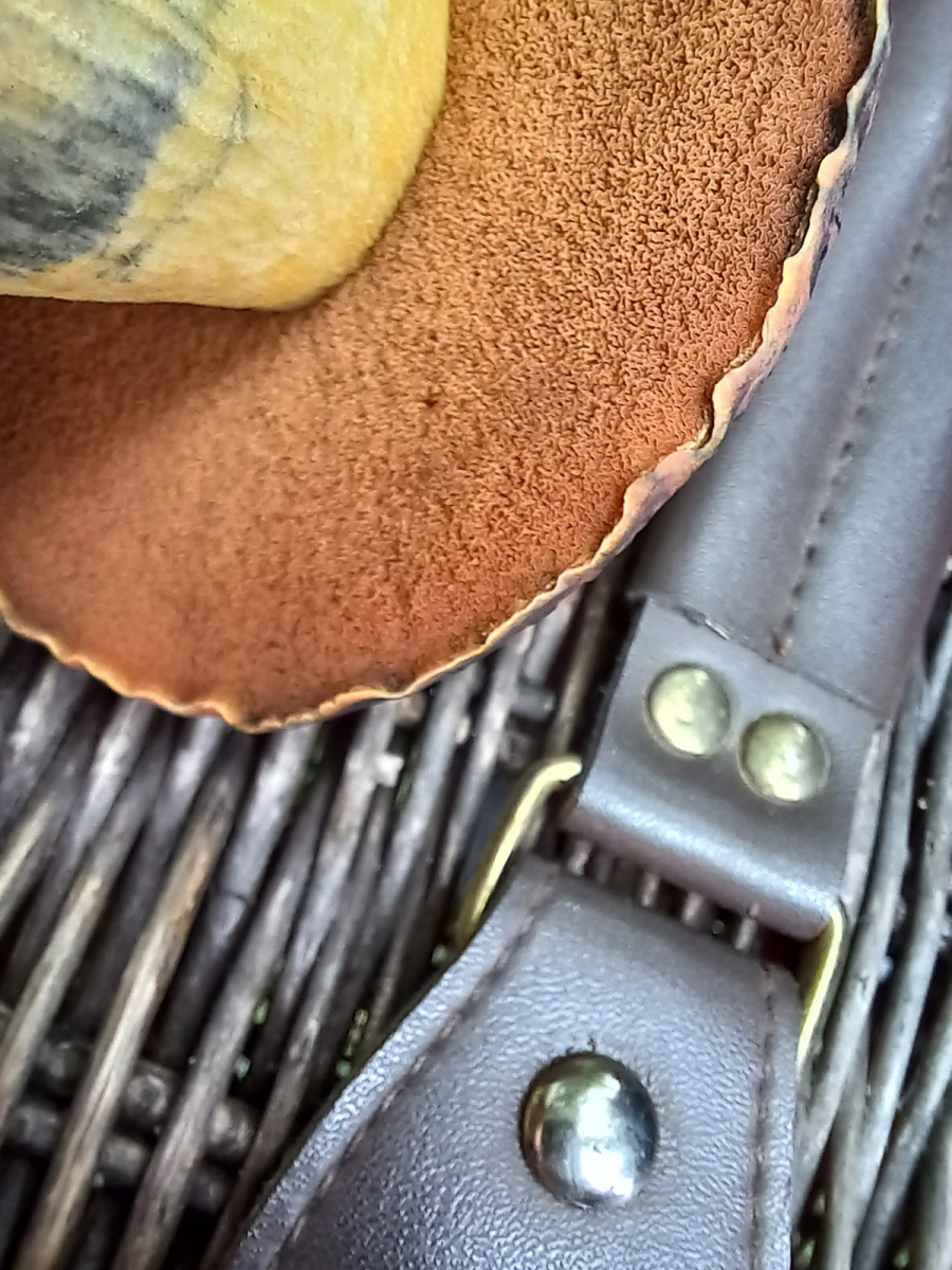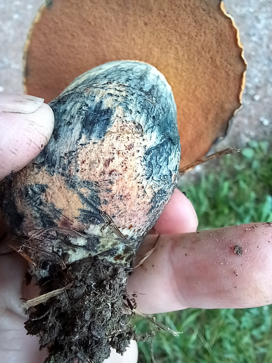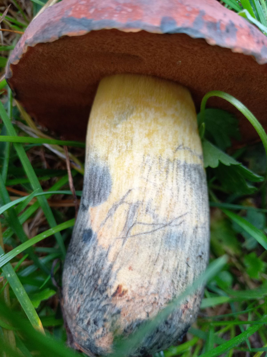 bei meinem gestrigen Waldbesuch fand ich diesen Röhrling. Er wuchs zusammen mit seinen jüngeren Geschwister am Rande einer Wiese, getrennt vom gemischten Wald (Buchen, Eichen, Lärche, Fichte) durch einen Weg.