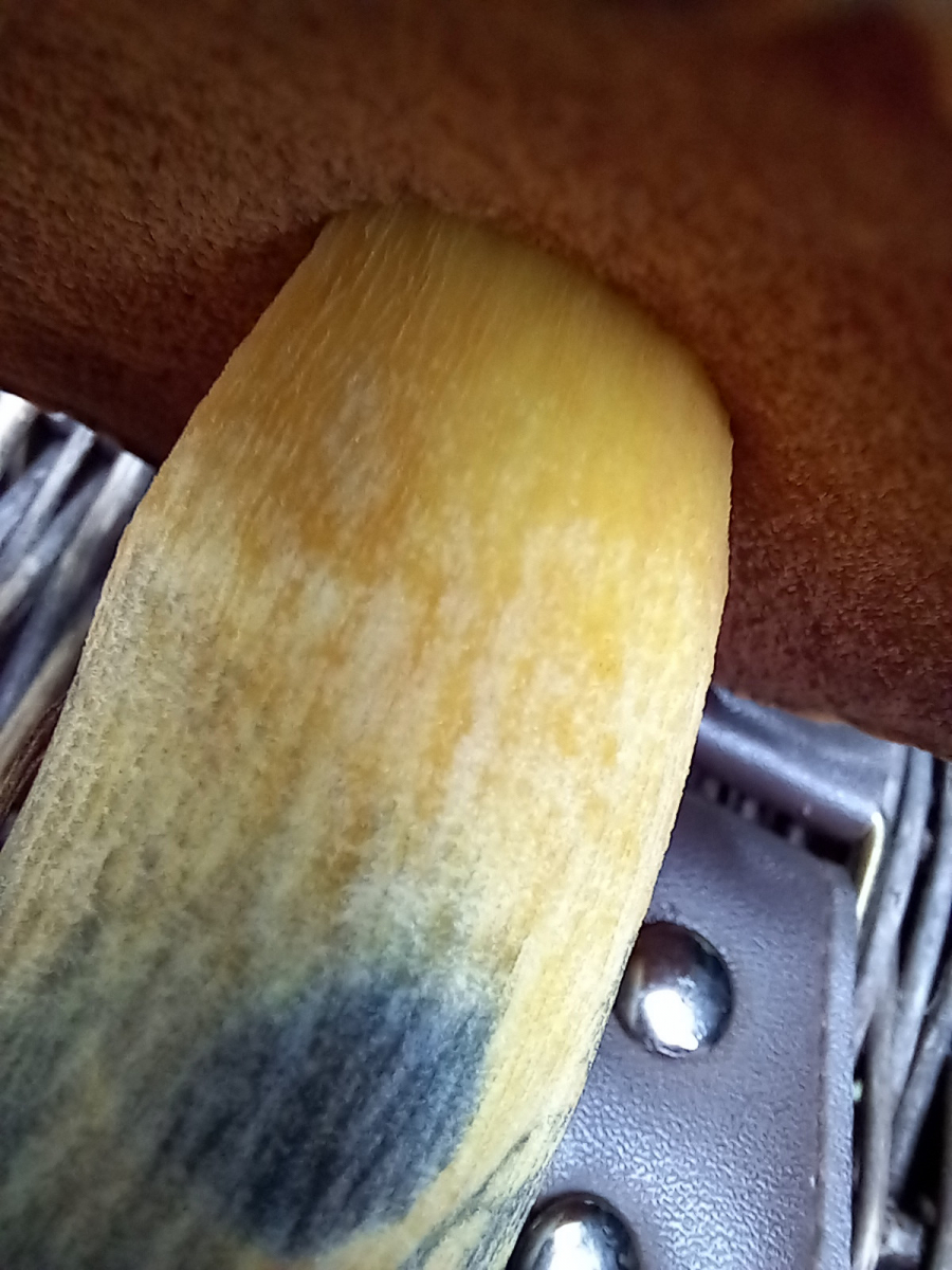 Stiel: gelb, mit gelben Flocken?, jedenfalls nicht glatt, Stielspitze richtig schön gelb, blaut, nach einiger Zeit ocker/schmutziges gelb, frisch aufgeschnitten gelbes Fleisch, Gesamthöhe Pilz ca. 12 cm