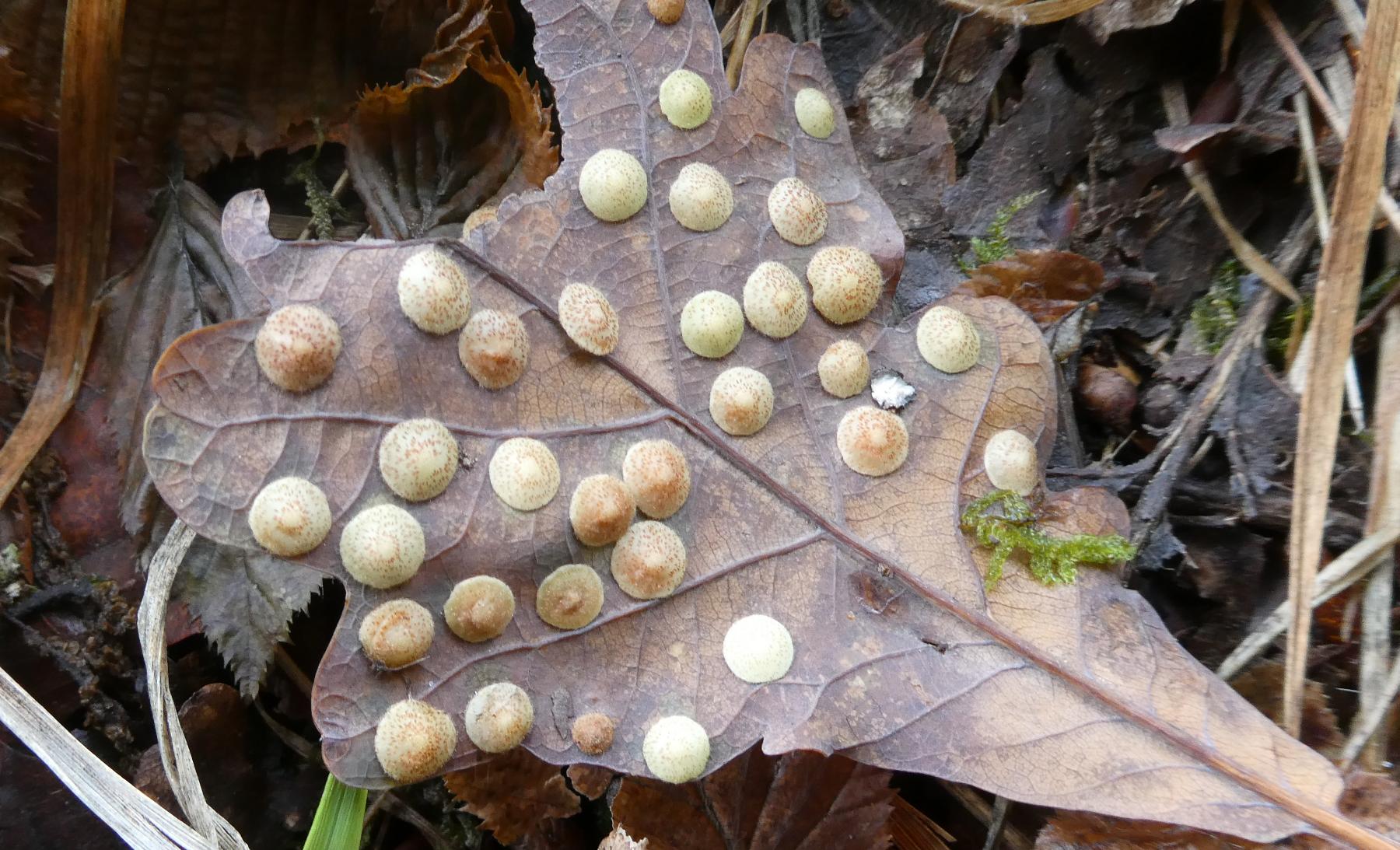 Nebenbei : kann jemand von euch diese kleinen Gallen unter Eichenblättern festmachen ?