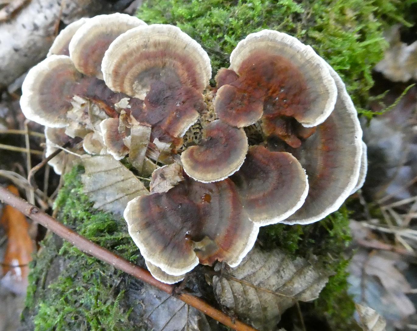 Wie es sich gehört an Kirsche kommen diese jungen dreifarbigen Trameten Daedaleopsis tricolor :