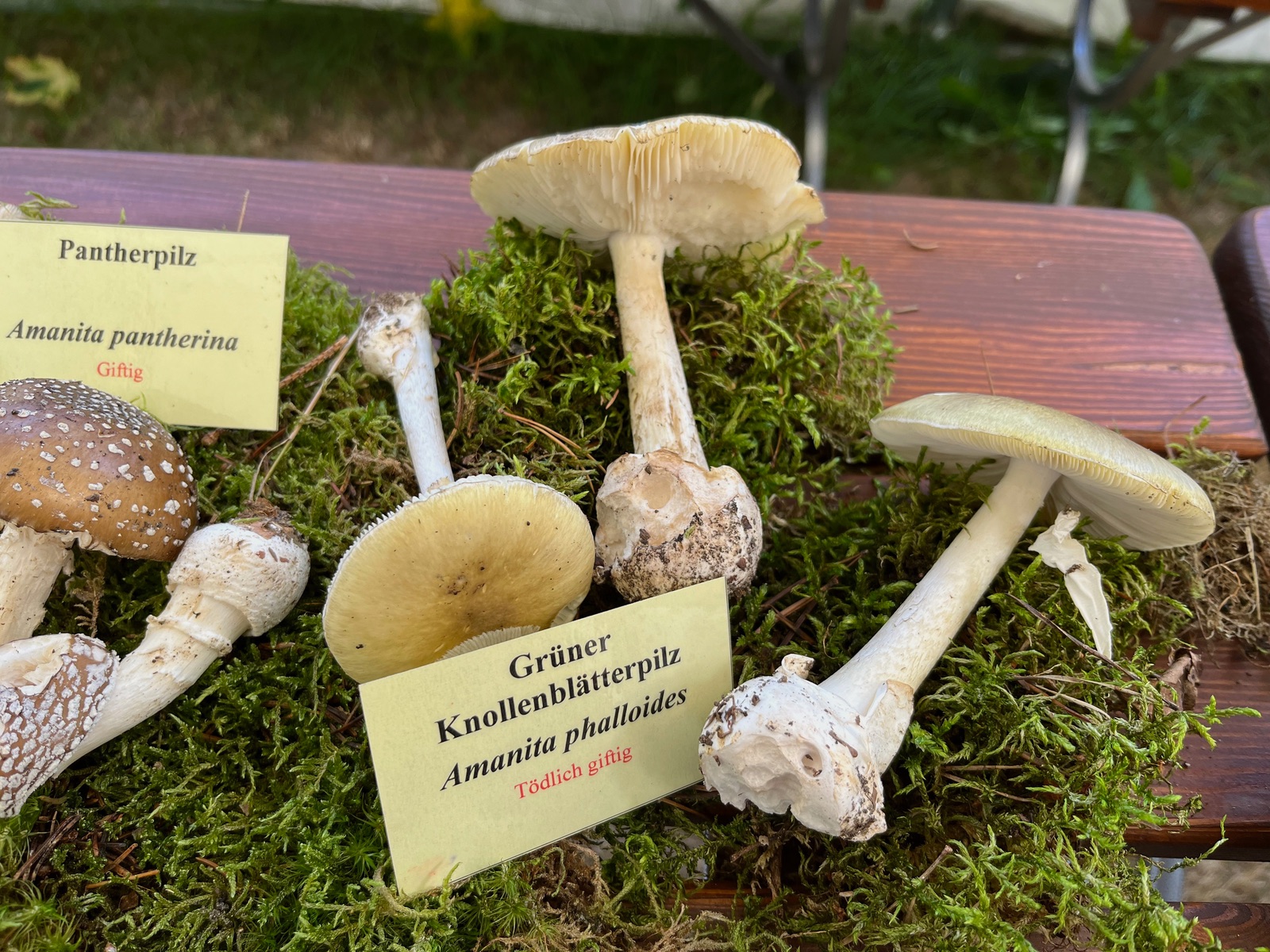 Im Vorfeld hatte sich abgezeichnet, dass dies ein Jahr der Champignons werden wird. Viele Leute kamen mit Champignons zur Bestimmung. Wir haben 7 Arten zeigen können. Wiesenchampignoons, Waldchamignons, Karbolegerlinge und Stadtchempignons. 3 Arten blieben unbestimmt. Blöderweise ist genau das Fotovon den Champignonarten nichts geworden. Lediglich das Foto einer übelriechenden Art, die aus einer scheinbar anliegenden Volva wächst, ist gelungen. Zum Recherchieren bin ich noch nicht gekommen, aber vielleicht hat jemand von euch zweckdienliche Hinweise.