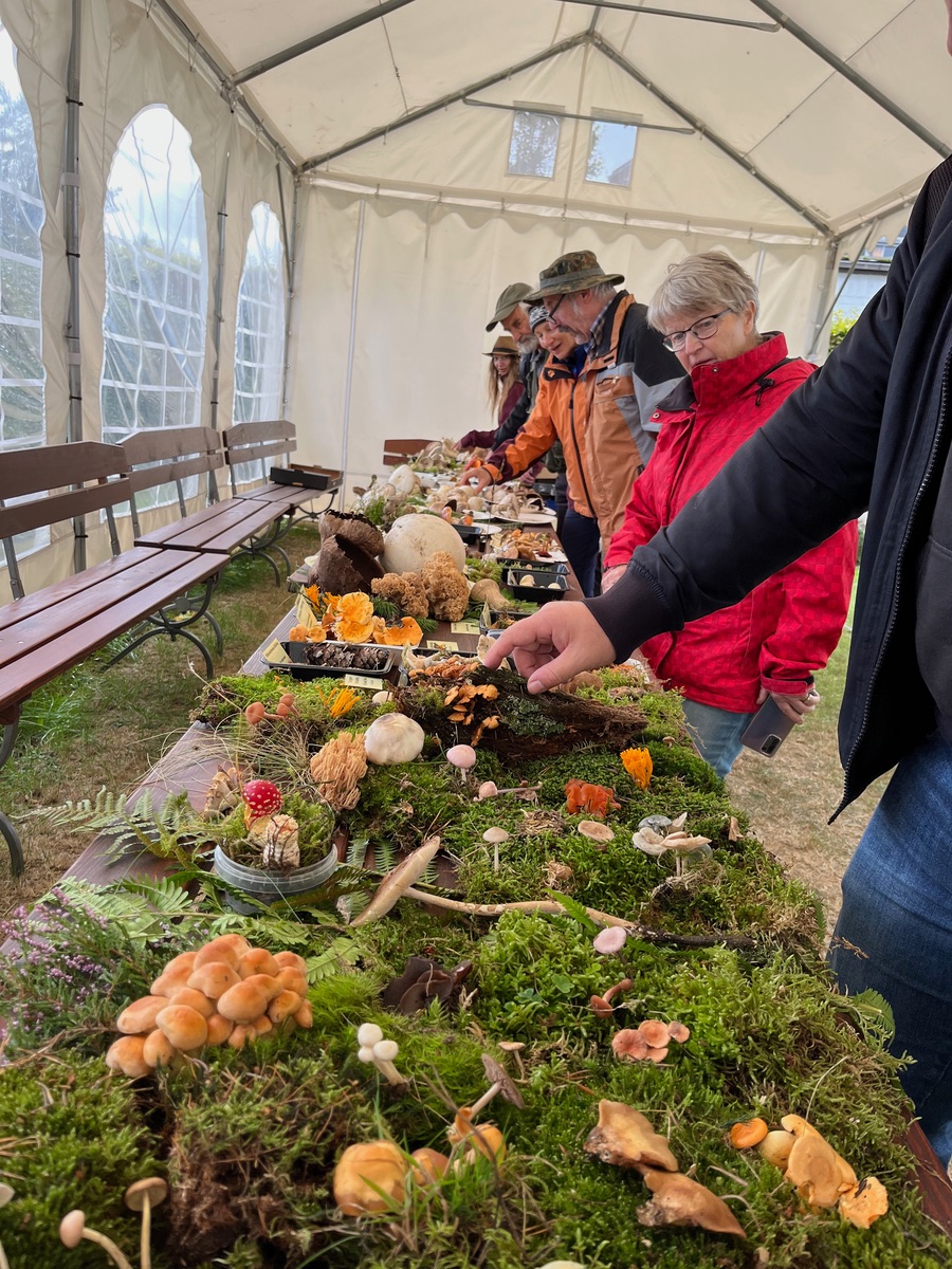 Das Wetter heute war toll für Pilze aber blöd für Pilzausstellungen: Aprilwetter, früh 7 Grad, Schauer, Graupel und stürmisch. Richtig warm wurde es nicht. Demzufolge haben auch weniger Besucherinnen und Besucher zu uns gefunden als sonst. Aber ungefähr 250 waren es dennoch. Guter Schnitt- für jeden Besucher etwas mehr als eine Pilzart. ![]()