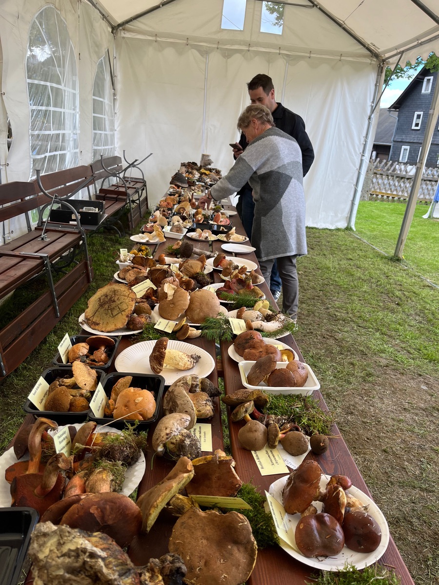 heute fand sie nun statt. Die erste Pilzausstellung des Landkreises Saalfeld - Rudolstadt, von der wir vor 2 Wochen noch nicht wussten, ob sie ü berhaupt stattfinden kann. Aber nach dem Regen kamen die ersehnten Pilze. Und um es vorweg zum nehmen, wir konnten ca. 260 Arten zeigen. Dabei gab es regional ein sehr unterschiedliches Pilzaufkommen. Ich konnte es auch in meinem Mikrokosmos beobachten. Es gibt so gut wie nichts an den üblichen verdächtigen Orten im montanen Fichtenwald. Aber auf feuchten Wegen, an Waldrändern an Bachläufen und in Mischwäldern ist schon Einiges zu entdecken. Ich habe zwei Tage gesucht und bin auf ca. 80 Arten gekommen.