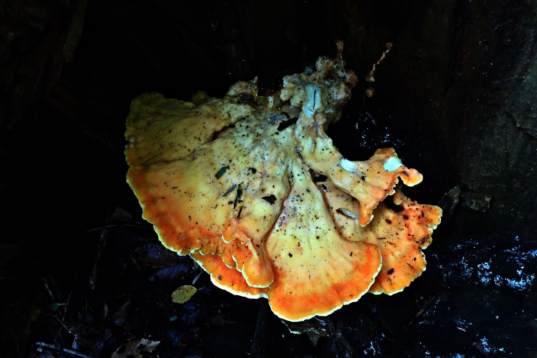 5. PIlze am Gölmbach. Ein später Schwefelporling in einer Baumhöhle und Helmlinge, wohl Mycena haematopus.